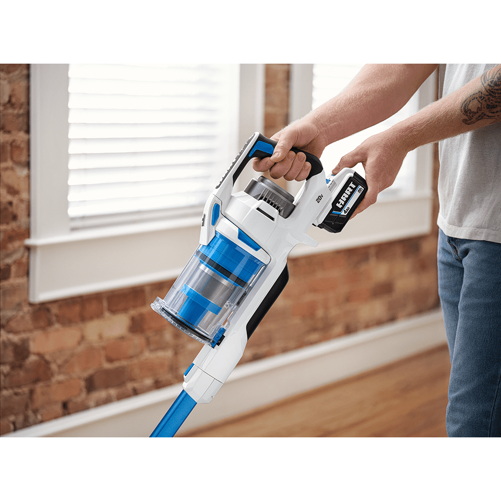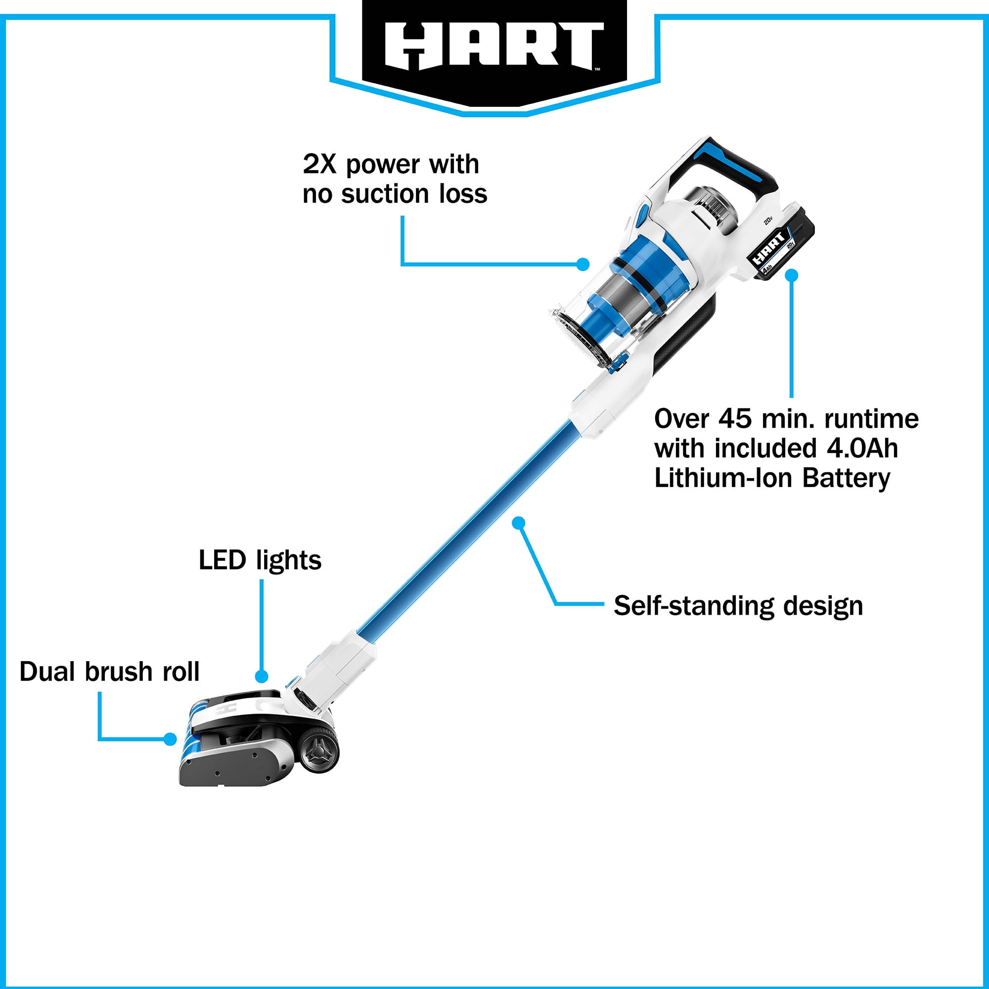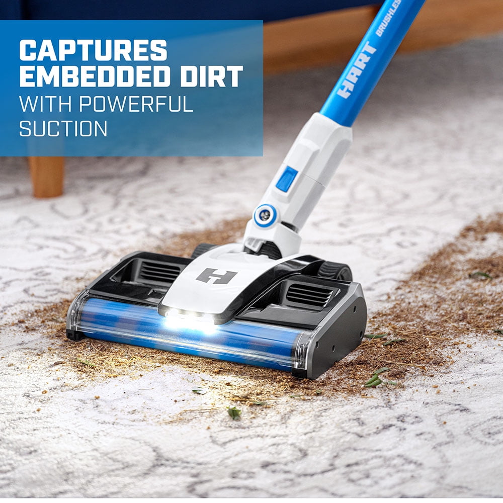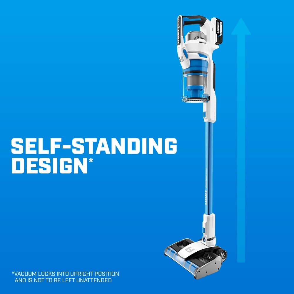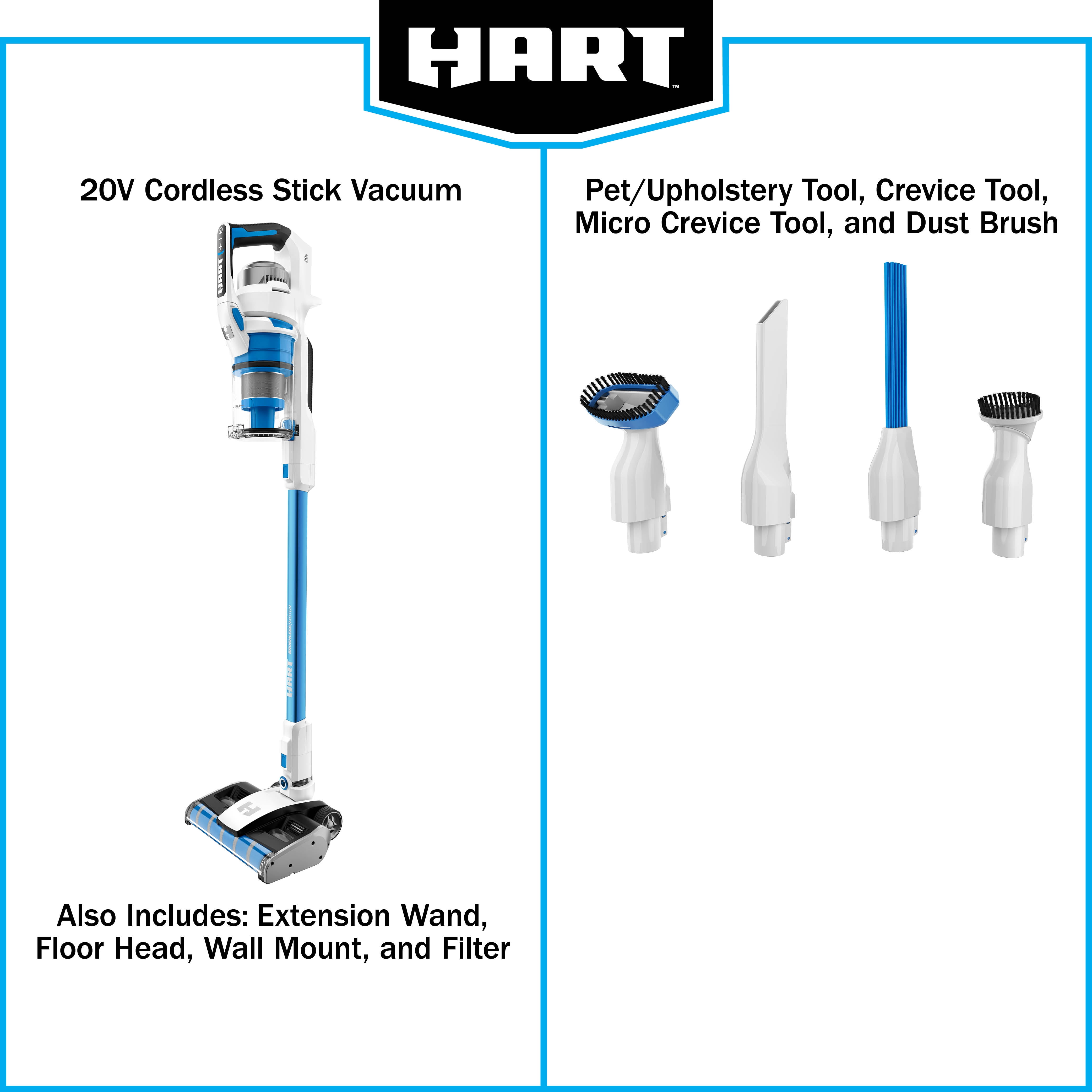 HART 20V Cordless Vacuum Cleaner – Cyclonic Technology Dual Brush Roll provides superior cleaning performance across all floor types 2X power ensures effective cleaning with no suction loss Self-standing design allows for convenient and easy storage Over 45 minutes of runtime with a 4.0Ah Lithium-ion battery (sold separately) Cordless stick vacuum with Brushless Motor Technology works efficiently on all surfaces from floor to ceiling