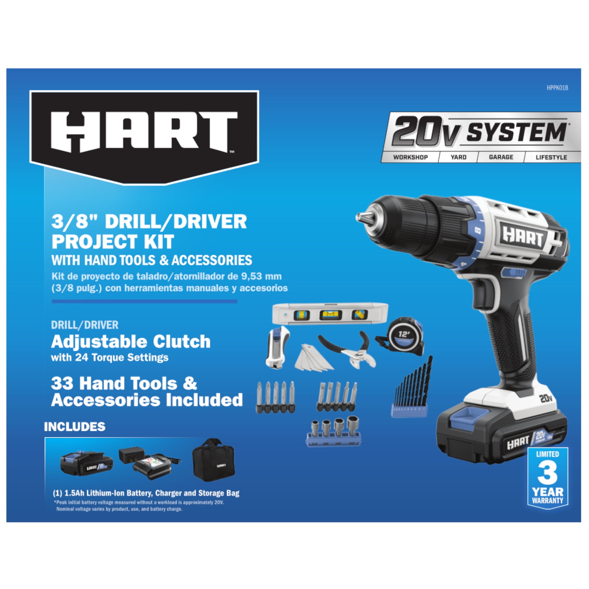 HART 20V Hybrid String Trimmer/Blower Combo Kit, 20V Battery Powered Leaf Blower & Vacuum Ideal starter kit for DIY enthusiasts with essential tools for home projects Includes 3/8-inch project kit with 10 drill bits, 10 driving bits, slide knife with 5 replacement blades, slip joint pliers, 12 ft. tape measure, torpedo level, 4 nut drivers, and 10-inch storage bag 12-inch Hybrid String Trimmer works as both trimmer and edger, perfect for hard-to-reach areas like mulch beds and gardens 20V hybrid blower with centrifugal design for focused debris removal from hard surfaces Includes HART 20V batteries for consistent power and convenience