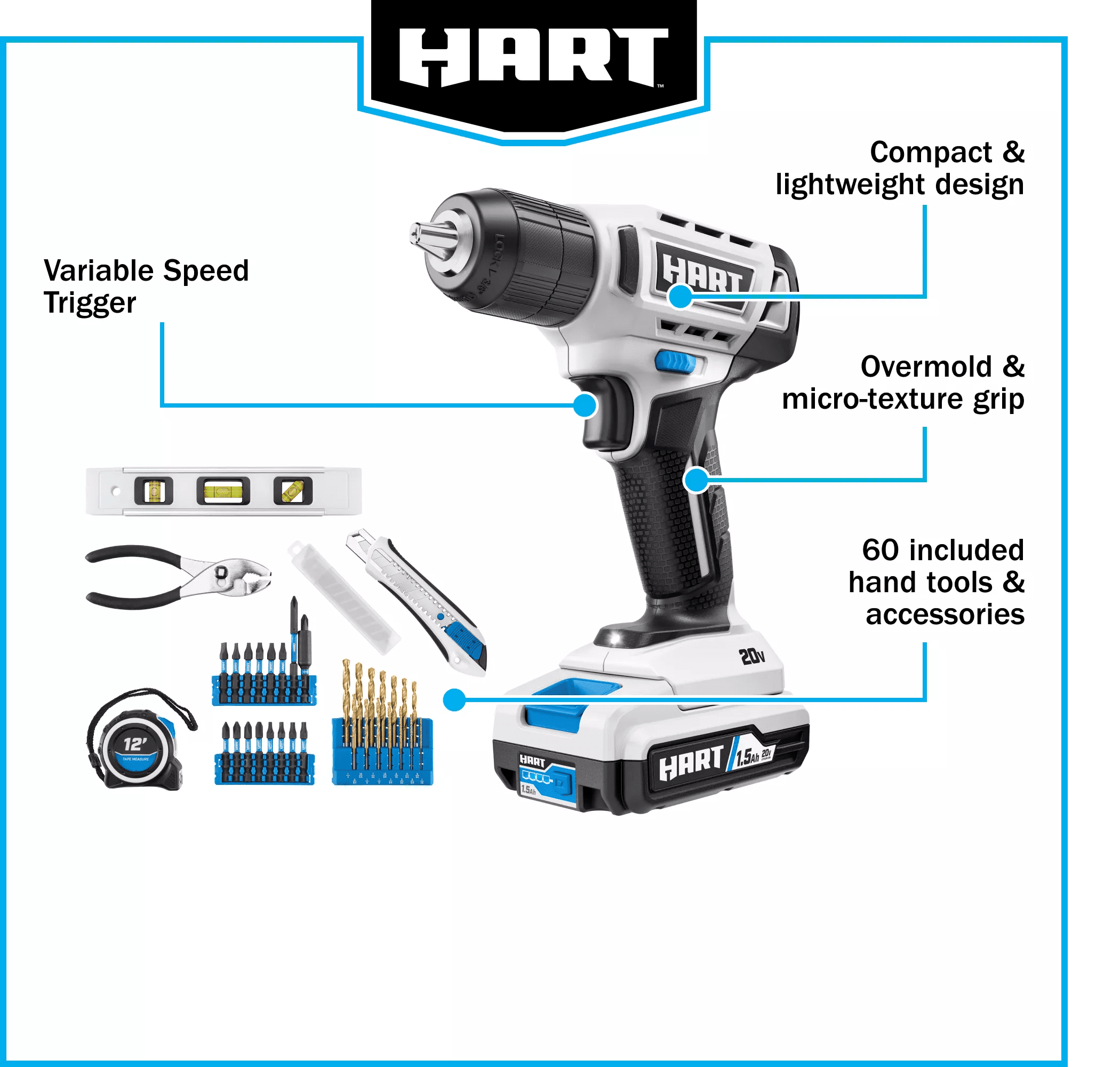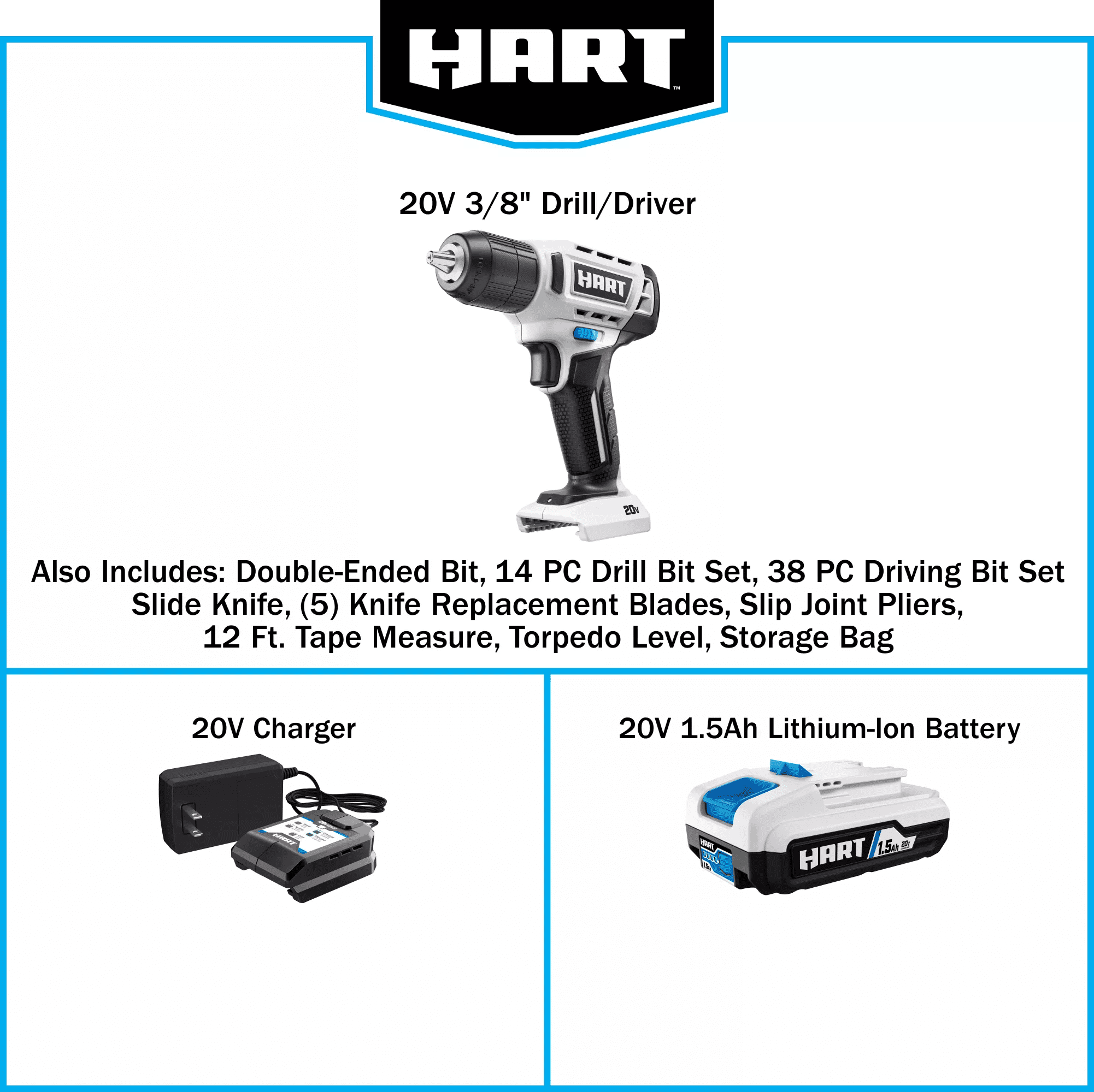 HART 20W, 20V, 1.5 Amps Lithium-Ion Power Tool Set 1.5Ah, 58 Pieces The new HART 20V 3/8” Drill/Driver delivers over 150 holes drilled per charge Variable speed trigger provides user control for precise drilling and driving Compact and lightweight design enhances portability and ease of use Enhanced comfort with over mold and macrotexture grip for better handling Includes (1) 20V 3/8″ Drill/Driver (1) 20V 1.5Ah Lithium Ion Battery (1) 20V Charger (1) 14 Pc. Drill Bit Set (1) 38 Pc. Driving Bit Set (1) Slide Knife (5) Knife Replacement Blades (1) Slip Joint Pliers (1) 12 ft. Tape Measure (1) Torpedo Level (1) Storage Bag
