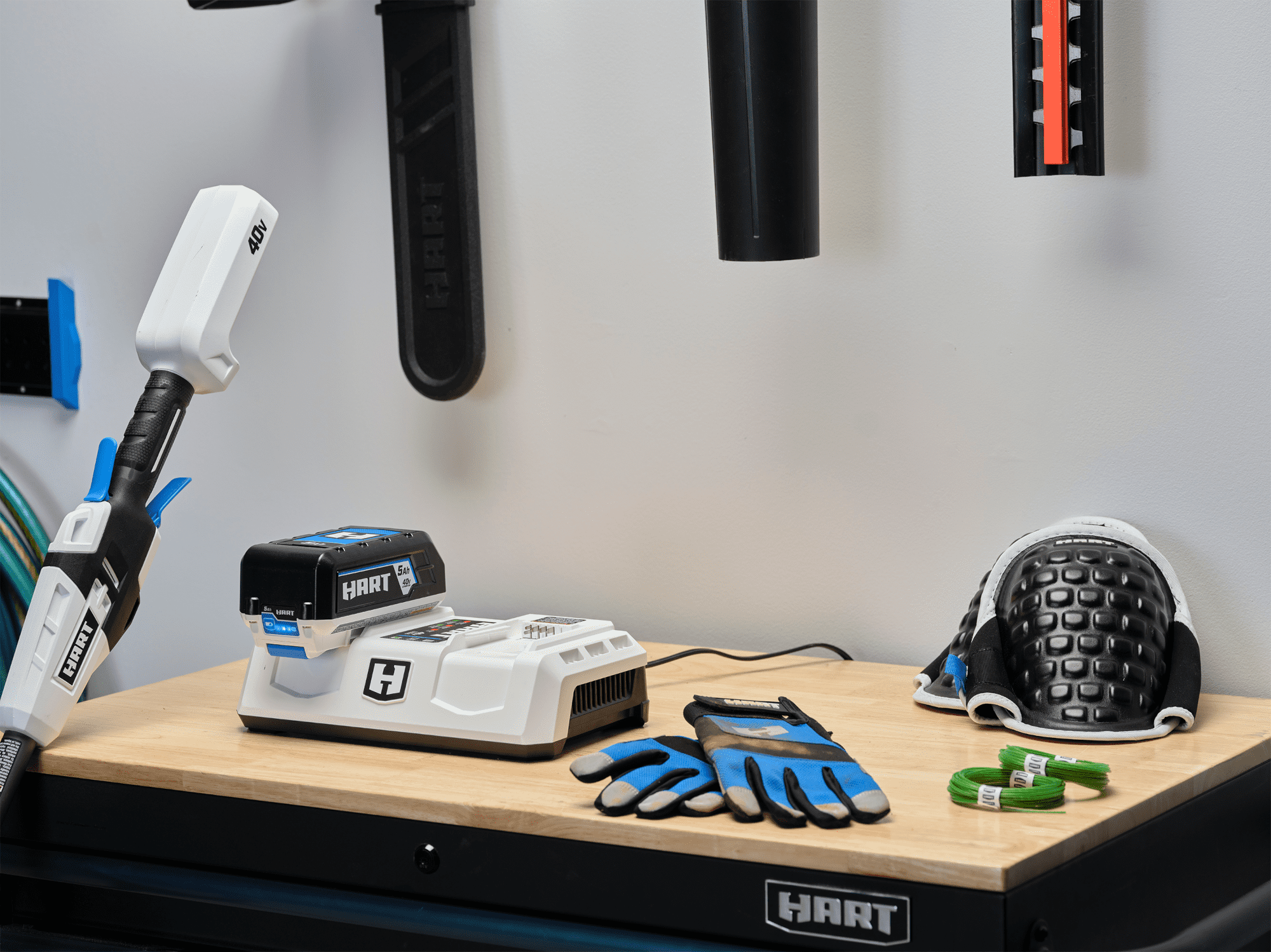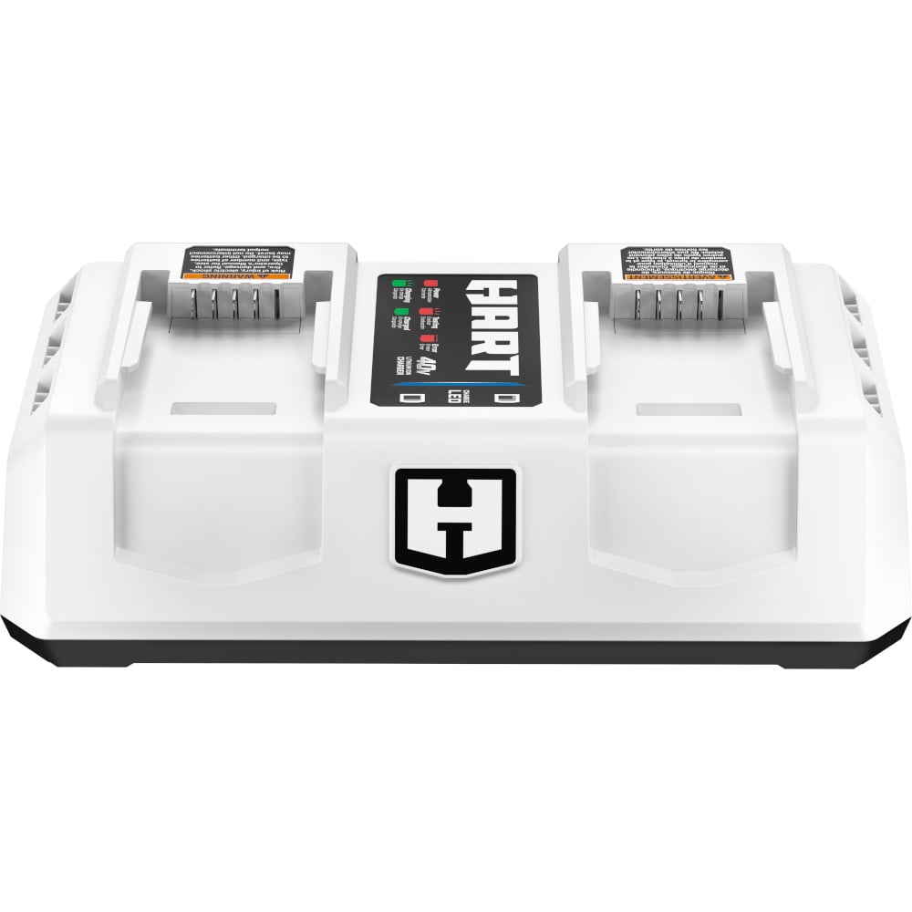 Key Features: Charges batteries 4X faster than standard charger Two batteries can be charged at once LED indicator to show charge status Wall mountable Fan cooled technology to prevent overheating Compatible with ALL HART 40V batteries 3-year limited warranty Specs: Battery: 40V Lithium-Ion Input: 120V ~ 60Hz 590W Output: 40V Weight: 3.63 LBS What’s In the Box: Dual Port Rapid Charger Operator’s Manual
