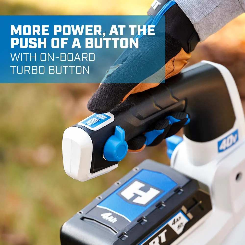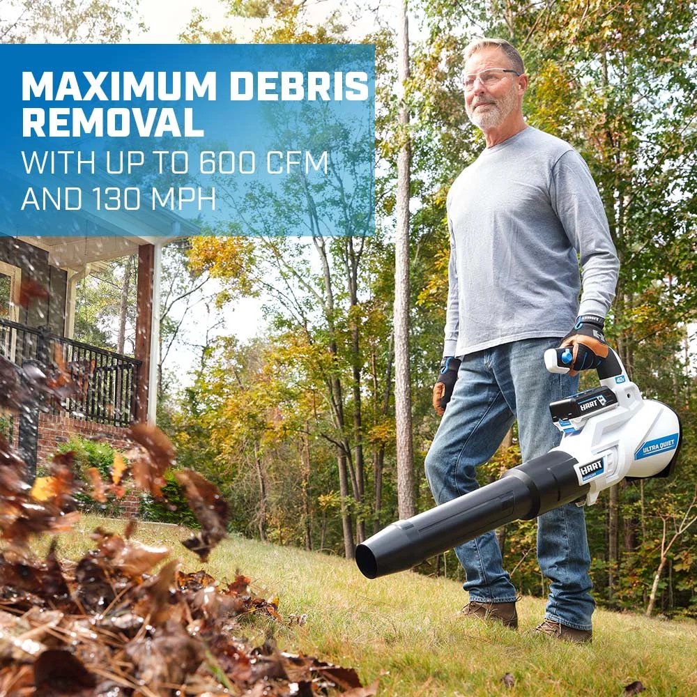 This 40V Brushless 600 CFM Leaf Blower Kit will make fall cleanup feel so new and easy. This tool not only clears stubborn materials such as wet leaves, but also lifts and moves twigs, grass clippings, and more. And it does so quickly and efficiently. The turbo fan design provides 600 CFM and 155 MPH of maximum clearing power, while the variable speed trigger gives you total control. Lightweight, compact design provides the ultimate user comfort during extended periods of use. Plus, there’s no stubborn start-up cord to deal with. Just press the turbo button for maximum clearing power. Battery power also eliminates the fumes and mess that come with gas-powered blowers. Brushless Motor Technology delivers more power, longer runtime, and longer motor life. Plus, it’s cordless, so you’re free to work anywhere without tripping over or getting tangled up in cords. Finally, the *Ultra-Quiet Technology* makes it our quietest blower to date. The included 40V 4.0Ah battery is compatible with all HART 40V tools. Disclaimer: *compared to brushed blower.