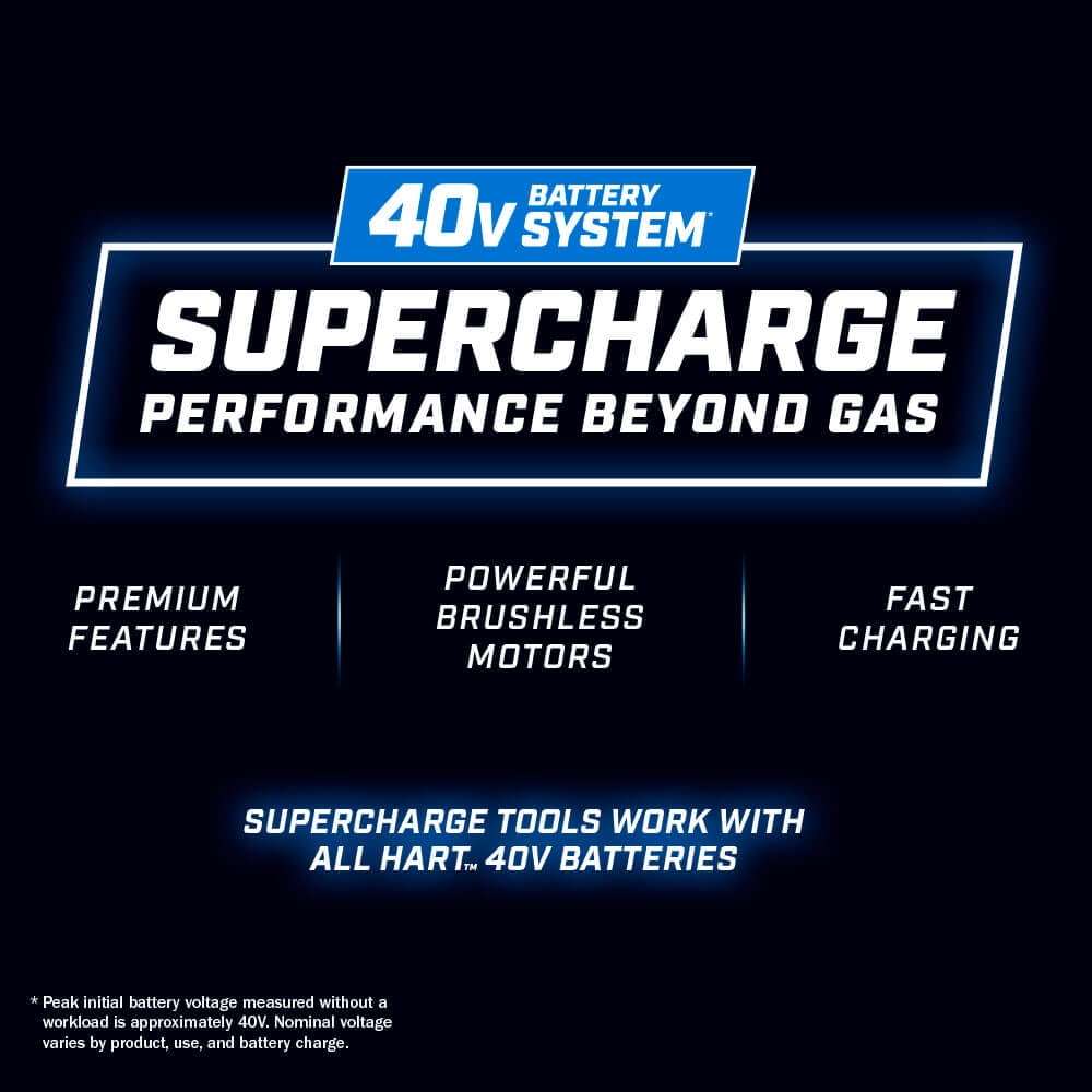 If you’re ready to ditch the hassle of a corded or gas chainsaw, look no further than the HART 40V Supercharge Brushless 16” Chainsaw Kit. It’s ideal for medium-duty jobs such as firewood cutting and yard cleanup. This chainsaw is lightweight, maneuverable, and powerful—perfect for felling medium-sized trees, getting rid of brush, and clearing up storm damage. The 2-step trigger makes it not only easy, but safe to turn on and off while working on trees. It also features an automatic oiler that releases oil onto the bar and across the chain to extend its life automatically. The side access cover makes adjusting the saw’s chain a snap, and the rear comfort grip provides enhanced control during extended periods of use. The brushless motor means you’ll get more power, better runtime, and longer tool life. This kit comes with (1) 40V 4.0Ah lithium-ion battery, (1) 40V fast charger (2X faster than traditional charger), (1) chain adjustment wrench with onboard storage, and (1) hard carrying case). The HART 40V battery included in this kit is compatible with all other HART 40V tools!