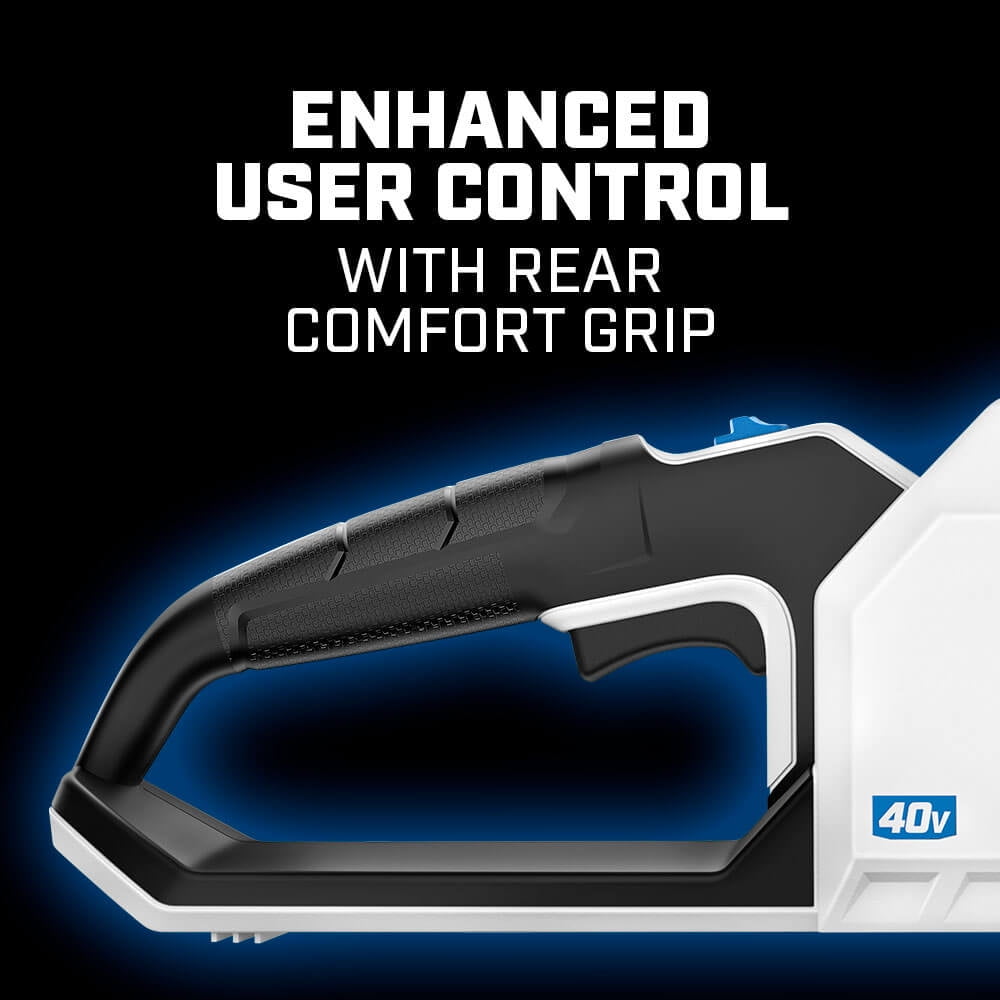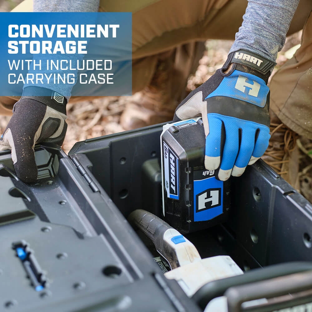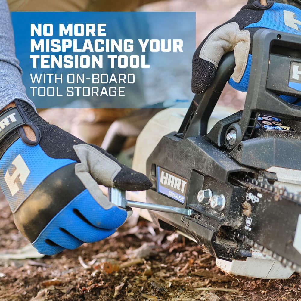 Automatic oiler for easy operation Includes 4.0Ah battery, charger, wrench, hard-carrying case and operator’s manuals Works with All HART™ 40V Batteries Side access chain tensioning for easy chain adjustments Rear comfort grip for enhanced user control On-board tool storage for user convenience