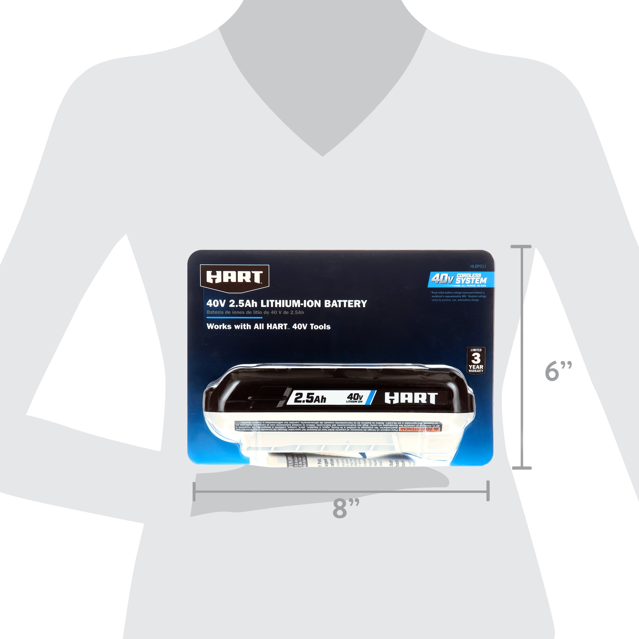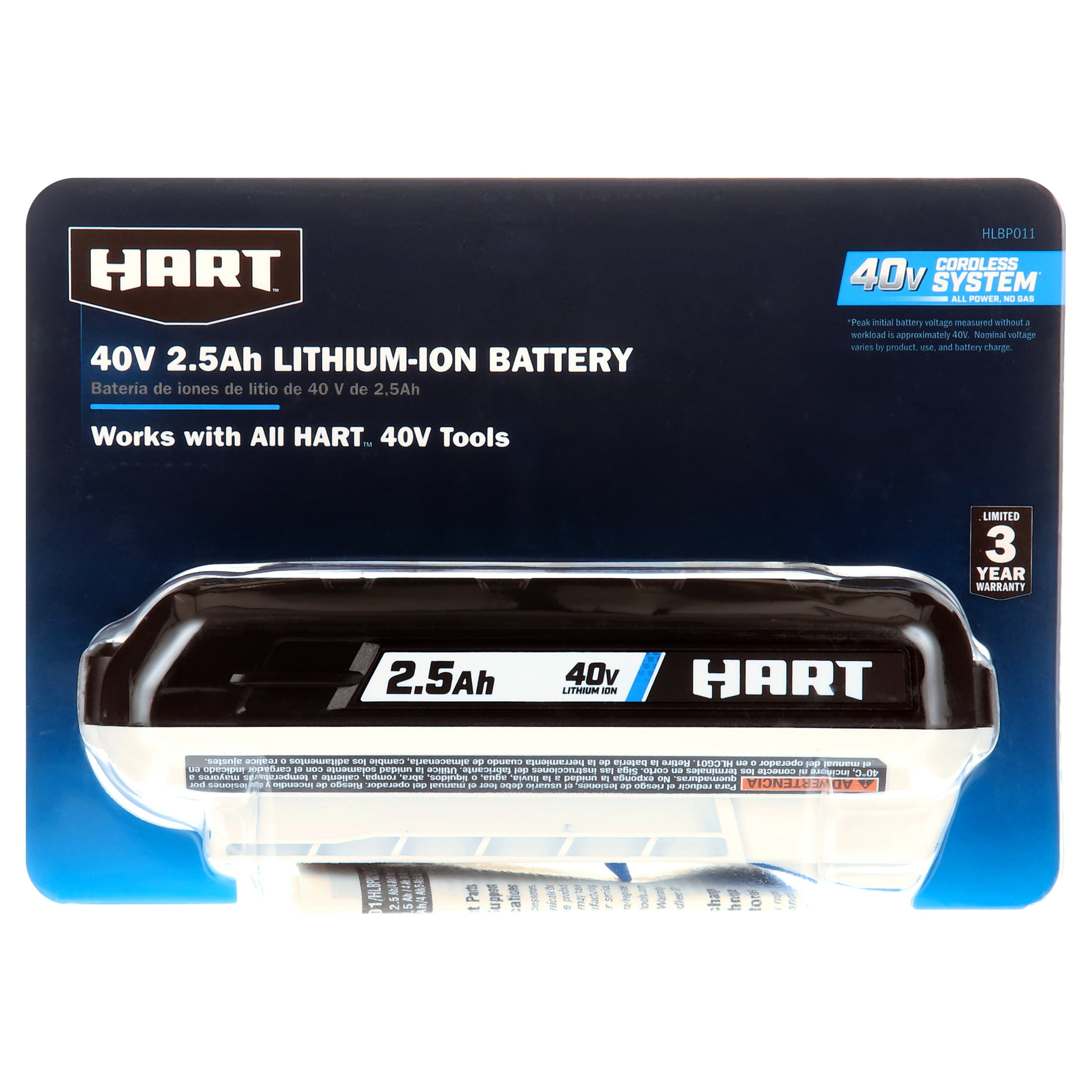 Fits All HART 40V Tools On-board fuel Gauge for quick and convenient updates on remaining runtime Fade Free Lithium-Ion Technology to ensure maximum power throughout your entire project Slim design for increased user comfort and convenience during operation Includes: 40V 2.5Ah Battery and Operator’s Manual Specs: Works with all 40V Tools