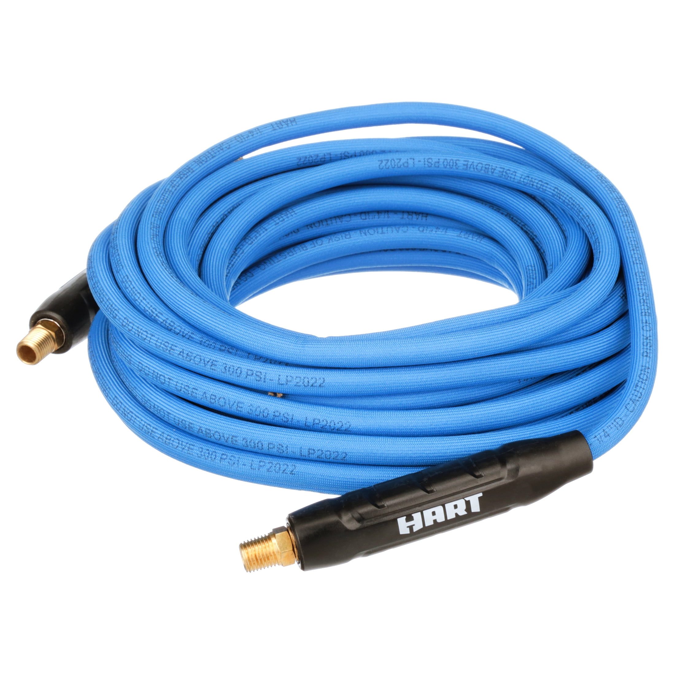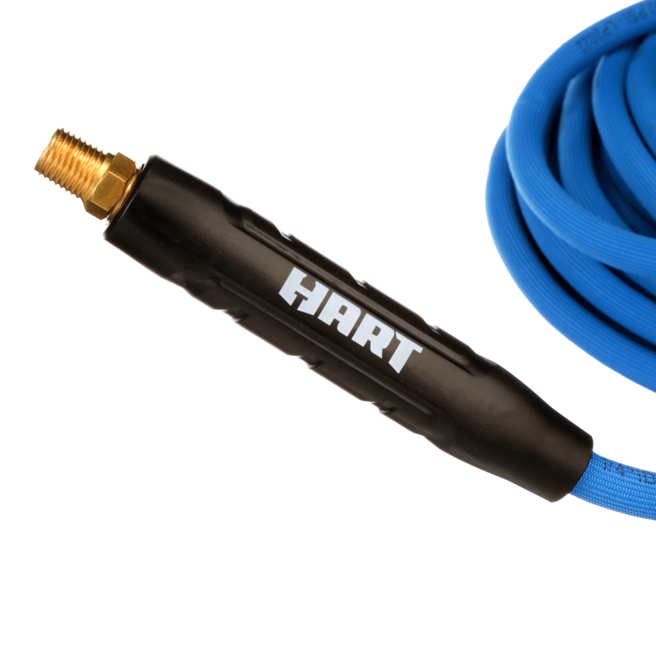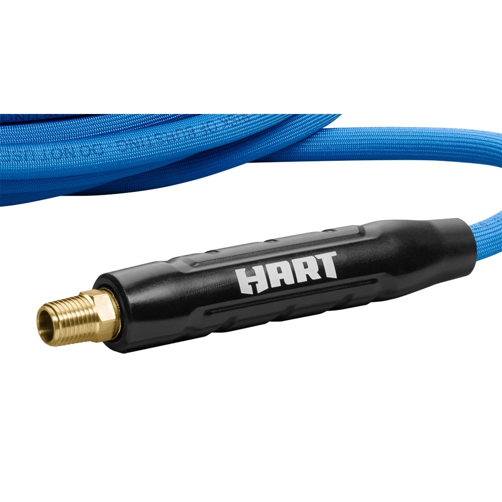 The HART Lay Flat Hose is the perfect solution for DIYers and professionals alike that frequently use pneumatic tools. This lay flat hose has a unique lay flat design that allows the hose to keep its shape, is kink resistant and is non-tangling. This hose features a lightweight design making it easier to move around your workspace. The heavy duty 360-degree swivel fittings feature bend restrictors making what is typically a weak point in other hoses a strength in the HART Lay Flat Hose ensuring extended longevity. This hose is capable of flexing in cold weather allowing you to finish your projects no matter what the outside conditions are. This hose has a maximum capacity of 300 PSI making it able to handle both light duty and heavy-duty applications. If you are a DIYer or professional that frequently uses pneumatic tools or refills tires and sports equipment, the HART Lay Flat Hose is the perfect hose for you and your needs.