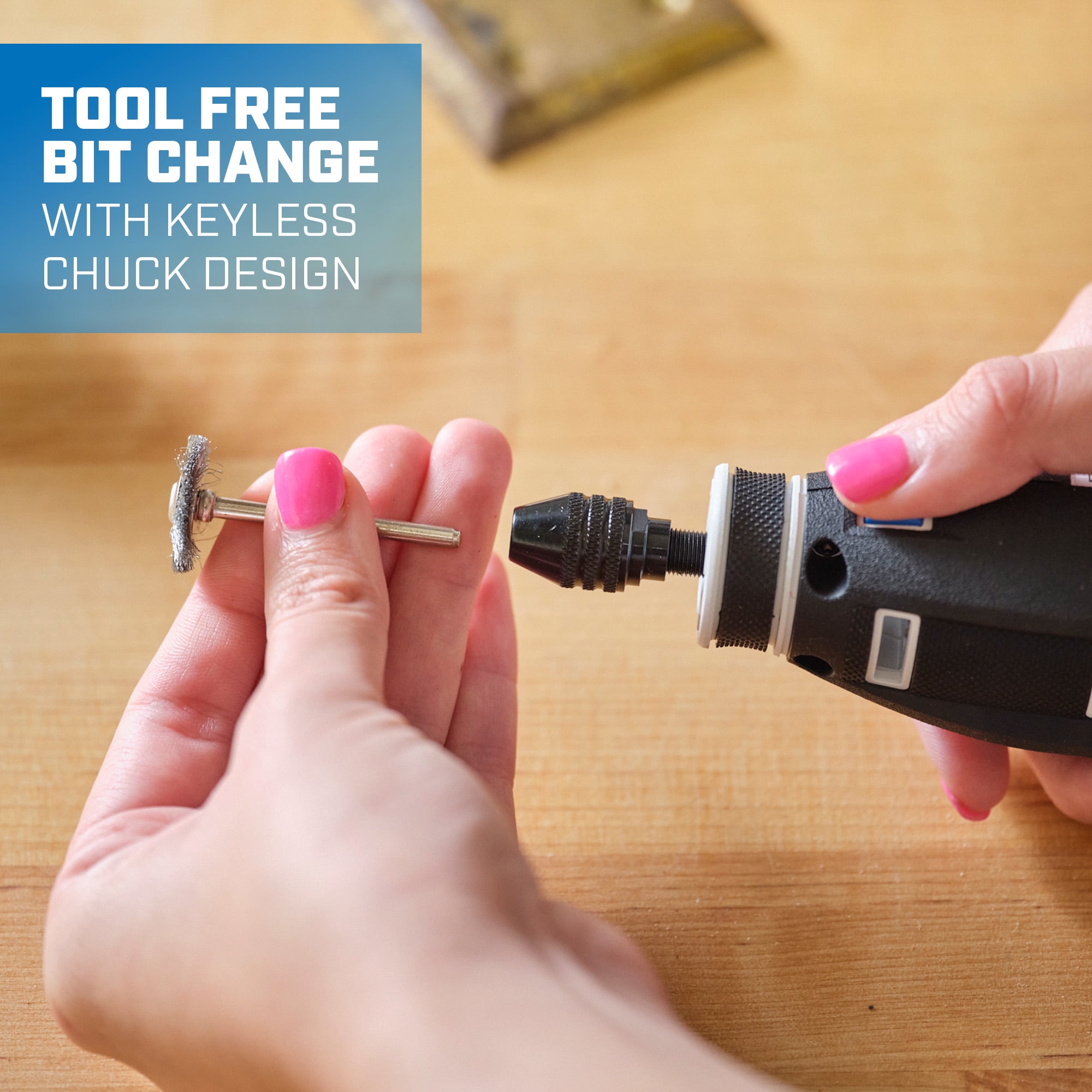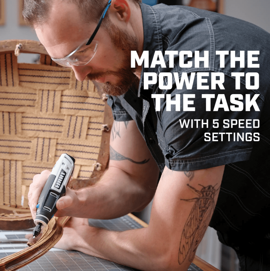 Match power to the task with 5-speed settings Enhanced portability with USB-C charging Tool-free bit change with keyless chuck design Increased user comfort with ergonomic grip Dedicated on/off switch increases user control Voltage: 4V Rated RPM: (1) 5,000 / (2) 10,000 / (3) 15,000 / (4) 20,000 / (5) 25,000 Collet Type: Keyless Chuck Collet Capacity: 1/32″-1/8″ New condition Power type: battery