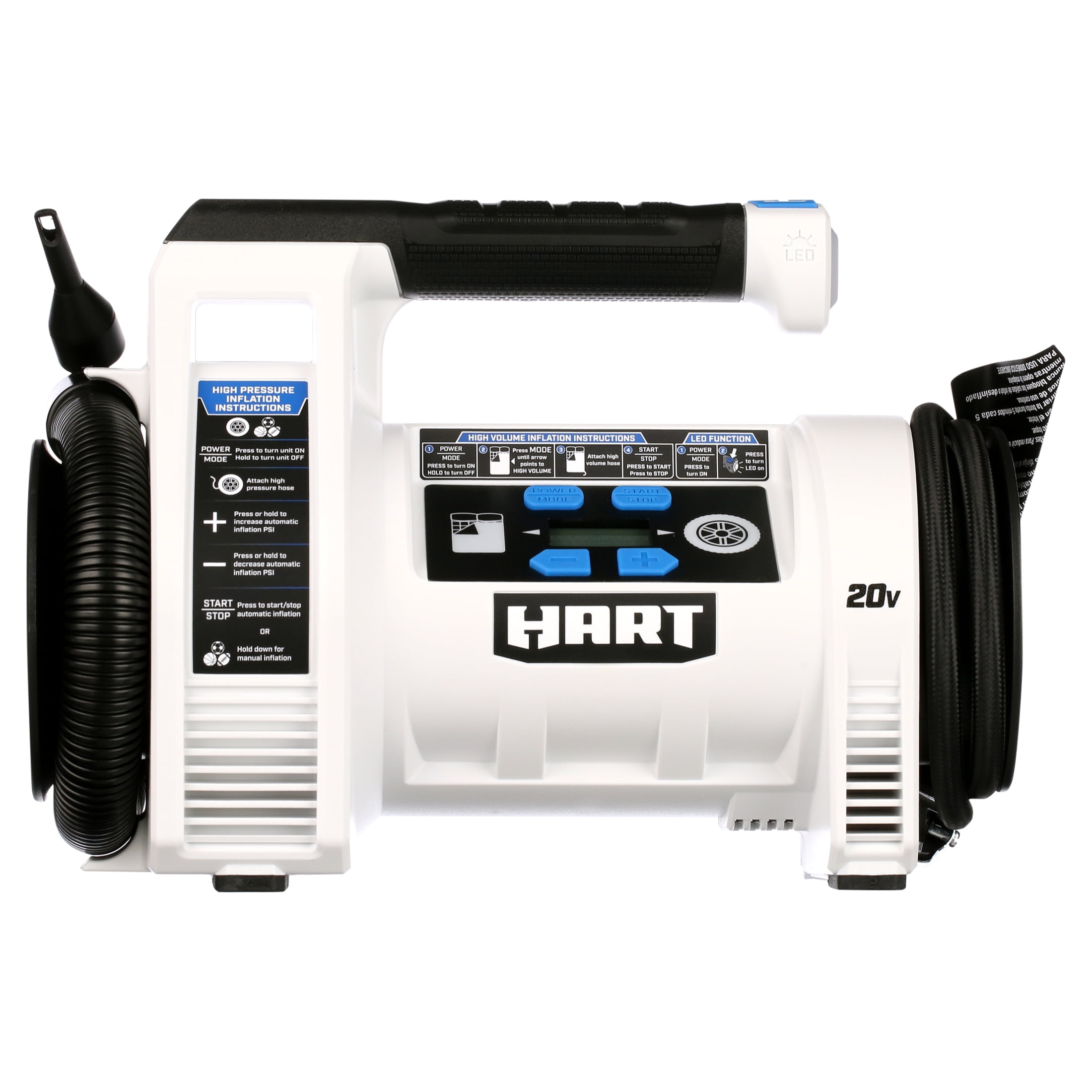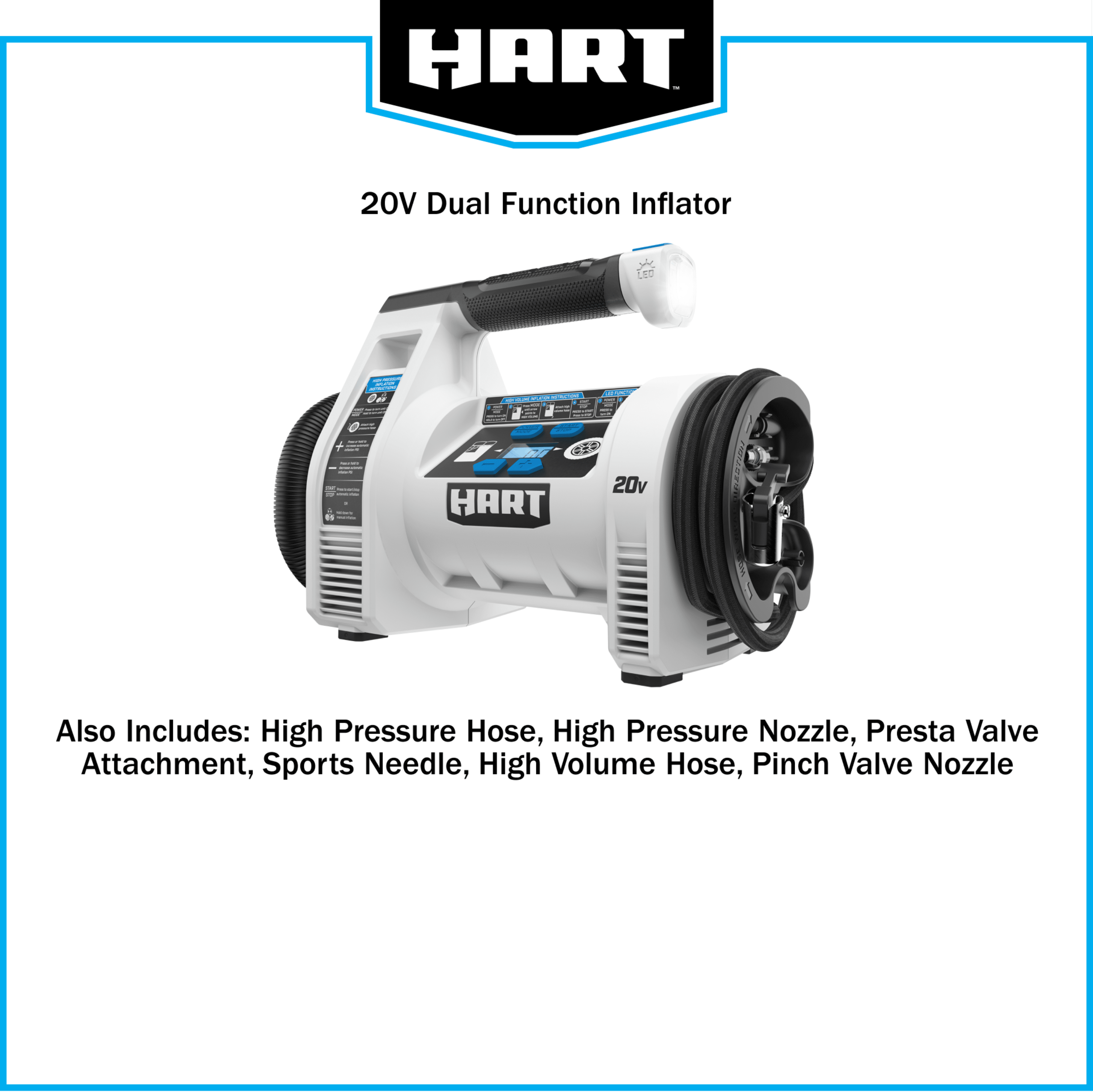Hands-free inflation with auto-fill shutoff, plus precise pressure readings with digital gauge Rapidly inflate a twin air mattress in under 45 seconds On-board LED light for roadside emergency assistance Works with All HART™ 20V Batteries Includes: (1) 20V Dual Function Inflator, (1) High-Pressure Hose, (1) High-Pressure Nozzle, (1) Presta Valve Attachment, (1) Sports Needle, (1) High-Volume Hose, (1) Pinch Valve Nozzle, and (1) Operator’s Manual. New Condition