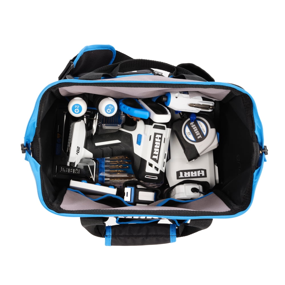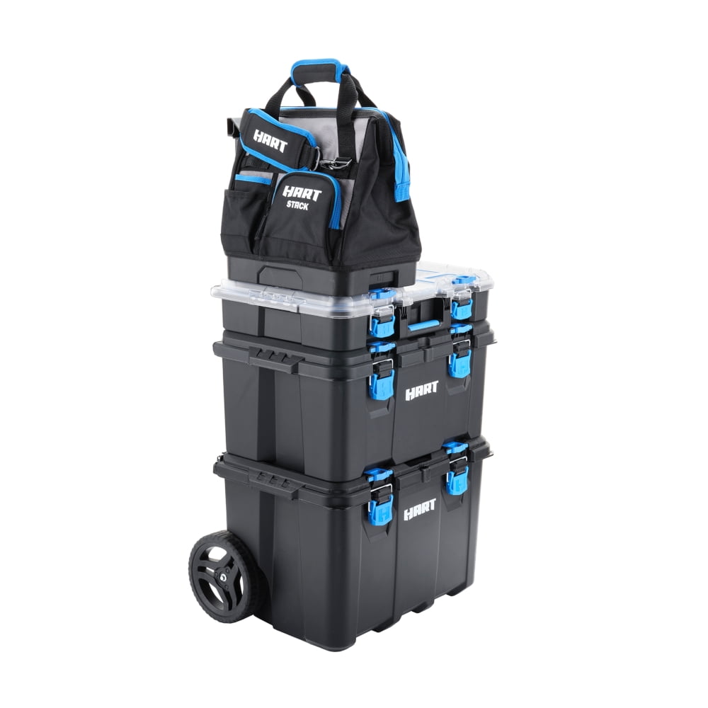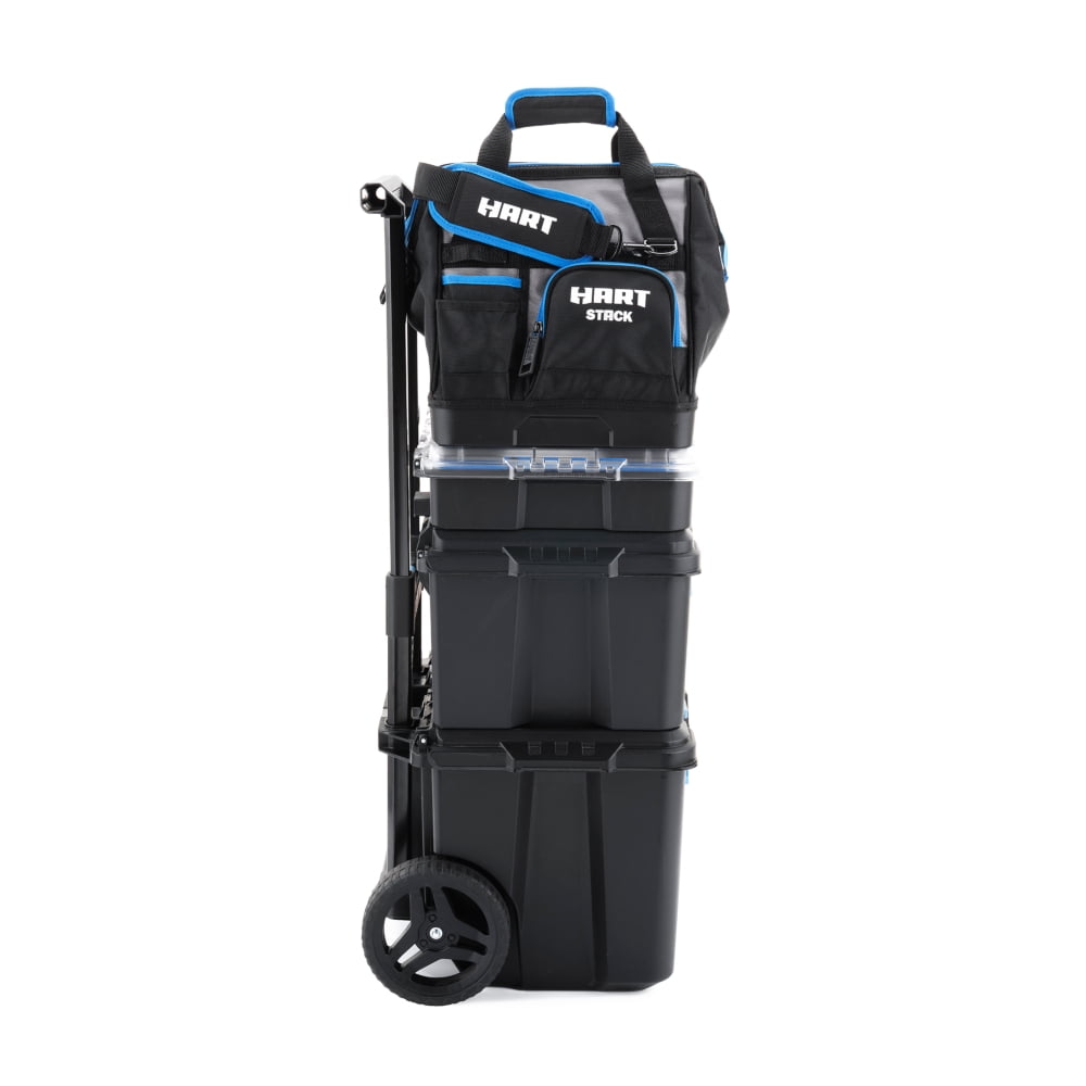 Durable Construction with 1680 Denier fabric Protect from wet surfaces with freestanding waterproof bottom Comfort while carrying with padded hook and loop reinforced handles Quick and easy access with double zippers Easy organization with 30 pockets Can be easily stacked on to any of the storage units within the HART STACK System Includes: (1) 12” Hard Bottom Tool Bag Limited Lifetime Warranty