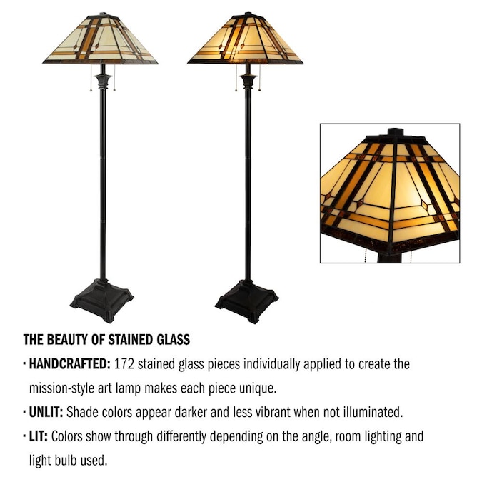 The Hasting Home Tiffany Floor Lamp features a handcrafted mission design lampshade that is sure to add a unique touch to any area of your home. This antique-style stained-glass tall lamp has dual sockets with separate pull chains and comes with 2 LED bulbs that provide up to 25,000 hours of energy-efficient illumination. Use this standing light in your bedroom, entryway, or next to your sofa to provide a cozy glow while you read or relax with friends.