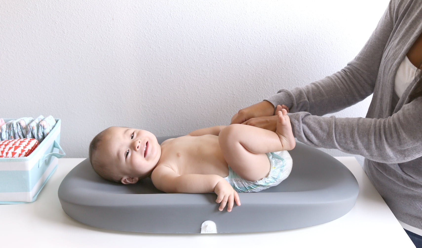 Foam upper, ABS plastic base. Includes: device, safety strap, AA batteries. Free app: Compatible with iOS (9 and higher) and Android (Lollipop and higher). Communicates through Bluetooth Low Energy Second generation Smart Changing Pad. Materials – Foam upper Track your baby’s weight gain between doctor visits Measure how much your baby is drinking at every feeding (in ounces or grams) Soft, comfortable, and easy to clean Add caregivers and stay connected