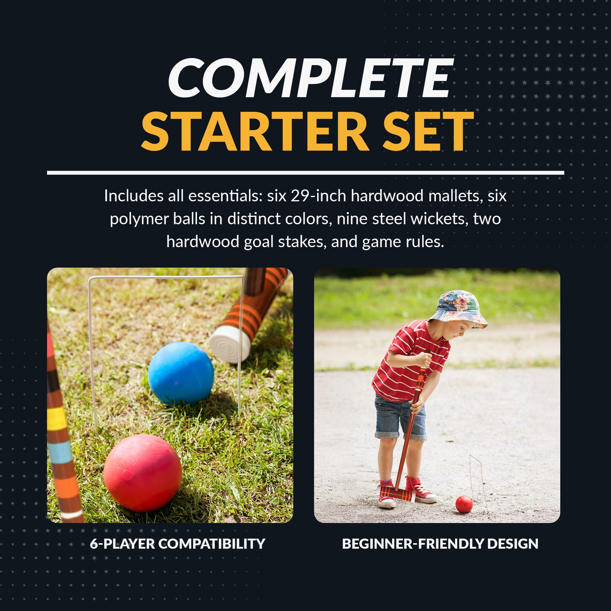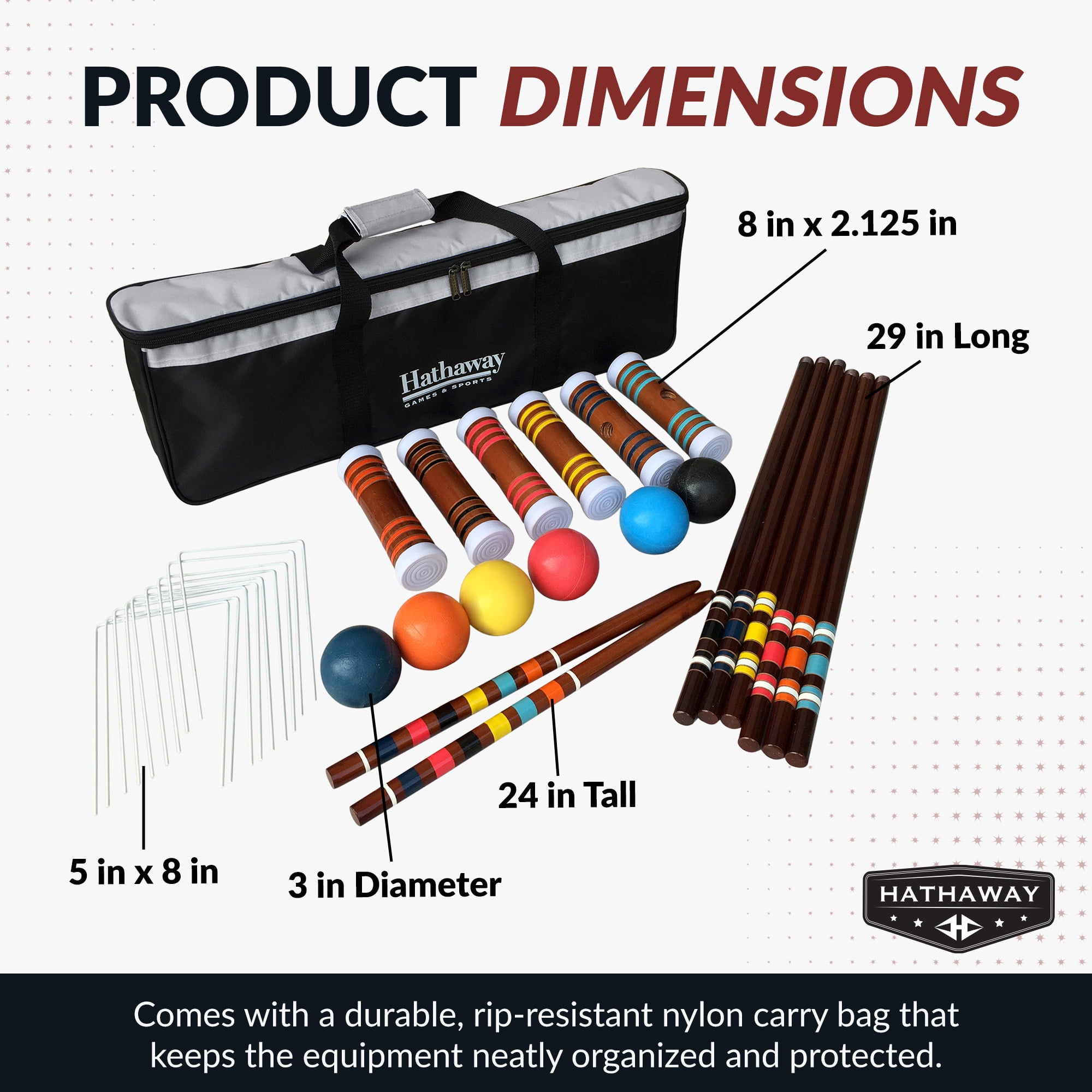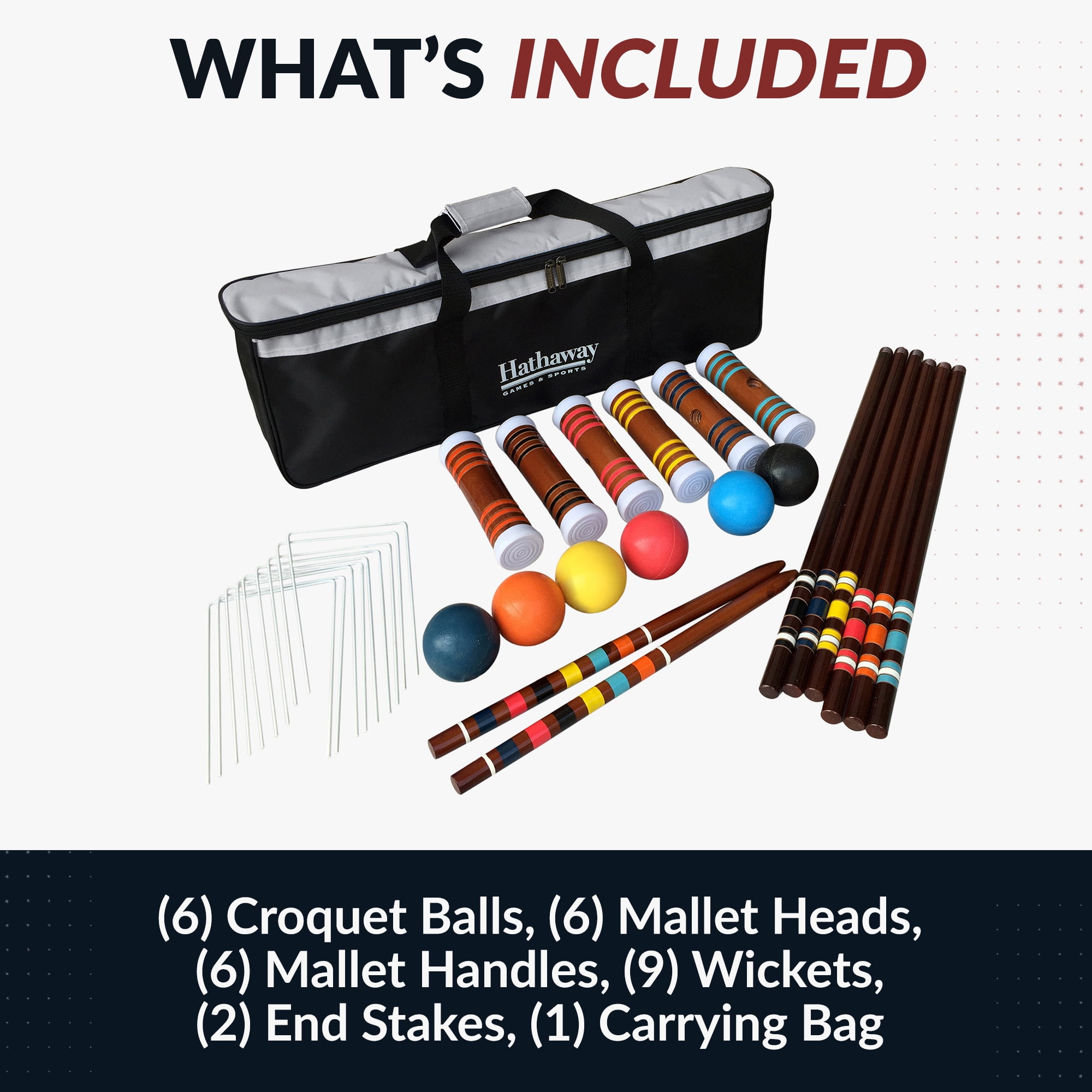 Heavy duty rip-resistant black nylon carrying bag (6) 27-in solid hardwood handles (6) 8-in x 2-1/8-in hardwood mallets (6) 3-in durable chip resistant polymer balls (black/blue/green/red/yellow/orange) (9) 5-in x 8-in, weather-resistant, coated steel wickets (2) 24-in hardwood goal stakes For Up to 6 players Includes 6 mallets, 6 balls, 9 wickets, 2 goal stakes, nylon carry bag, and game rules