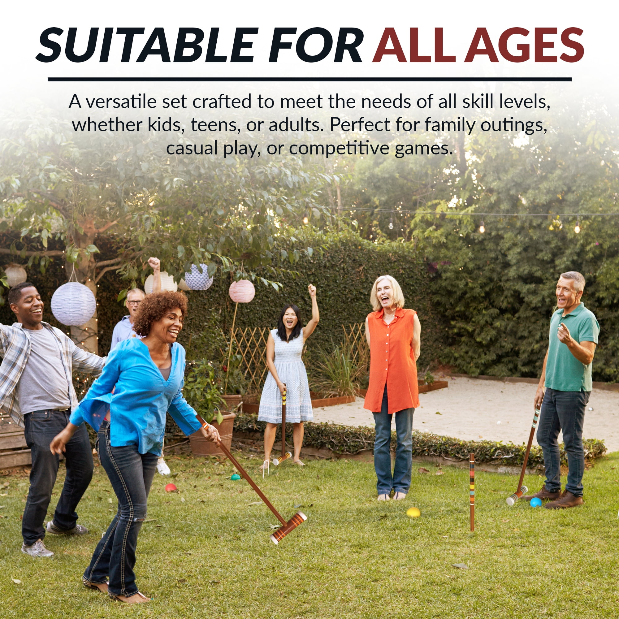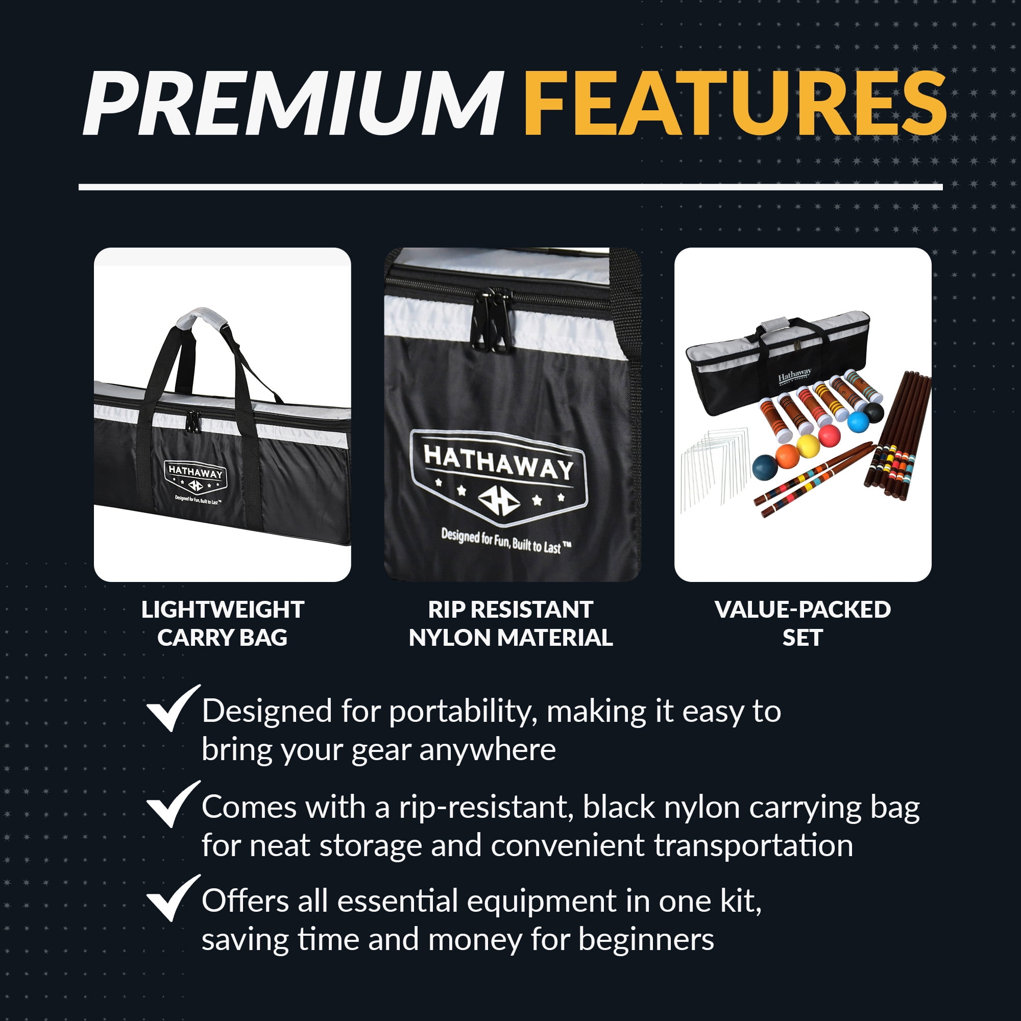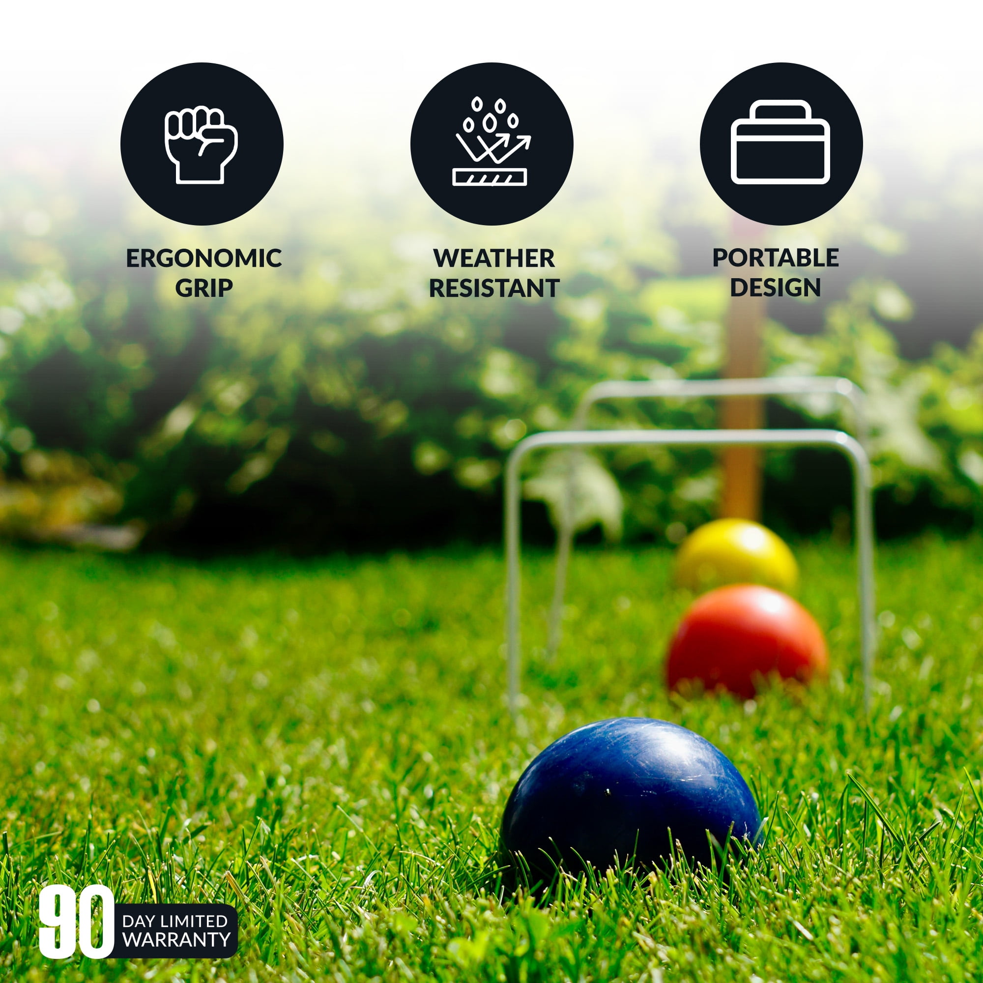 Heavy duty rip-resistant black nylon carrying bag (6) 27-in solid hardwood handles (6) 8-in x 2-1/8-in hardwood mallets (6) 3-in durable chip resistant polymer balls (black/blue/green/red/yellow/orange) (9) 5-in x 8-in, weather-resistant, coated steel wickets (2) 24-in hardwood goal stakes For Up to 6 players Includes 6 mallets, 6 balls, 9 wickets, 2 goal stakes, nylon carry bag, and game rules
