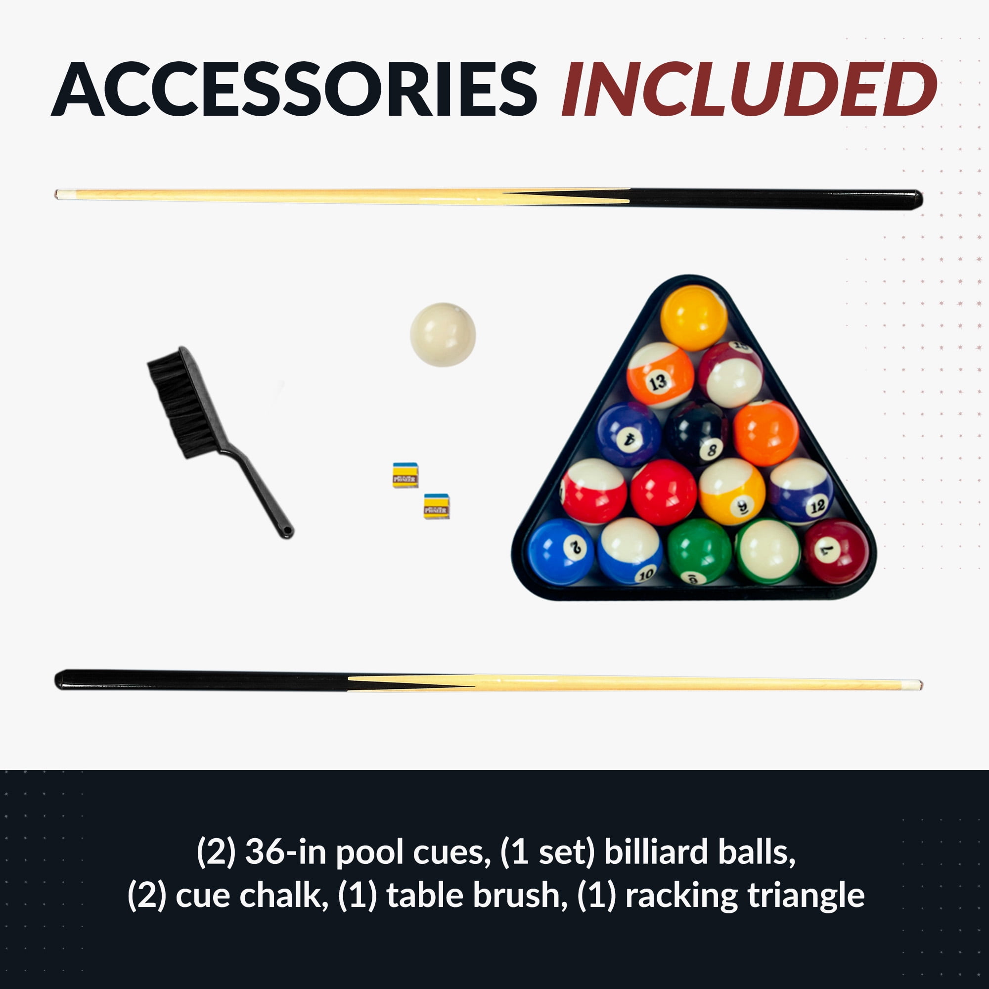 Let the games begin! The lightweight, stylish Breakout Pool Table is perfect for kids to have competitive fun while improving their hand eye coordination. Its compact size is big enough for a good game of pool, but small enough for easy storage. Made of quality engineered wood that is finished in a handsome blue and silver melamine. The table features sturdy L-shaped legs with non-marking skid pads, a bold, blue play surface, and comes complete with all the game accessories needed to instantly convert any room of your home into an action-packed game room. Miniature size fits easily on most tabletops Durable 1/4-in thick engineered wood High-quality, blended polyester/wool blue felt No-mar skid pads protect floors and tables Playfield: 37-in l x 18.31-in w Table dimensions: 40-in l x 21.5-in w x 7-in h Blue and silver melamine cabinet finish Rope net pockets Includes (2) 36-in cues, set of billiard balls, 2 pieces of cue chalk, table brush, and a racking triangle