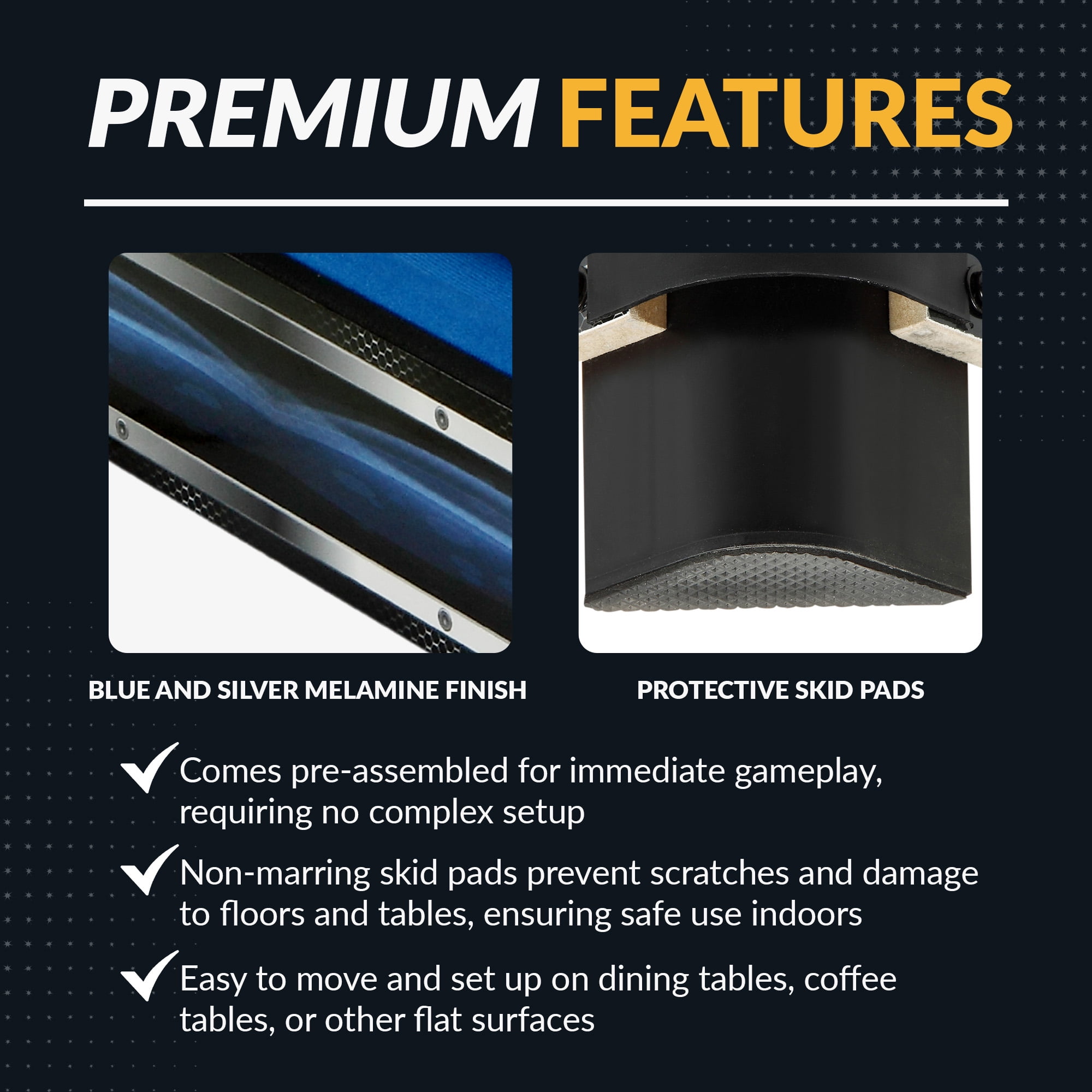 Miniature size fits easily on most tabletops Durable 1/4-in thick engineered wood High-quality, blended polyester/wool blue felt No-mar skid pads protect floors and tables Playfield: 37-in l x 18.31-in w Table dimensions: 40-in l x 21.5-in w x 7-in h Blue and silver melamine cabinet finish Rope net pockets Includes (2) 36-in cues, set of billiard balls, 2 pieces of cue chalk, table brush, and a racking triangle