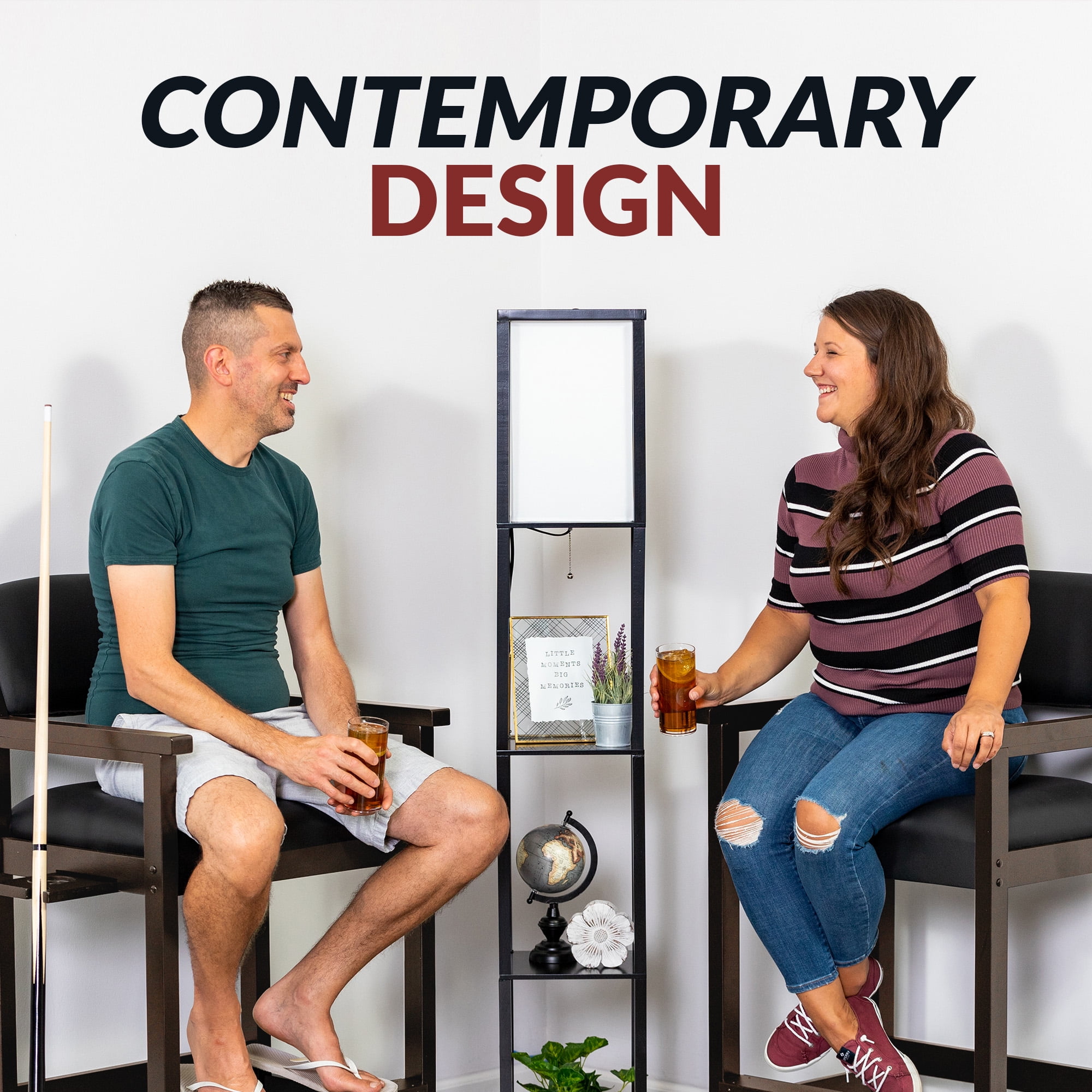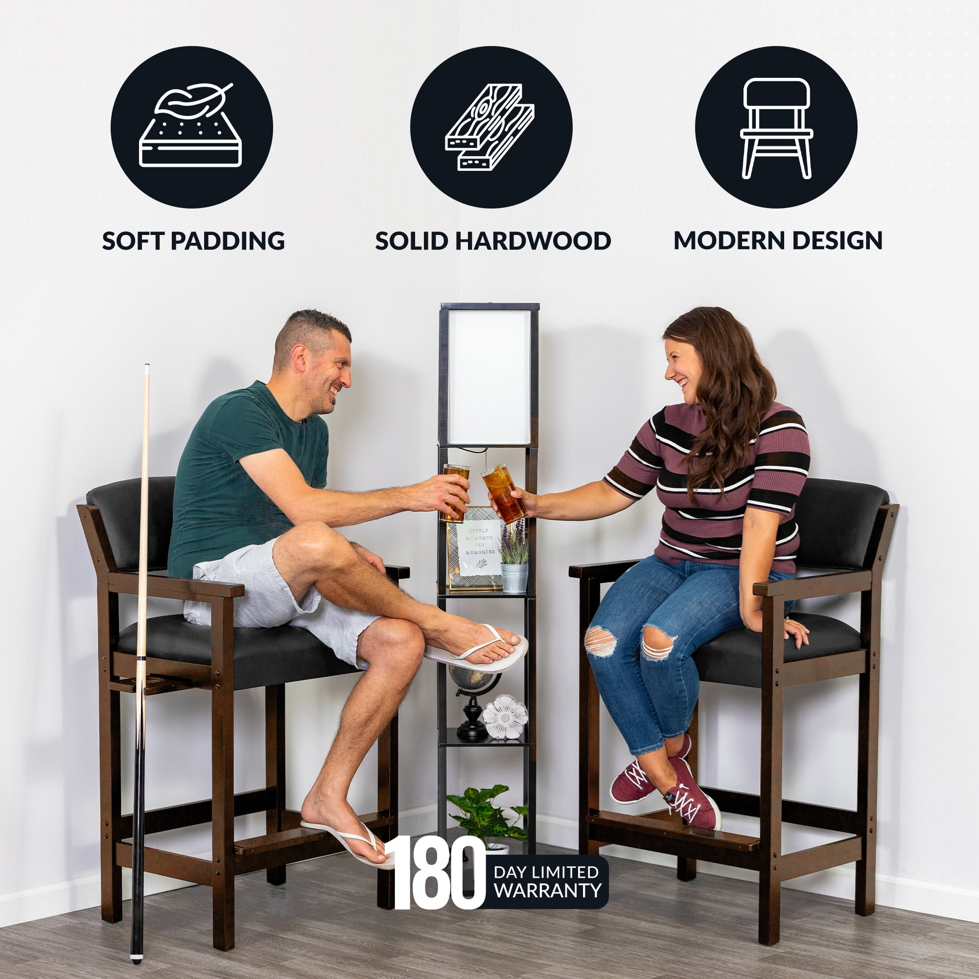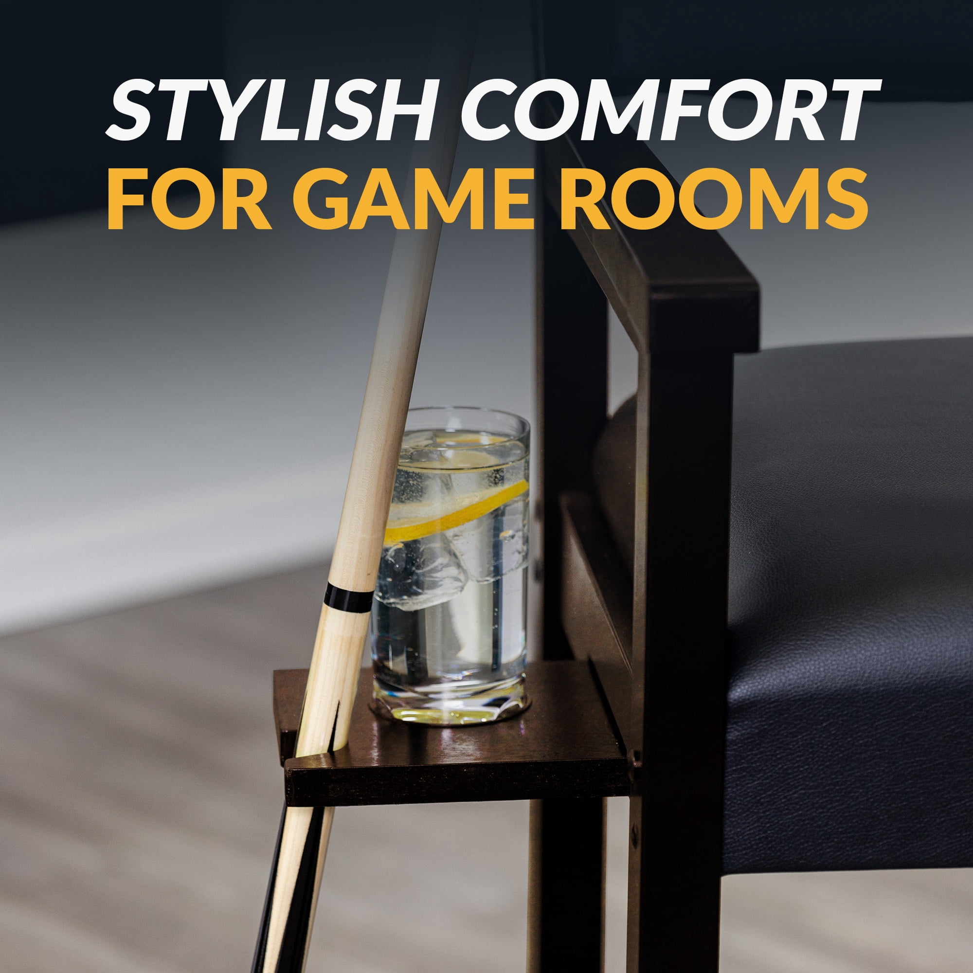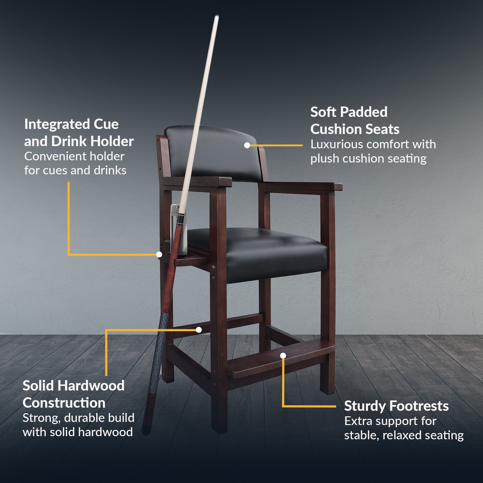 Dimensions: 25-in L x 22.5-in W x 44.25-in H; Seat height 30.5-in Engineered for strength with handcrafted solid hardwood Extra-wide armrests and footrest for added comfort Soft cushion seat pads covered in a black leatherette material Built-in cue rest and drink holder Available in 3 beautiful furniture finishes – antique walnut, rich mahogany or black Scratch-resistant durable protective clear coat Weight capacity: 275-lbs