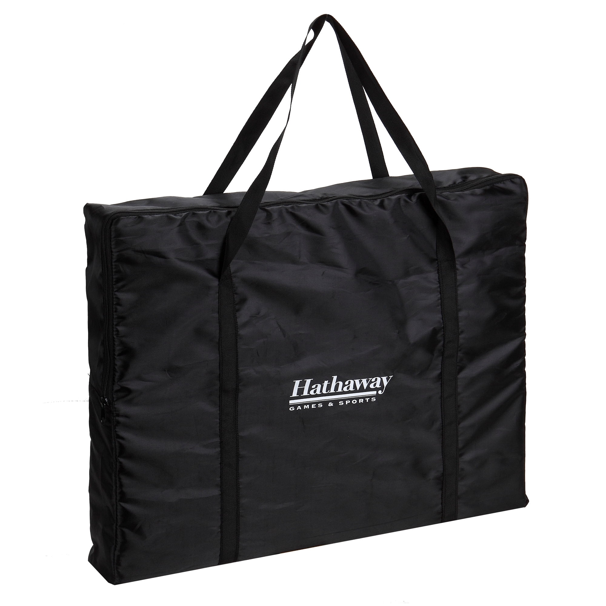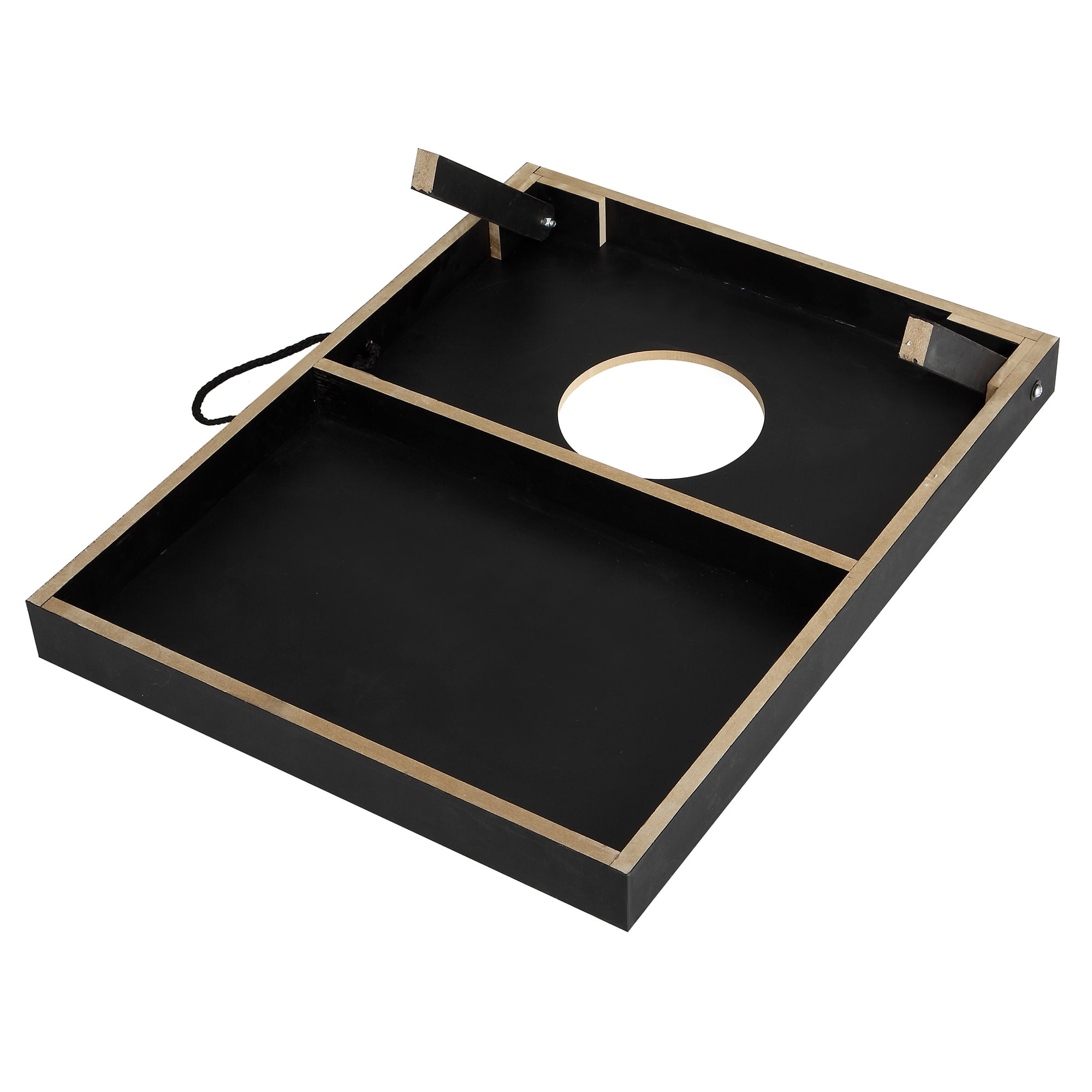 (8) 4-in x 4-in durable bean toss bags – 4 Black and 4 Yellow 2 CARB certified MDF boards, each measures 23.6-in L x 18.125-in W Exciting, fade-resistant action graphics surface design Wooden retractable folding legs 4 quick-clasp latches secures both boards together for transport or storage Rope carrying handles for easy transport Heavy-duty, rip-resistant, Black nylon carrying bag for transport and storage Includes game rules