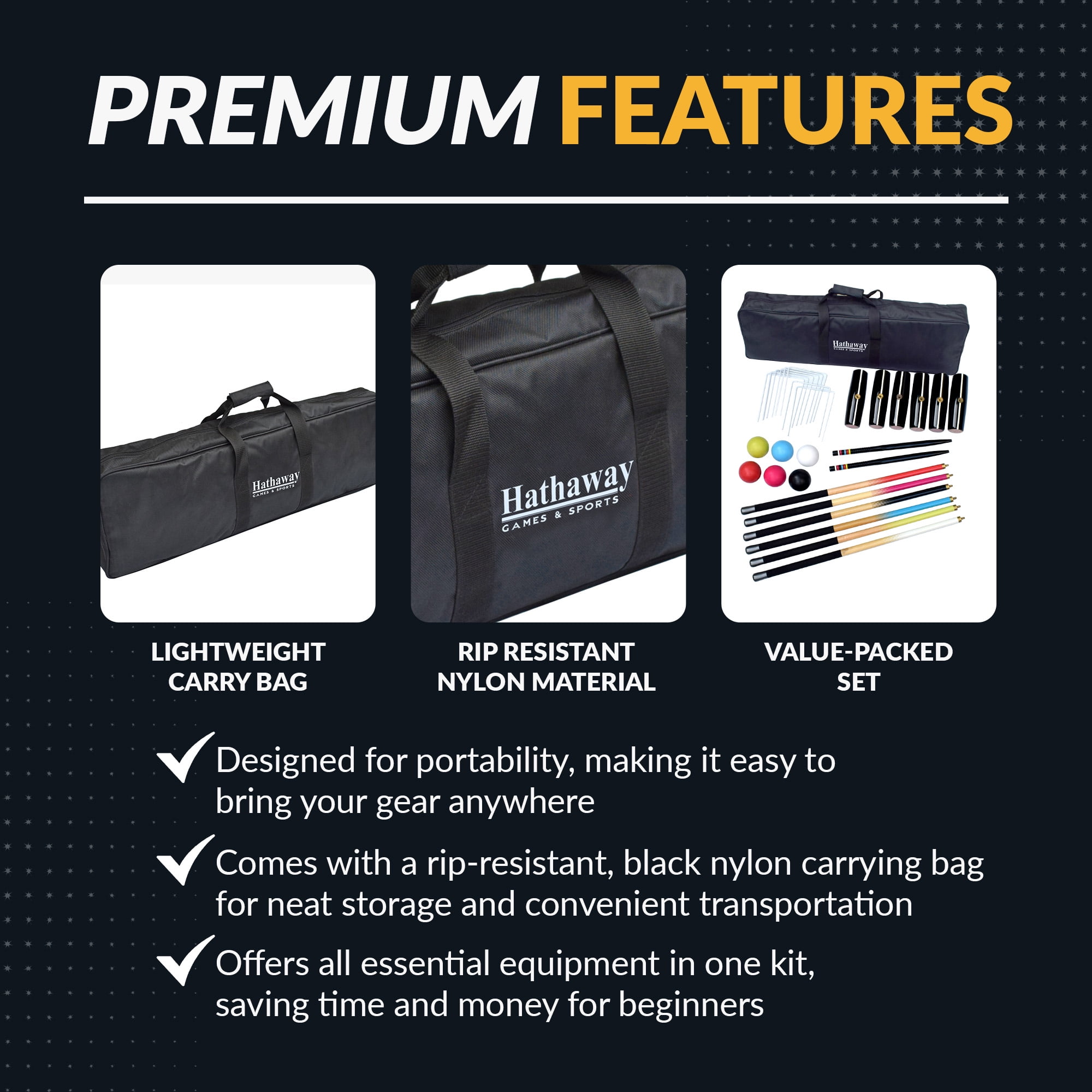 (6) 9-in x 2-3/8-in hardwood mallets (6) 31-in solid hardwood handles (6) 3-1/3-in durable chip resistant polymer balls Color matched mallets and balls -black, blue, pink, red, yellow, and white (9) 6-in x 8-in, weather-resistant, powder-coated steel wickets (2) 24-in hardwood goal stakes Heavy-duty, rip-resistant, Black nylon carrying bag (6) hardwood mallets, (6) solid hardwood handles, (6) polymer balls, (9) powder-coated wickets, (2) goal stakes, (1) nylon carrying case, and game rules