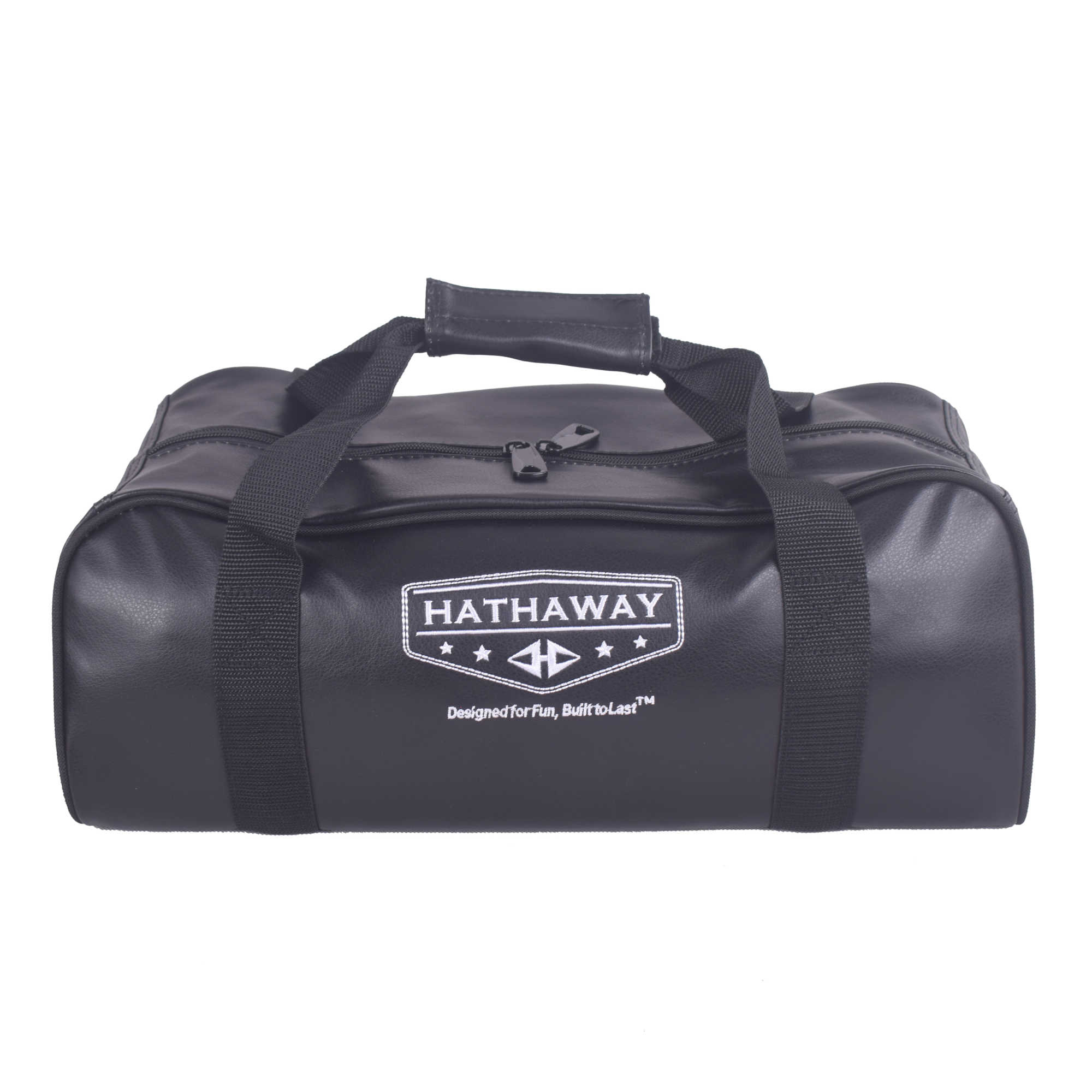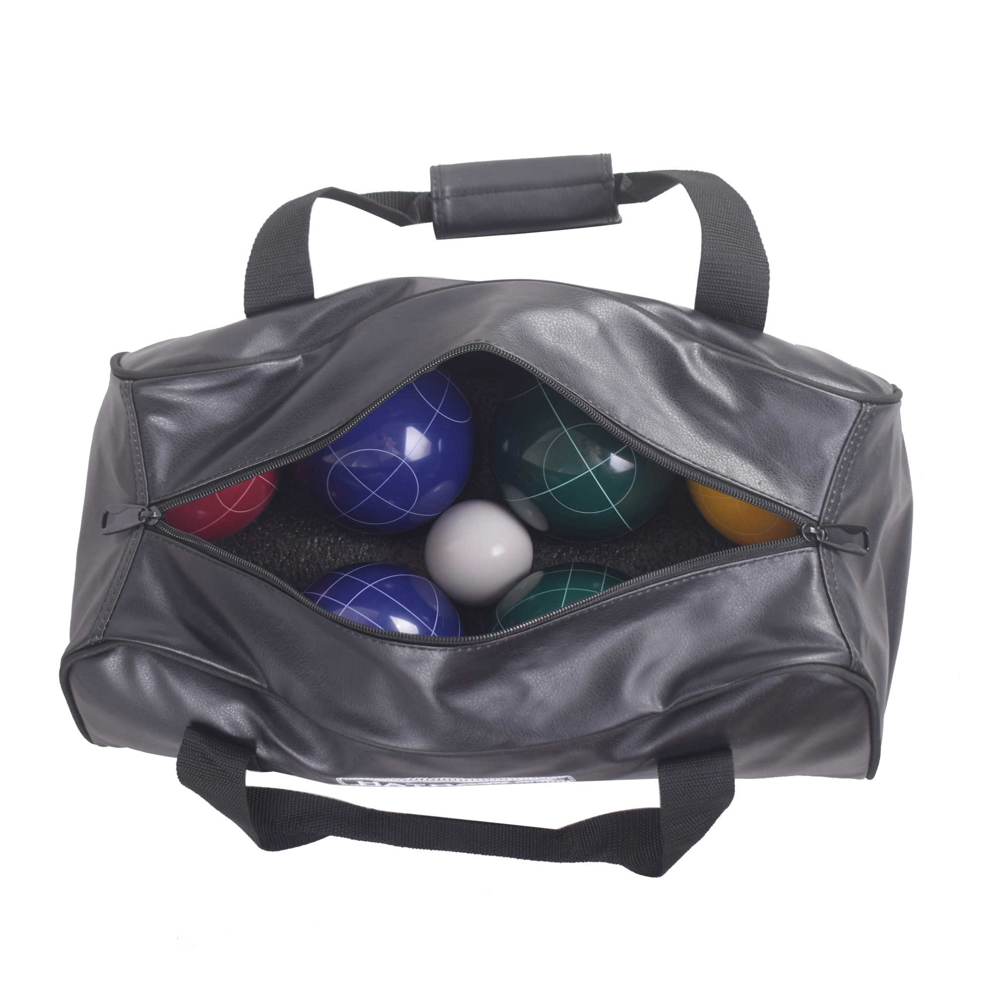 Complete 10-piece game set: 8 bocce balls, pallino ball, and carry bag Standard-sized bocce balls measure 107 mm (4.25-in) diameter Traditional colors: 2 each, Red, Green, Blue and Yellow Etched, resin, chip-resistant, tournament-quality balls White pallino ball measures 2.36-in diameter/60-mm Heavy duty, weather-resistant, Black nylon carrying case with webbing handles Comes with game rules Includes game rules