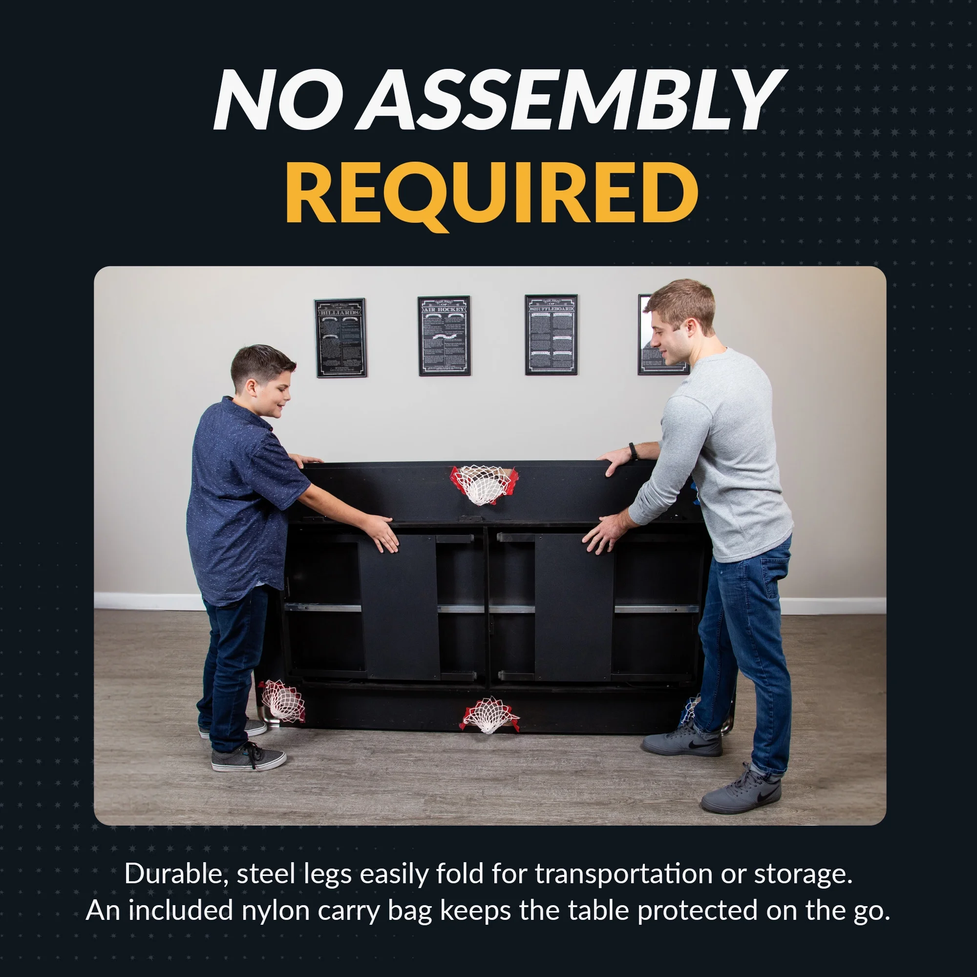 The unique Fairmont 6-ft Pool Table was specifically designed for smaller spaces and portability. But don’t let its size fool you! It’s packed with many quality features found on much larger, more expensive tables. This table features 5-in wide top rails wrapped in a durable black melamine, fast action cushions, and a “True Roll” play surface covered in a high quality, blended wool cloth. The Fairmont is fully supported by strong metal folding legs with levelers that are super easy to set up and even easier to store. This table is certain to provide hours of fun and competitive play for both children and adults alike. Includes a convenient nylon rip-resistant carry/storage bag and all pool table accessories needed to play a competitive game of pool. 180-day limited warranty.