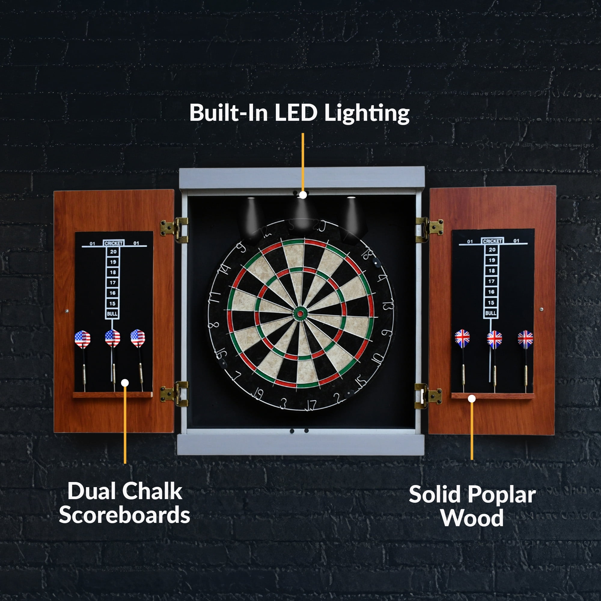 Light up your game with the Geneva Dart Cabinet Set. Featuring a built-in, LED lighting system, the Geneva Dart Cabinet will add authentic pub-style to your game room, man cave, or office. Constructed from high-quality, engineered wood, this cabinet will stand up to a lifetime of play. A modern, gray, and wood grain melamine finish resist cracking or splitting. Keeping score is easy with two scoreboards conveniently mounted on the interior of each door. Integrated dart holders keep your darts neatly stored when not in use. Comes complete with a regulation-sized, sisal dartboard and six steel-tipped darts. All you need to do is mount the dartboard cabinet and play.