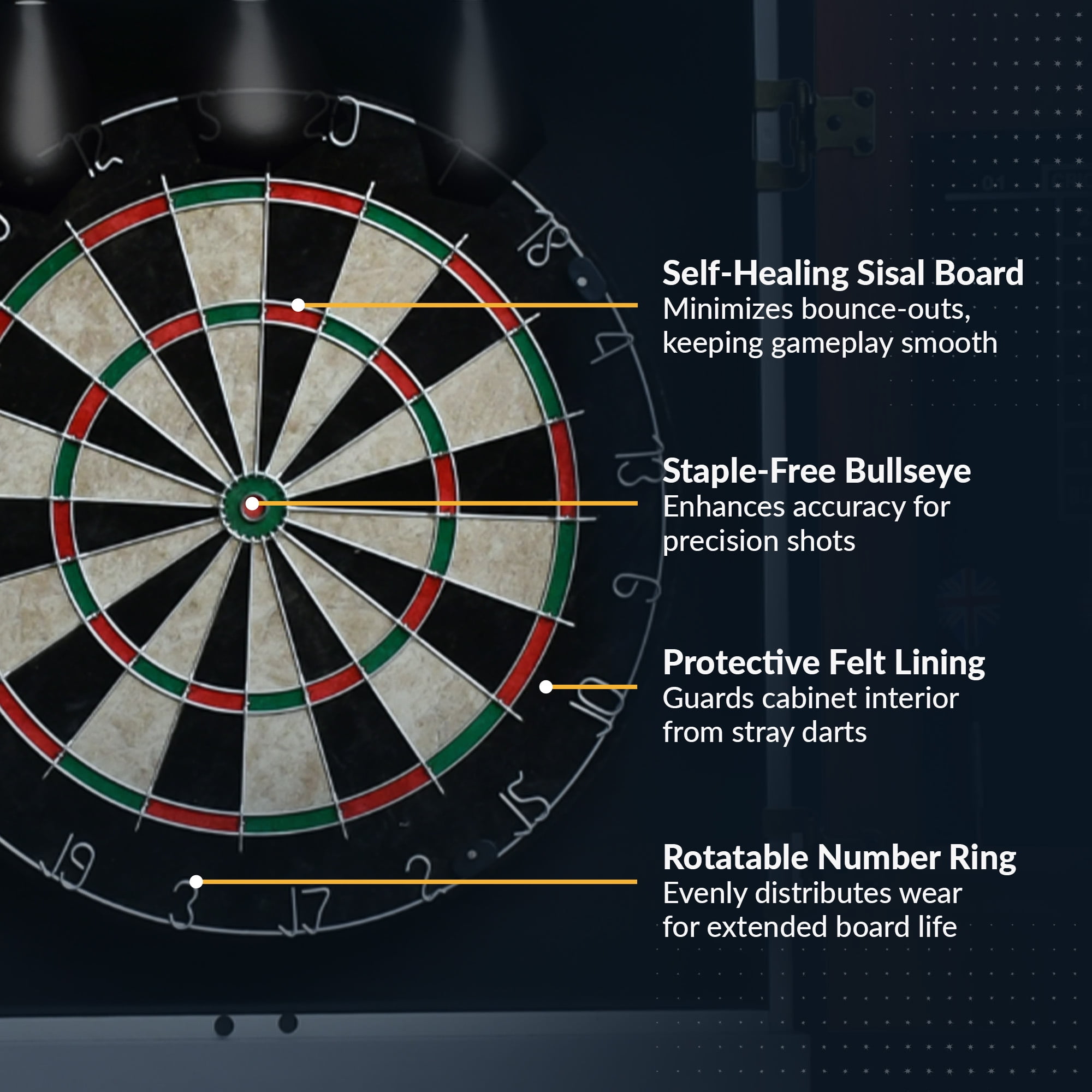 Hathaway Geneva Dartboard Cabinet with Integrated Lighting, Grain/Black/Gray Unique LED light system powered by (4) AA batteries (not included) Regulation 18-in sisal fiber bristle dartboard for professional play Constructed from solid, engineered wood for durability Modern gray and wood grain finish adds a stylish touch Aged bronze hardware enhances the cabinet’s aesthetic Dual chalk scoreboards and built-in dart holders on each door for convenience Rotatable number ring for even board wear, extending the life of the dartboard Wall mounting hardware included for easy installation Cabinet dimensions: 22.8-in W x 25.4-in H x 3.7-in D