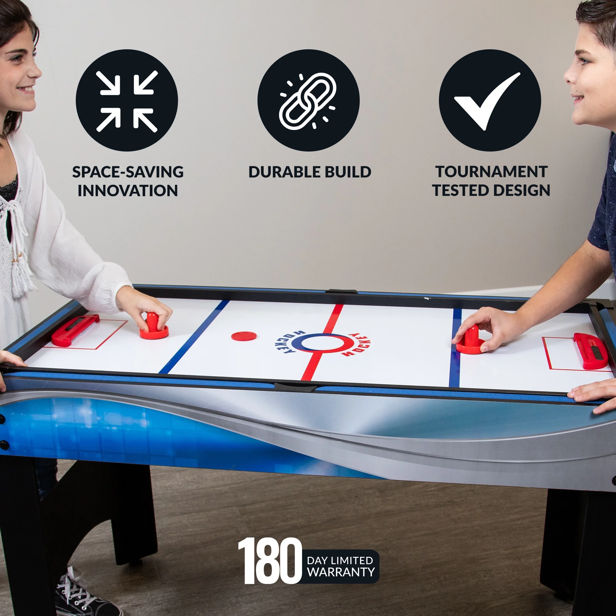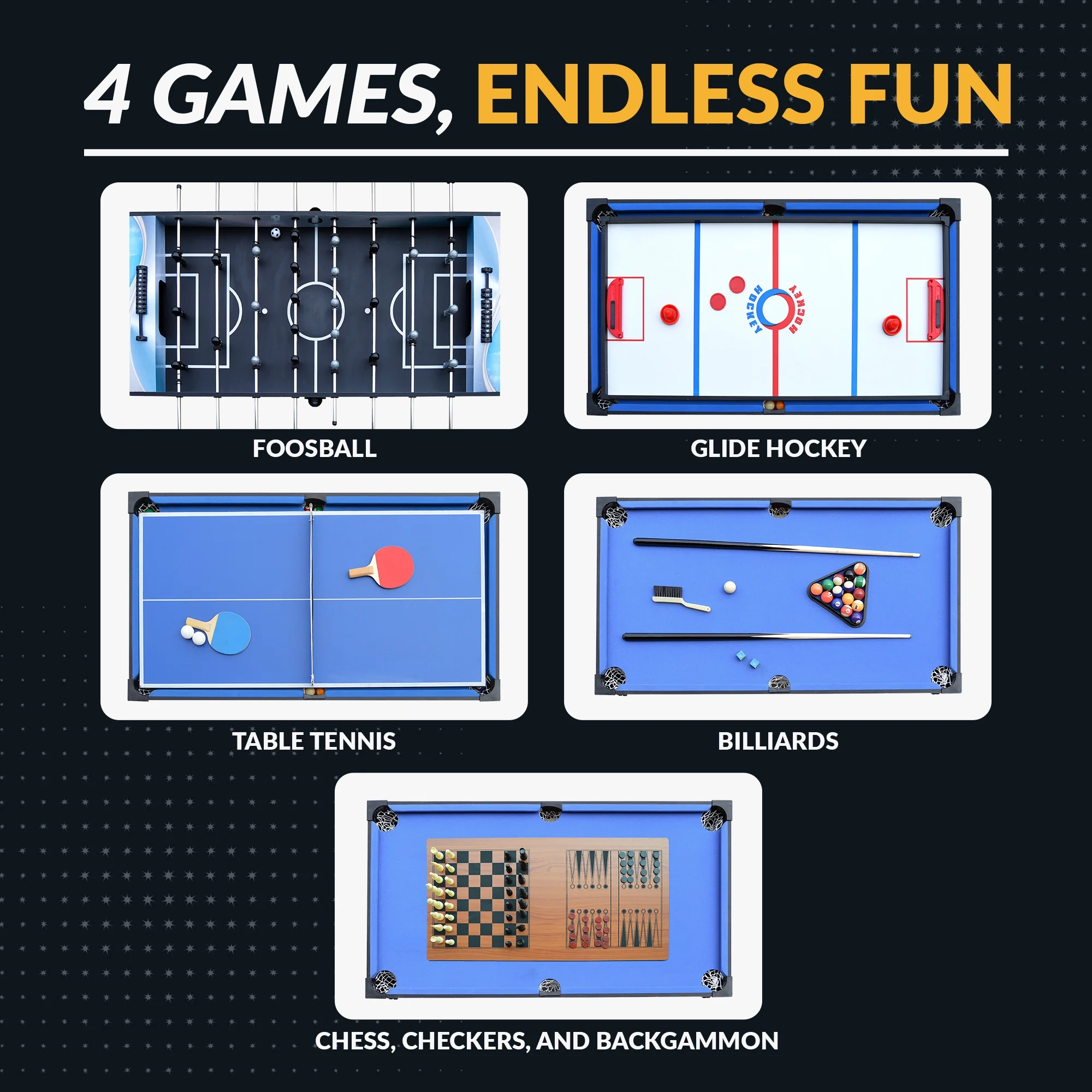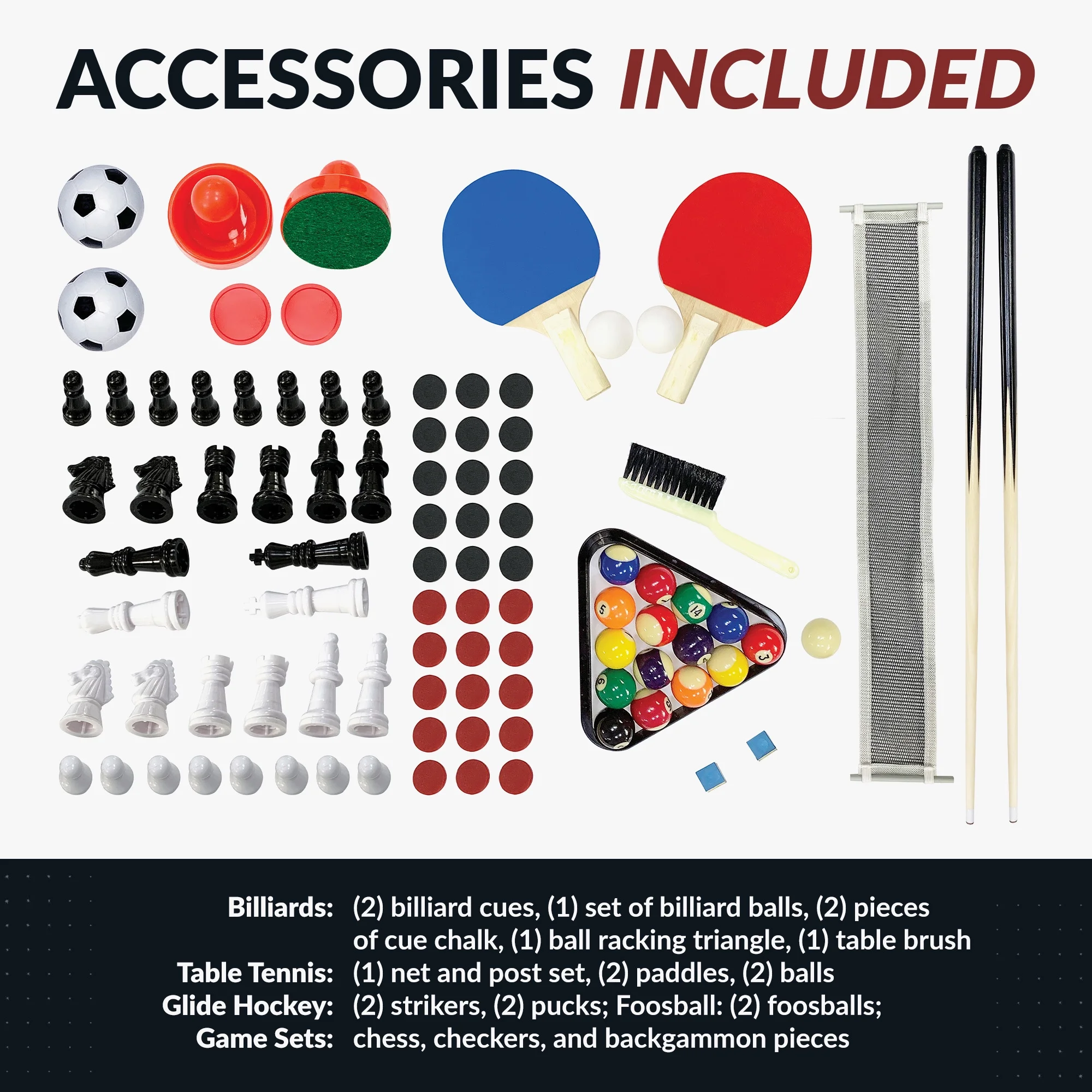 Hathaway 54-in Foosball 7-in-1 Multi-Game Table Playing surface: 42.125-in L x 24.75-in W Table dimensions: 54-in L x 26-in W x 34-in H 7 classic games in one table – Billiards Glide Hockey Chess Checkers Backgammon Table Tennis and Foosball Play surfaces easily convert from one game to another Rugged CARB certified MDF construction L-Shaped MDF CARB certified legs with cross support beams provides a rock solid table foundation 1.5-in ABS adjustable leg levelers for quick table leveling on any surface