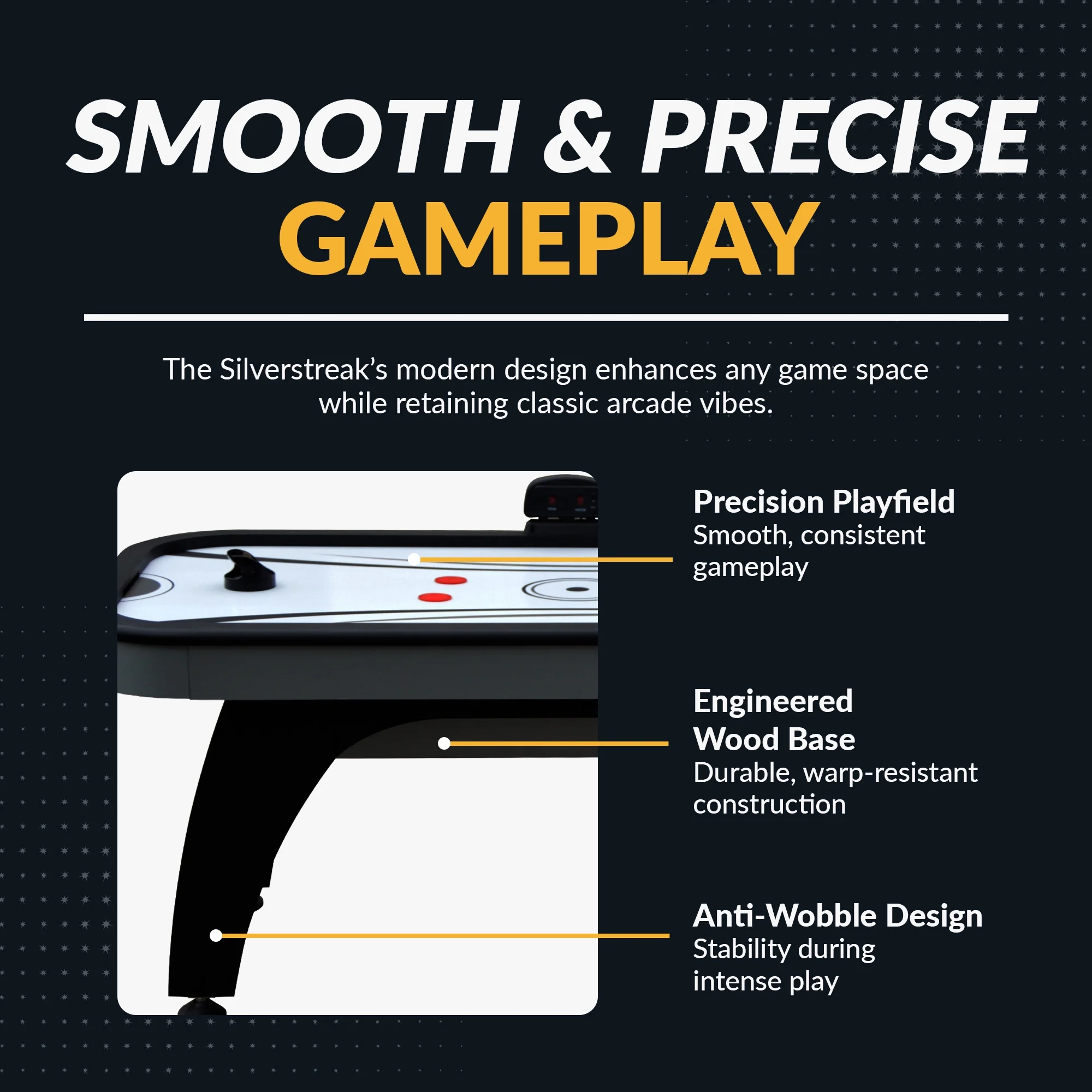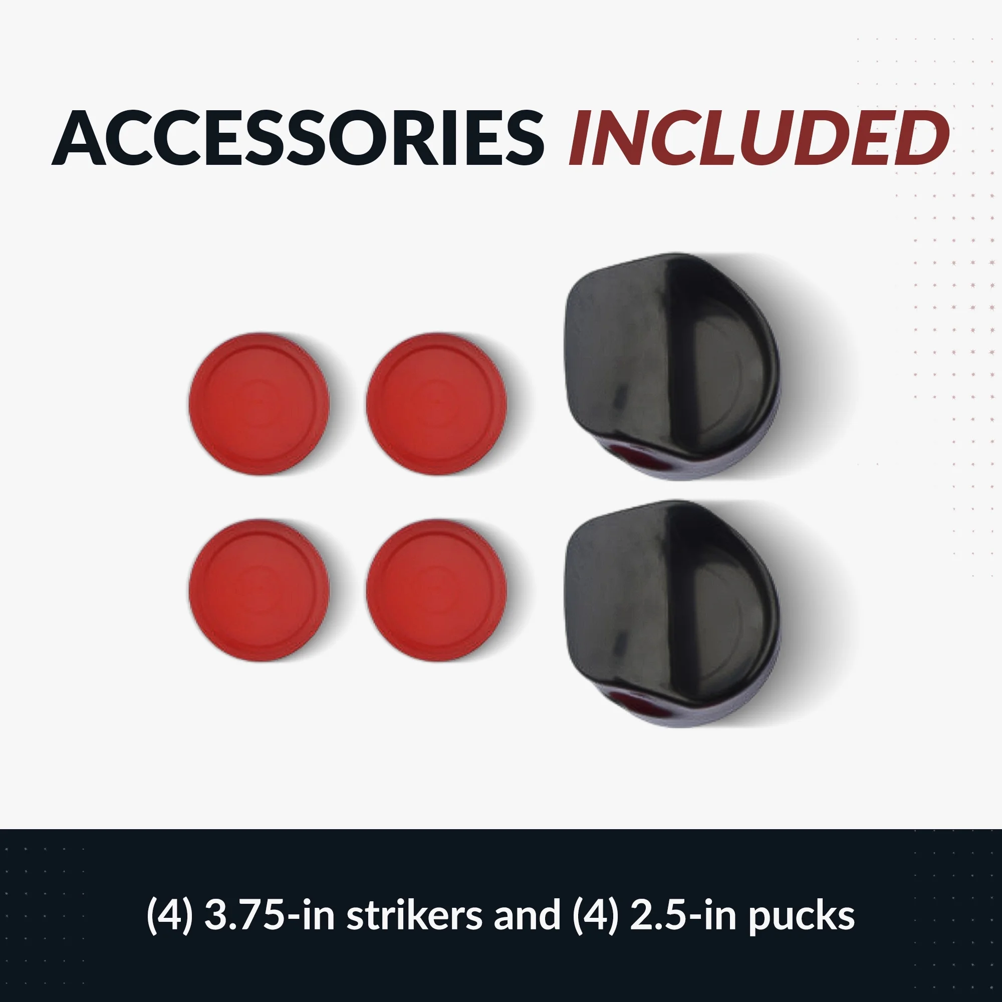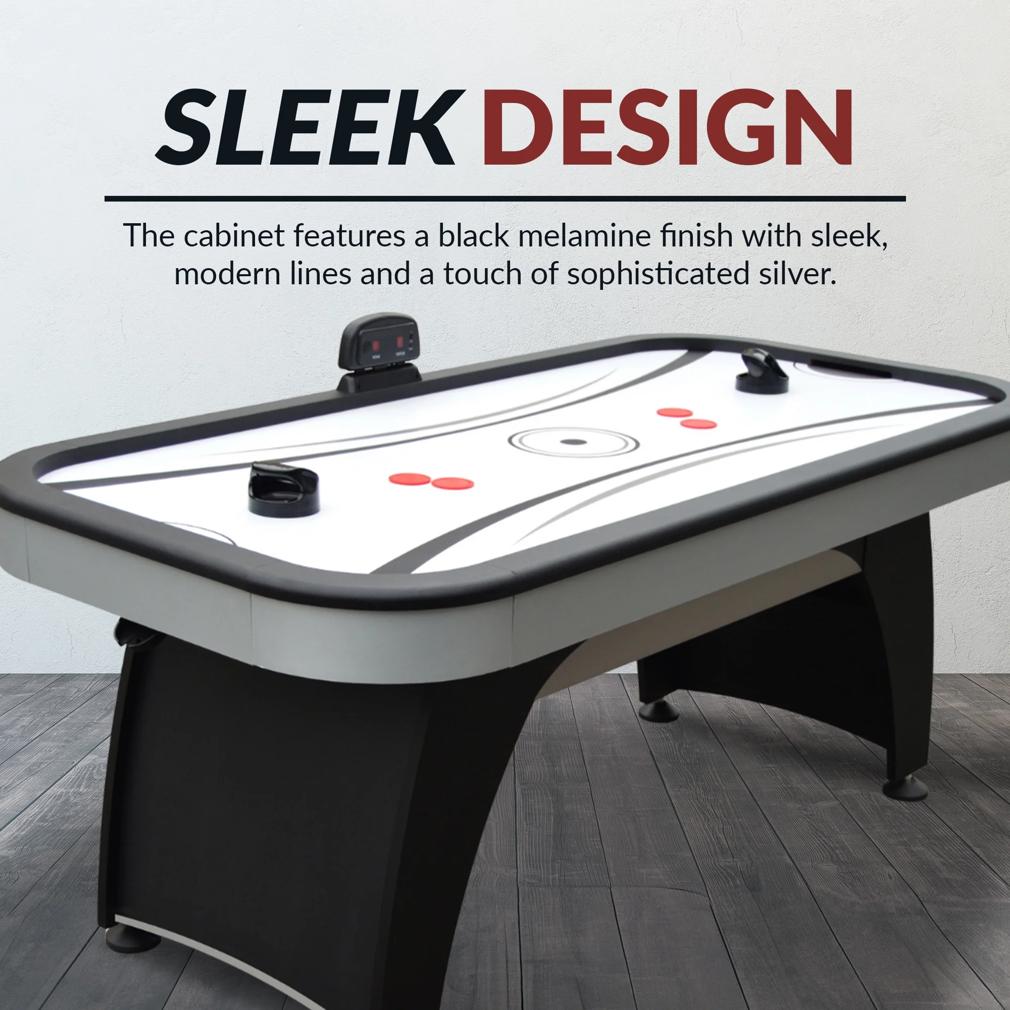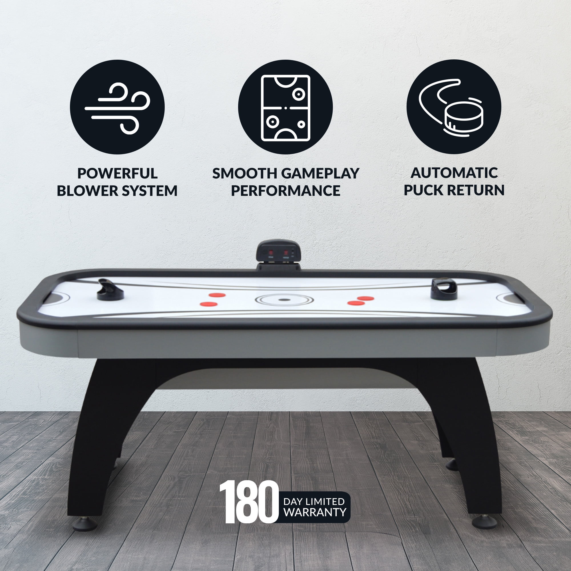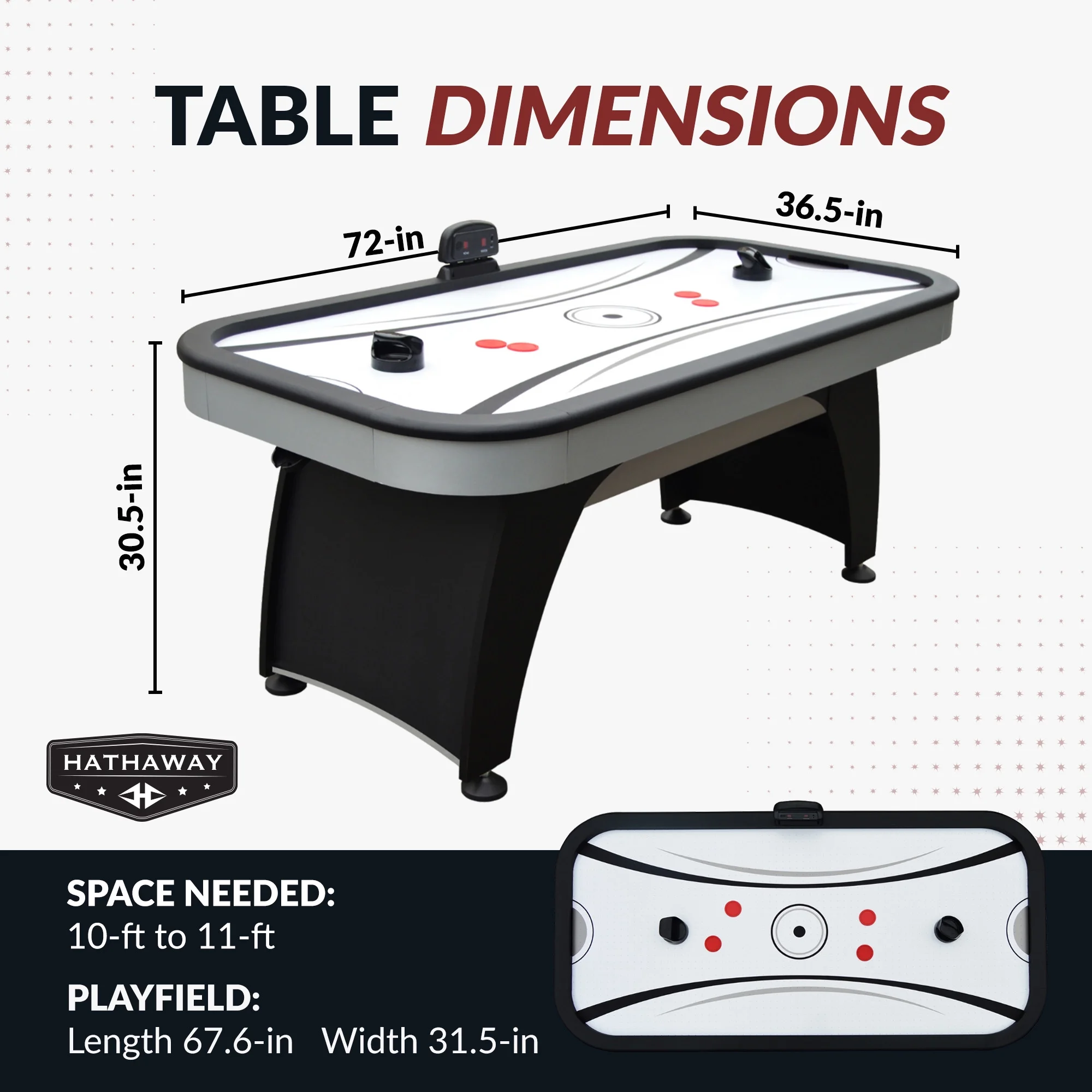 Playing surface: 67-5/8-in L x 31-1/2-in W; Table dimensions: 72.5-in L x 36.5-in W 30.5-in H Arched pedestal leg design with full support end panels provide rugged strength and stability High-gloss, poly-sealed, scratch-resistant, high speed playing surface Sturdy, rock solid CARB certified MDF cabinetry covered in a stylish black and chrome melamine Premium-grade, high output UL-approved 110V/60MHz blower motor Accurate, easy-to-read LED electronic scoring unit Table includes (4) 3.75-in black strikers and (4) 2.5-in red pucks
