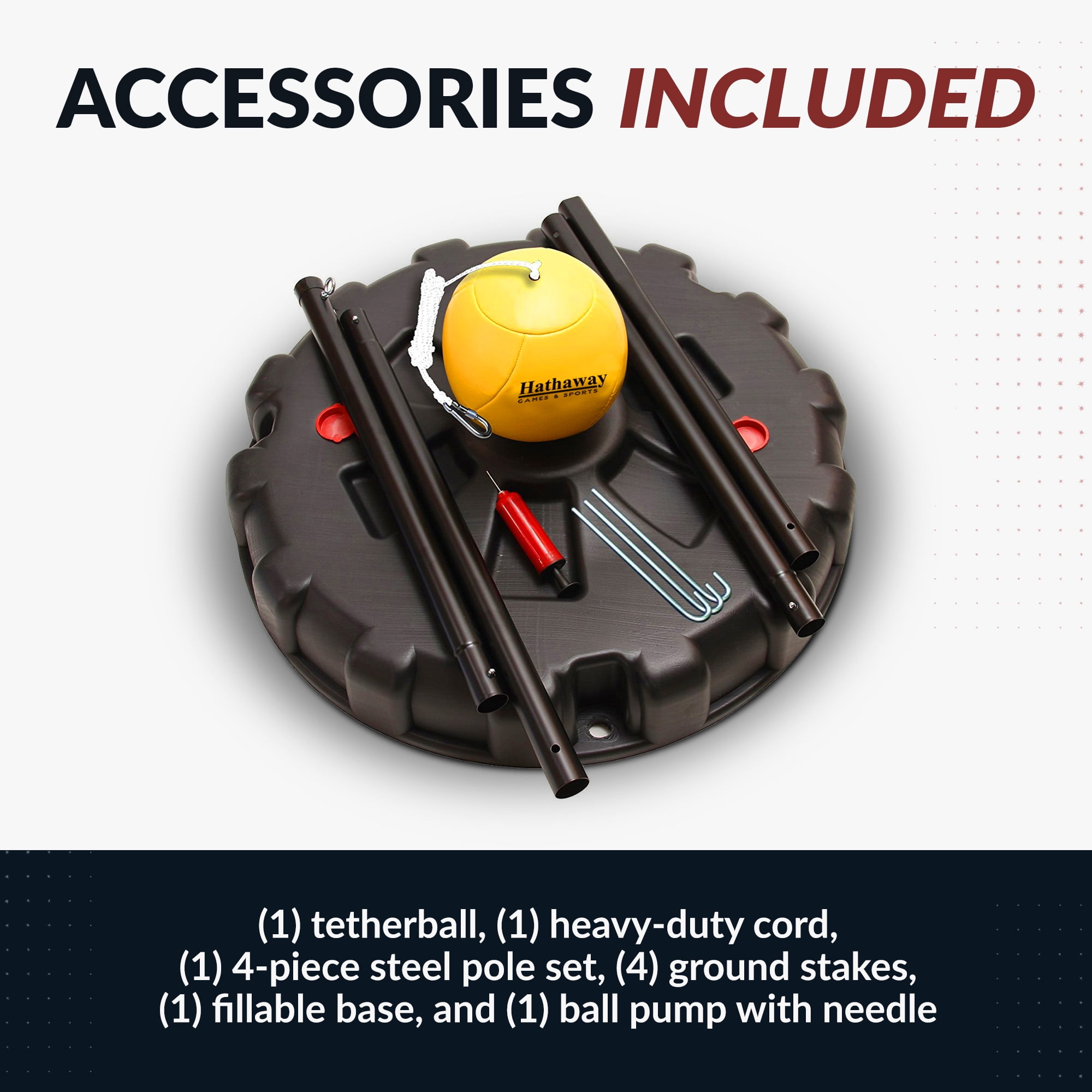 Heavy-duty rope and tetherball Powder-coated, 4-piece interlocking metal pole High-density, polyethylene 30-in round base Fillable base features 11-gallon, sand or water capacity Four – 9.5-in metal ground stakes for added stability Poles store easily in the backside of the base Portable and easy to take along anywhere Assembles in minutes – no tools required Weather and rust-resistant Includes: Tetherball, heavy duty cord, steel poles, ground stakes, ball pump, and needle Dimensions: 30-in W x 30-in L x 108-in H 90-day manufacturer’s warranty
