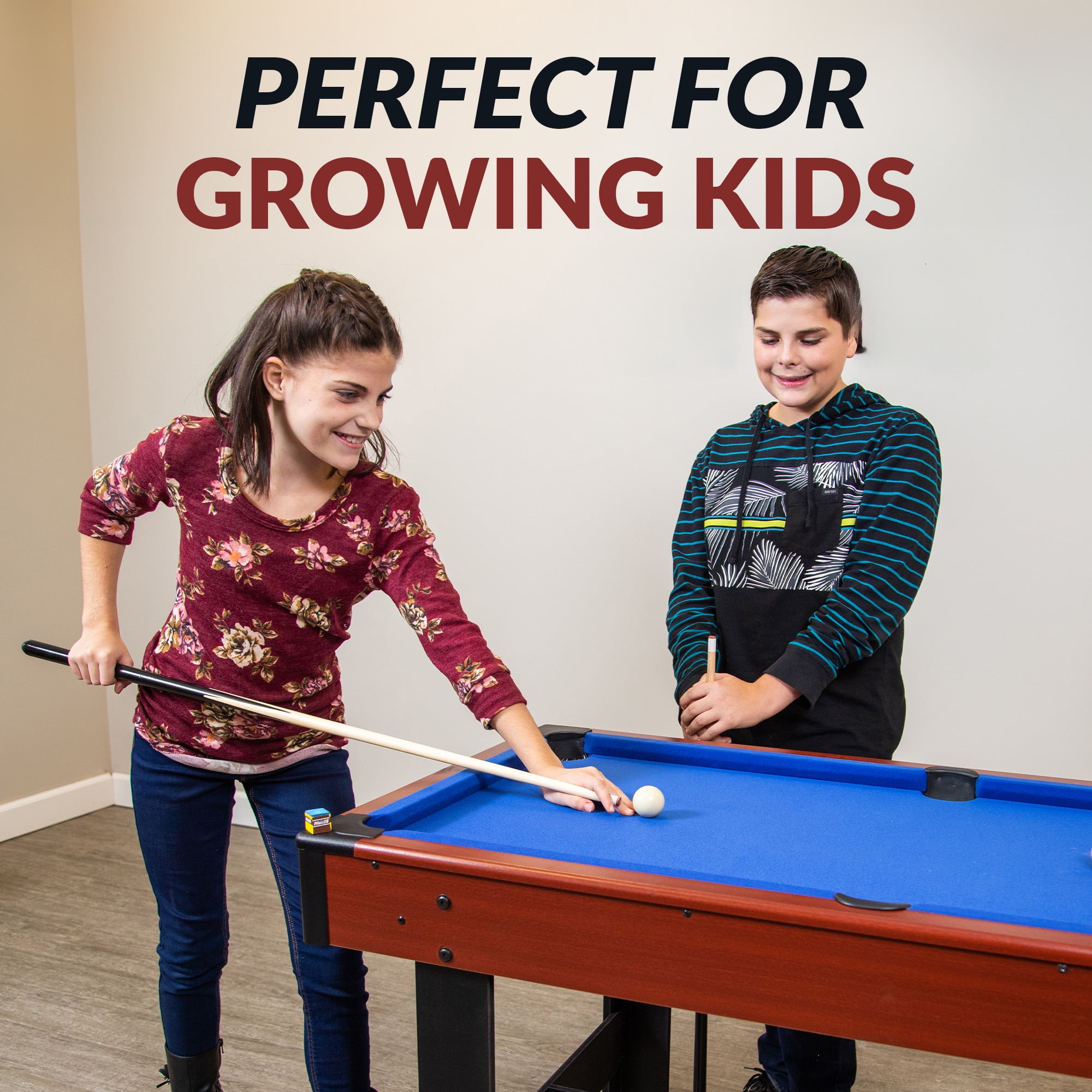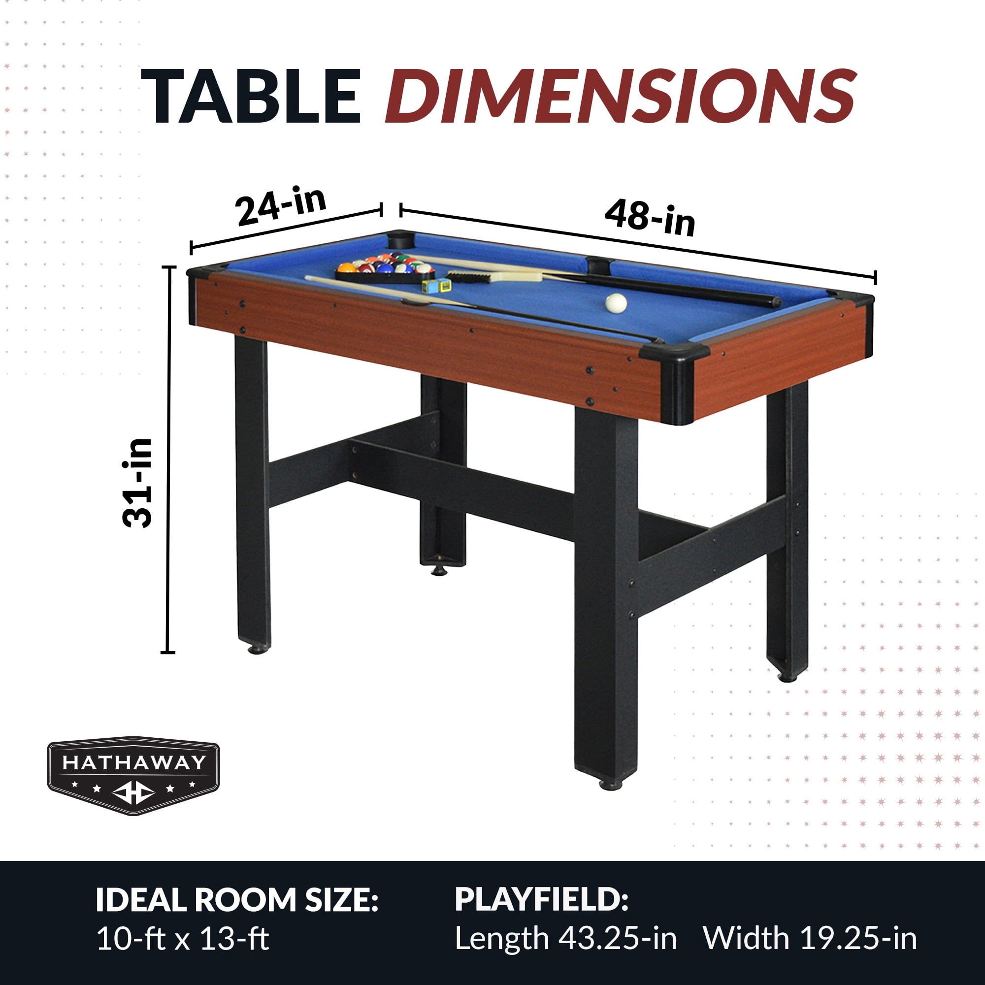 THREE WAYS TO PLAY ? Enjoy competitive pool, fast-paced table tennis and exciting glide hockey in one handsome, sleek table. Easily switch games with lightweight, durable table tops that are easy to remove and store. FAMILY FRIENDLY ? Your family will enjoy hours of fun with this versatile table from Hathaway. Its compact, 48-inch frame is perfect for growing kids. Durable, engineered wood construction ensures it will last for years. READY FOR ACTION ? Start playing the day it arrives with easy installation and loads of accessories. This stylish table comes with everything you need to play pool, glide hockey and table tennis, including all balls, pucks, cues, strikers and paddles. 180 DAY WARRANTY – Your table comes with a 180-day manufacturer warranty. We promise that it will arrive damage free with all necessary parts and accessories. Otherwise, we?ll send replacement parts or an entirely new table at no cost to you. DIMENSIONS – Playing surface: 43.25-in L x 19.25-in W; Table dimensions: 48-in L x 24-in W x 31-in H Fast and easy assembly with complete instruction manual INCLUDES: Includes all game accessories – Billiards: (2) 2-piece 45-in billiard cues, 1 set 1-1/2-in Billiard balls, 2 pieces of chalk, racking triangle, table brush; Hockey: (2) 3-in strikers, (2) 2.5-in pucks; Table Tennis: 2 paddles, 2 balls and net/post set
