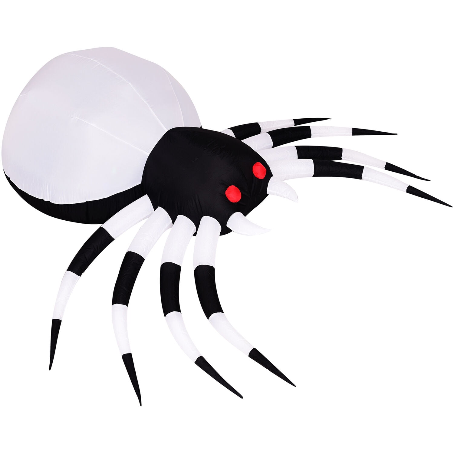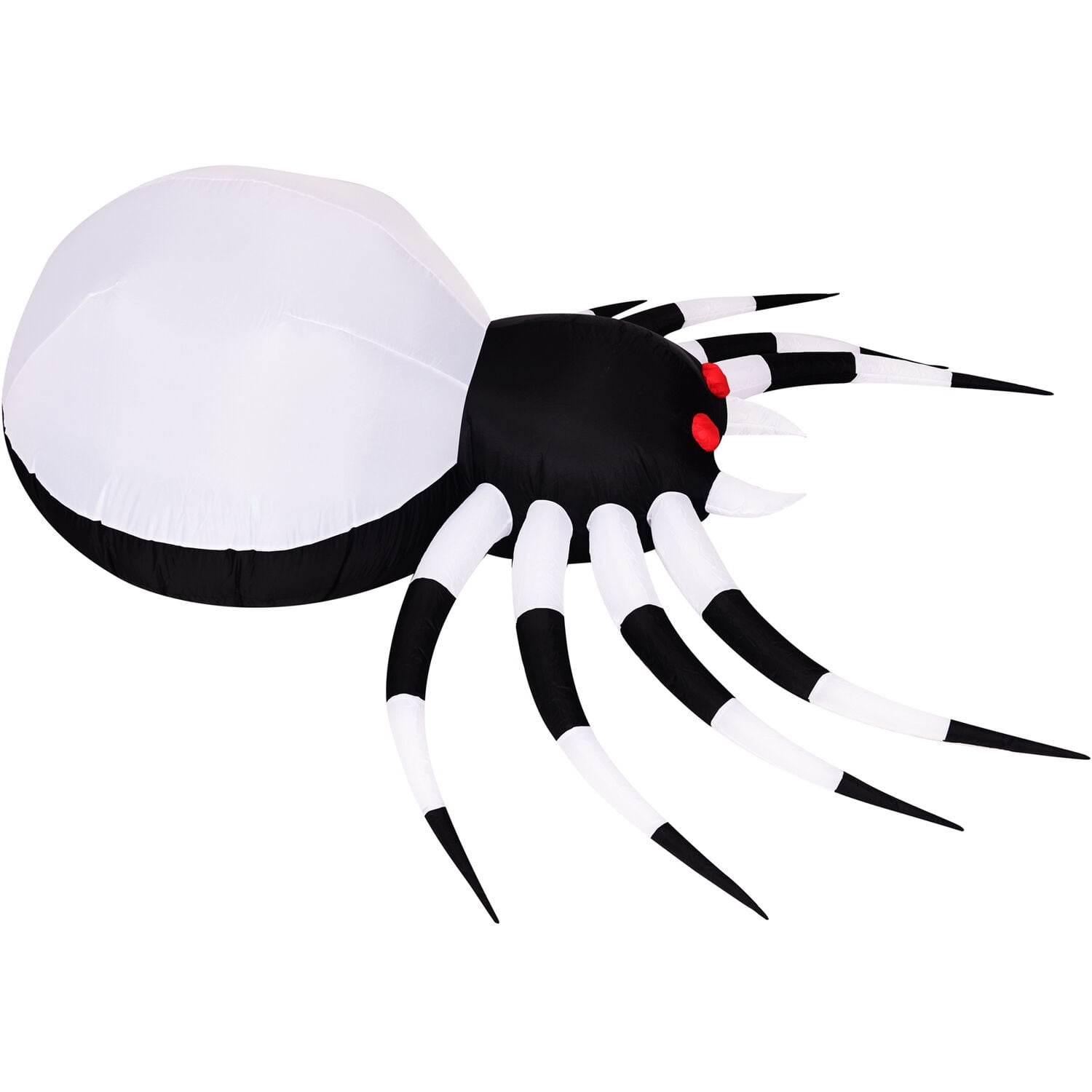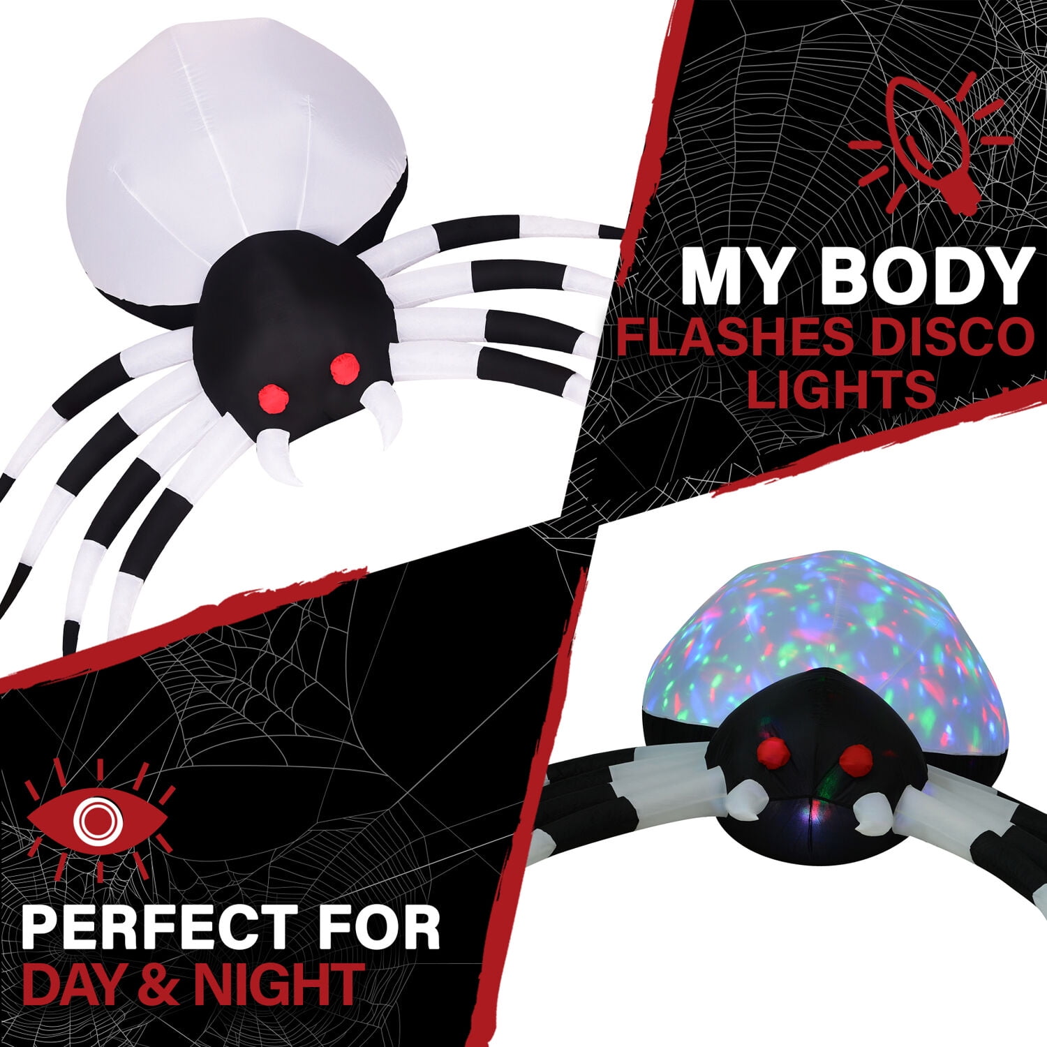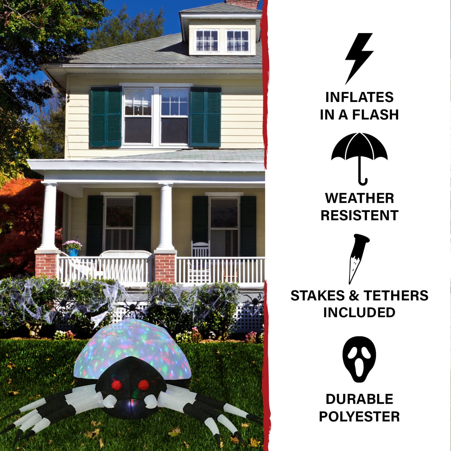 6-ft. wide Inflatable Pre-Lit Spider with Disco Lights by Haunted Hill Farm Inflatable includes internal light, internal fan, two 6-ft. ropes, 6 stakes, and 1 sandbag Self-inflates in seconds for an eye-catching decoration and deflates quickly for convenient storage Durable polyester is UV and weather resistant for use year after year and scare after scare Outdoor setup is quick and easy – unpack it, plug it in, stake it down, and enjoy Pre-lit inflatable has an internal color disco light 1 year warranty with superior customer service Dimensions: 4 ft. L x 6 ft. W x 3 ft. H Power cord length: 6 ft. Bulb type: Disco