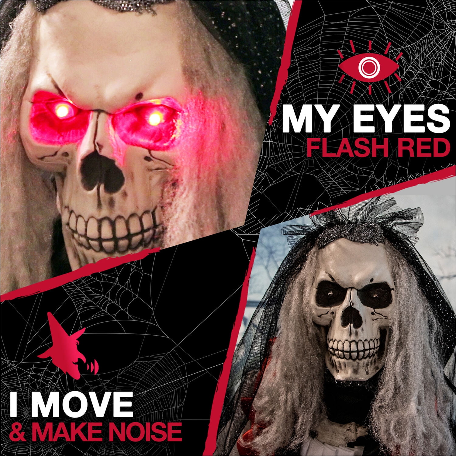 Haunted Hill Farm 65″ H 3.5lbs Life-Size Animatronic Skeleton Bride, Halloween Decor, HHBRIDE-1FLSA Animated 65-in. moaning skeleton bride for a multitude of indoor and outdoor displays Pair her with Bones, our Talking Skeleton Groom – sold separately (HHRPR-1FL) Mona is touch activated – I moan hauntingly, move my arms slowly, and my eyes flash red! Bendable arms with slender bony hands allow you to position the bride in many scary (or funny) poses Life-size Halloween figure includes a sturdy stand with a broad base for standing display