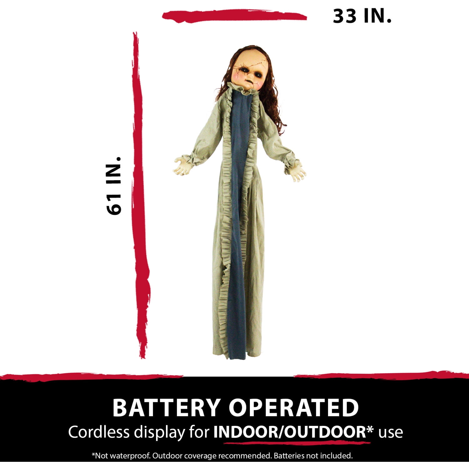 5 ft. animatronic poseable zombie girl for indoor and covered outdoor displays Betty is touch activated – moans hauntingly, arms and head make eerie motions, and red eyes light up Long red locks that falls across her face as she twitches and swirls Cracked and creepy doll-like face Body is adorned with a worn cloak Small childlike hands and arms Poseable arms bend into a variety of scary positions Life-size Halloween figure includes a sturdy stand with a broad base for standing display Battery-operated for convenient placement (3 AA batteries not included) Quick and easy stand assembly Fabric: Burlap dress 1-year limited warranty