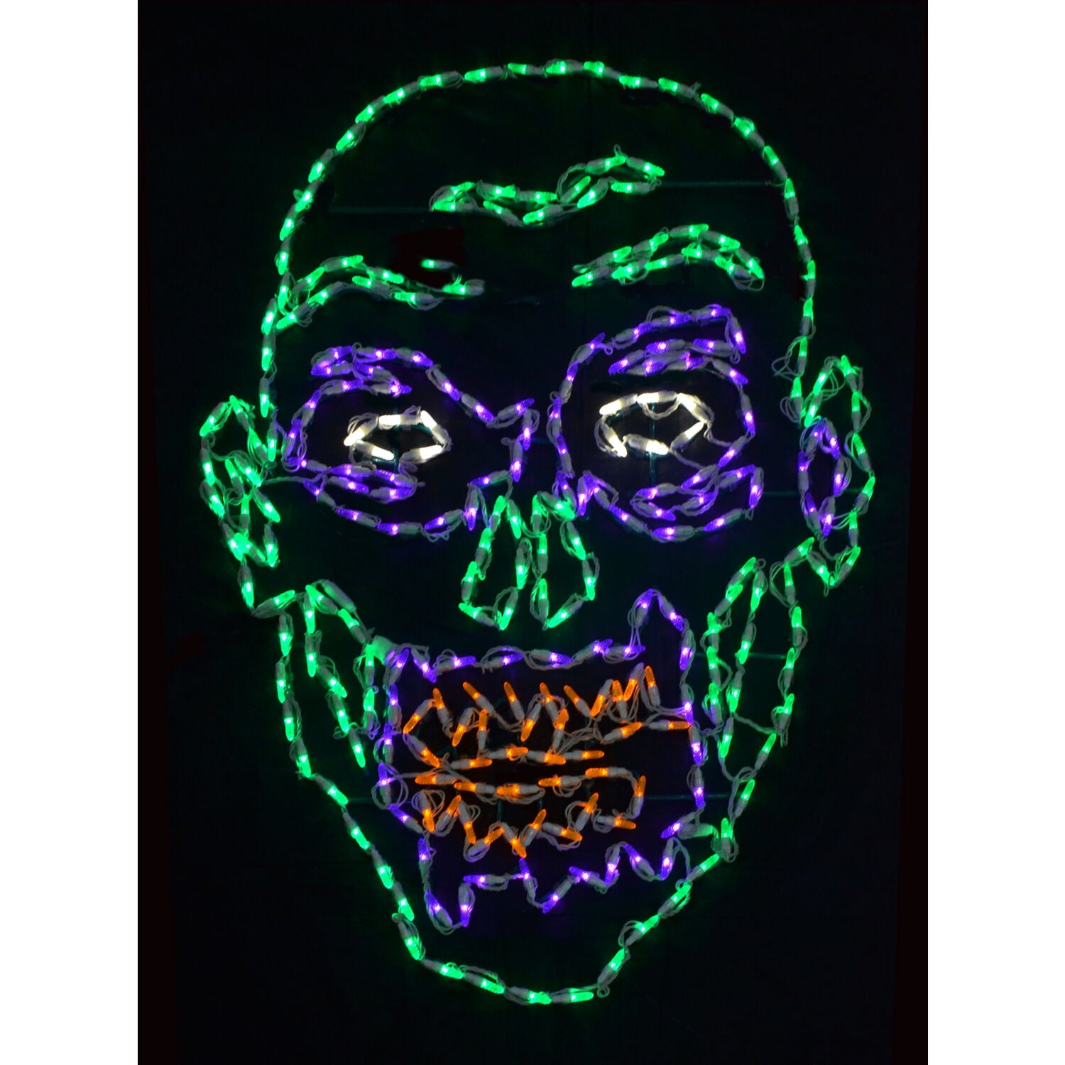 OVERSIZED ZOMBIE FACE YARD LIGHT: Giant scary zombie face measures 28 inches wide x 41 inches tall. Stake it on the lawn or mount it to the house for a spellbinding light show. 270 TOTAL LIGHTS: Faceted, modern LED string light bulbs mounted on powder-coated metal frames are bright and long lasting. CONNECTABLE: Connects to other Halloween lights in the Haunted Hill Farm Collection via male/female power cord for convenient set up. Collect them all! FULLY ASSEMBLED AND WEATHER RESISTANT: Just remove from packaging and display inside or outside to create a festive and spooky lighting scene everyone will love. Stakes and other hanging hardware NOT included. HAUNTED HILL FARM IS HERE TO HELP! If you are not completely satisfied with your purchase, your item was damaged in shipment, or you have questions please feel free to contact our customer service team. Weather-resistant, outdoor Halloween LED light by Haunted Hill Farm The Zombie Face measures 28 inches wide and 41 inches tall 270 faceted LED lights mounted on a white powder-coated metal frame Stake it on the lawn or mount it to the house for a frightening display PLEASE NOTE: Stakes and other mounting hardware are NOT included Light colors: purple, white, orange, and green Bulb type: M8 120 Volts Lights mounted on white metal frame 10 inch cord 1080 bulb life hours Connectable to other sets 1-year limited warranty