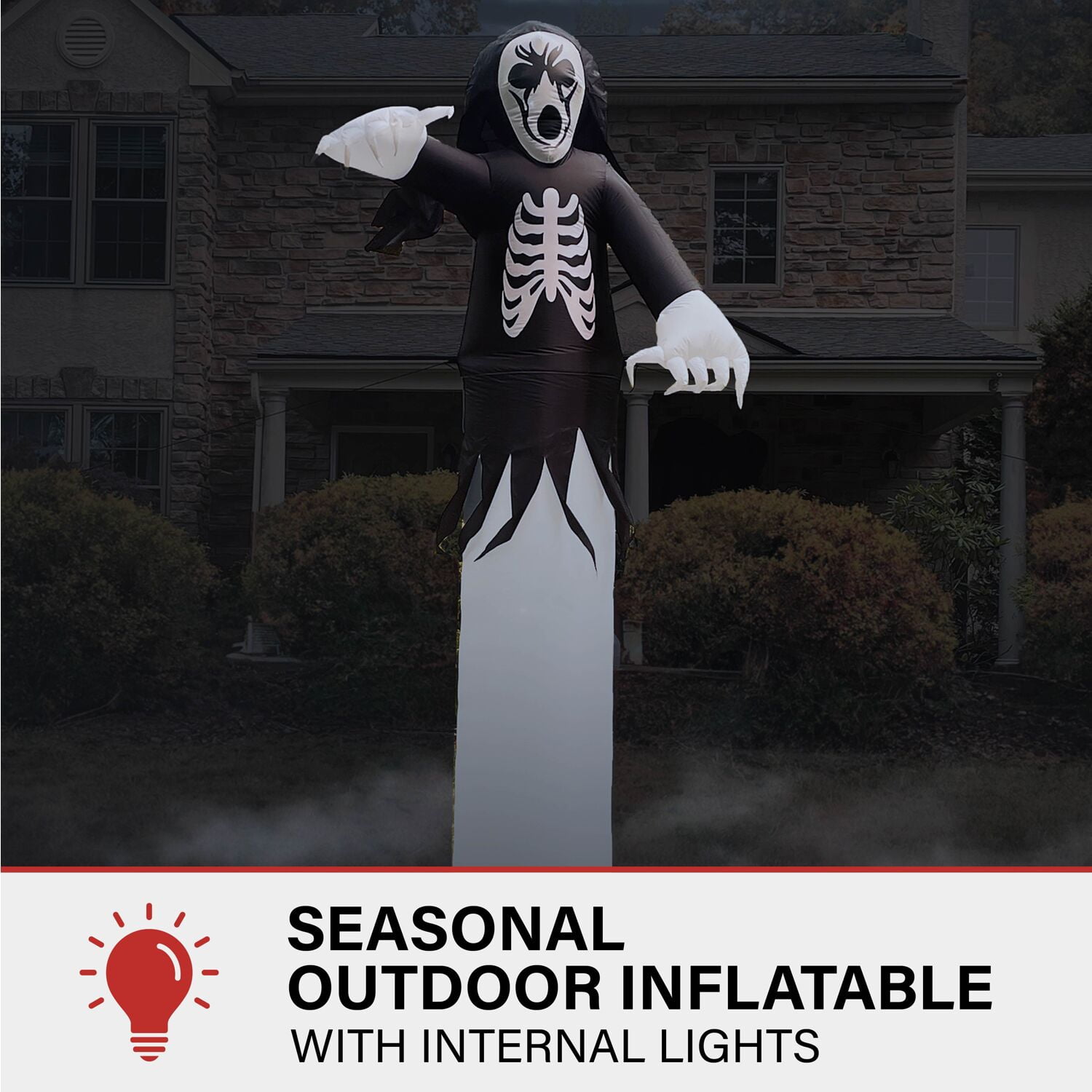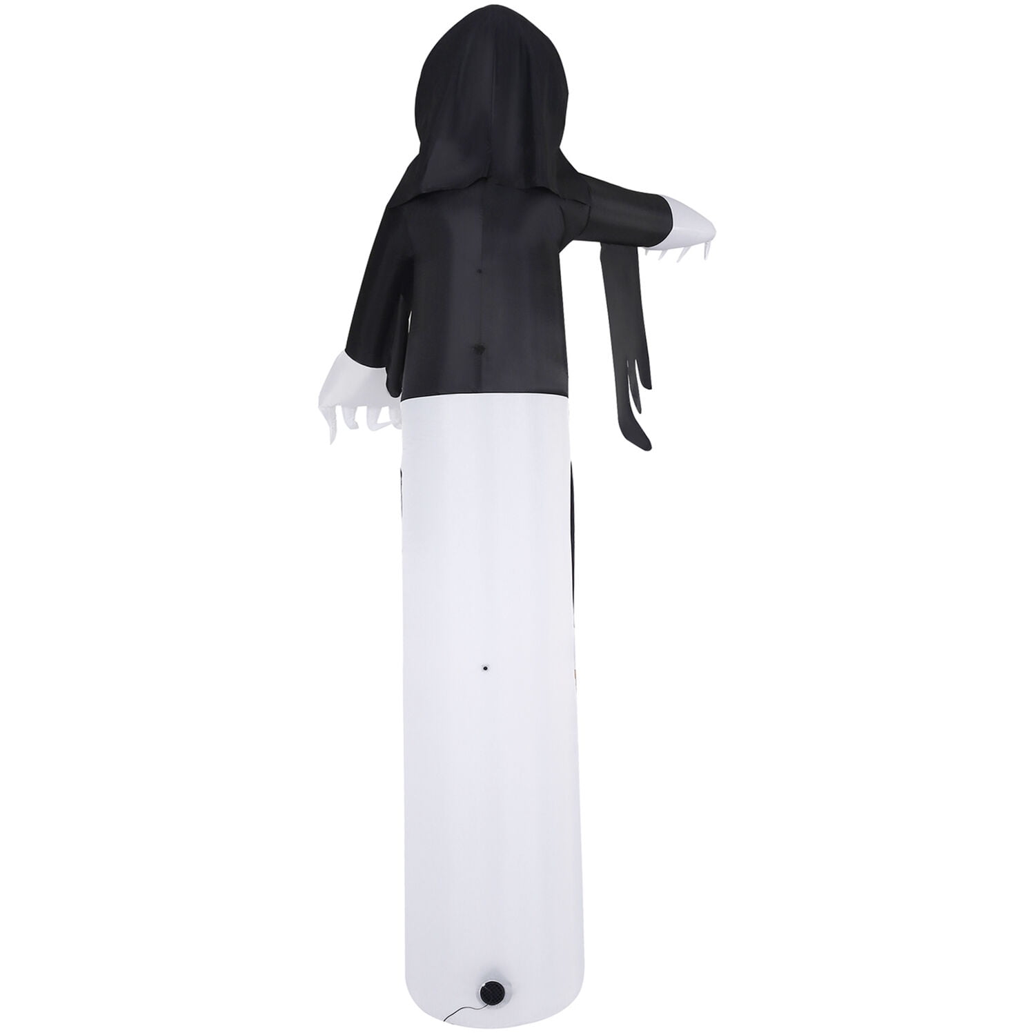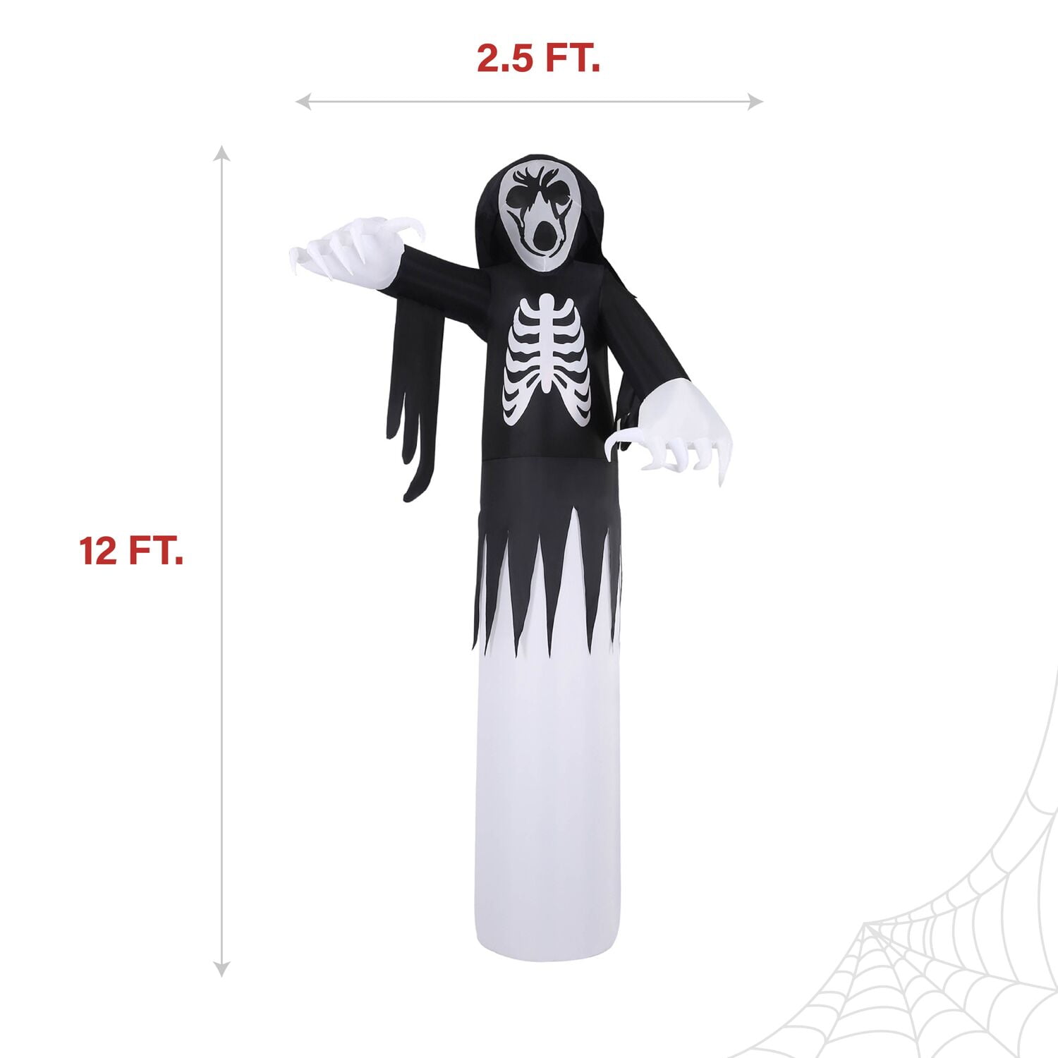 12 feet tall: This huge inflatable is sure to look menacing outside your house to spook visitors and trick-or-treaters. Pre-lit: The grim reaper casts an eerie glow when illuminated with the inflatable’s internal light, so it will be seen on even the darkest of Halloween nights. Easy to assemble: Setup is a breeze with the included ropes and spikes. Simply place the inflatable where desired in your yard, inflate, and secure with stakes. Plug-in operated: Your Halloween blow up will be inflated 90 seconds after being plugged into a standard electrical outlet. Storage bag included: Pack up and store the inflatable at the end of the season with the included storage bag that will keep it clean and safe until it’s time to be set up again. 12-ft. tall pre-lit inflatable grim reaper by Haunted Hill Farm Inflatable includes internal light, internal fan, three 10-ft. ropes, and 5 stakes