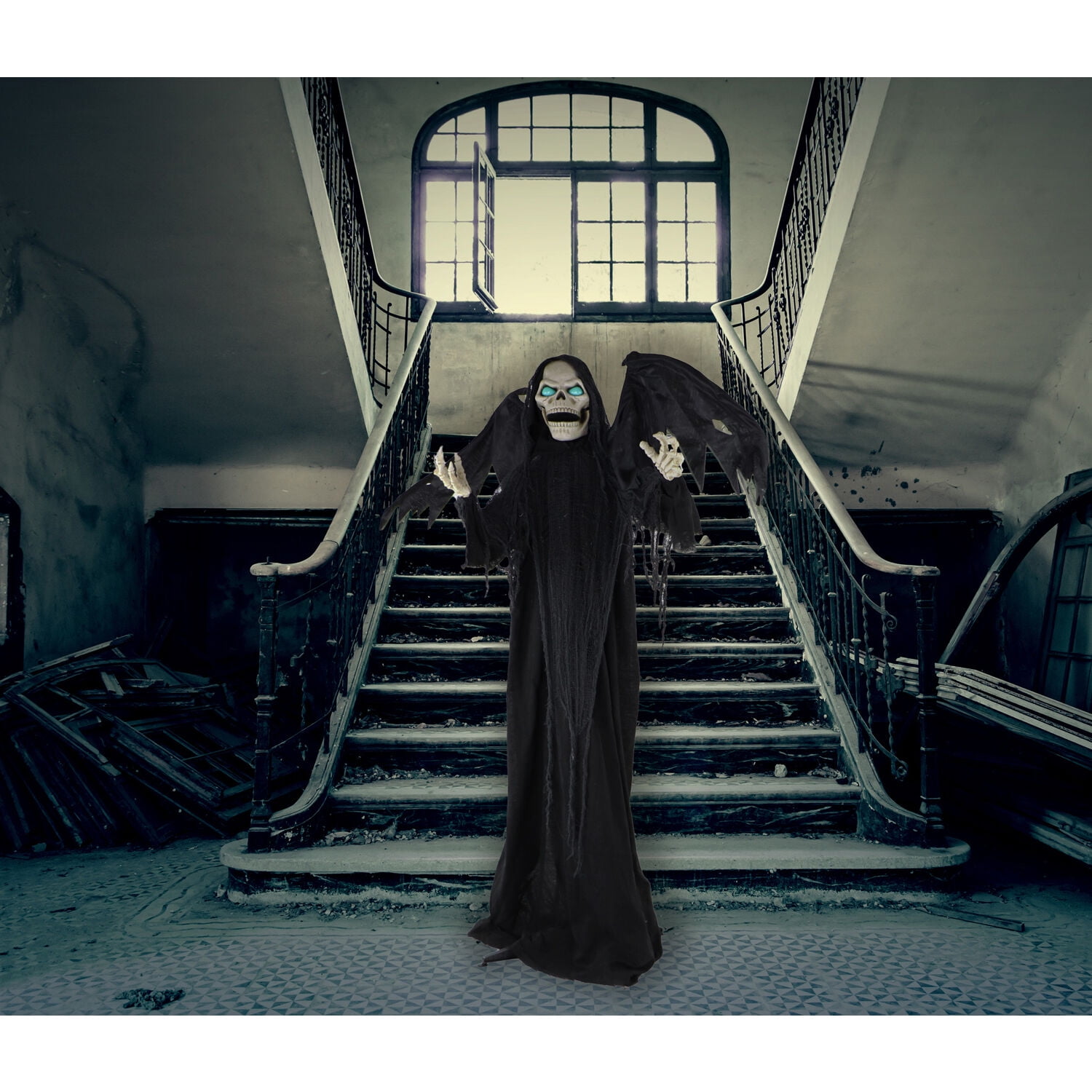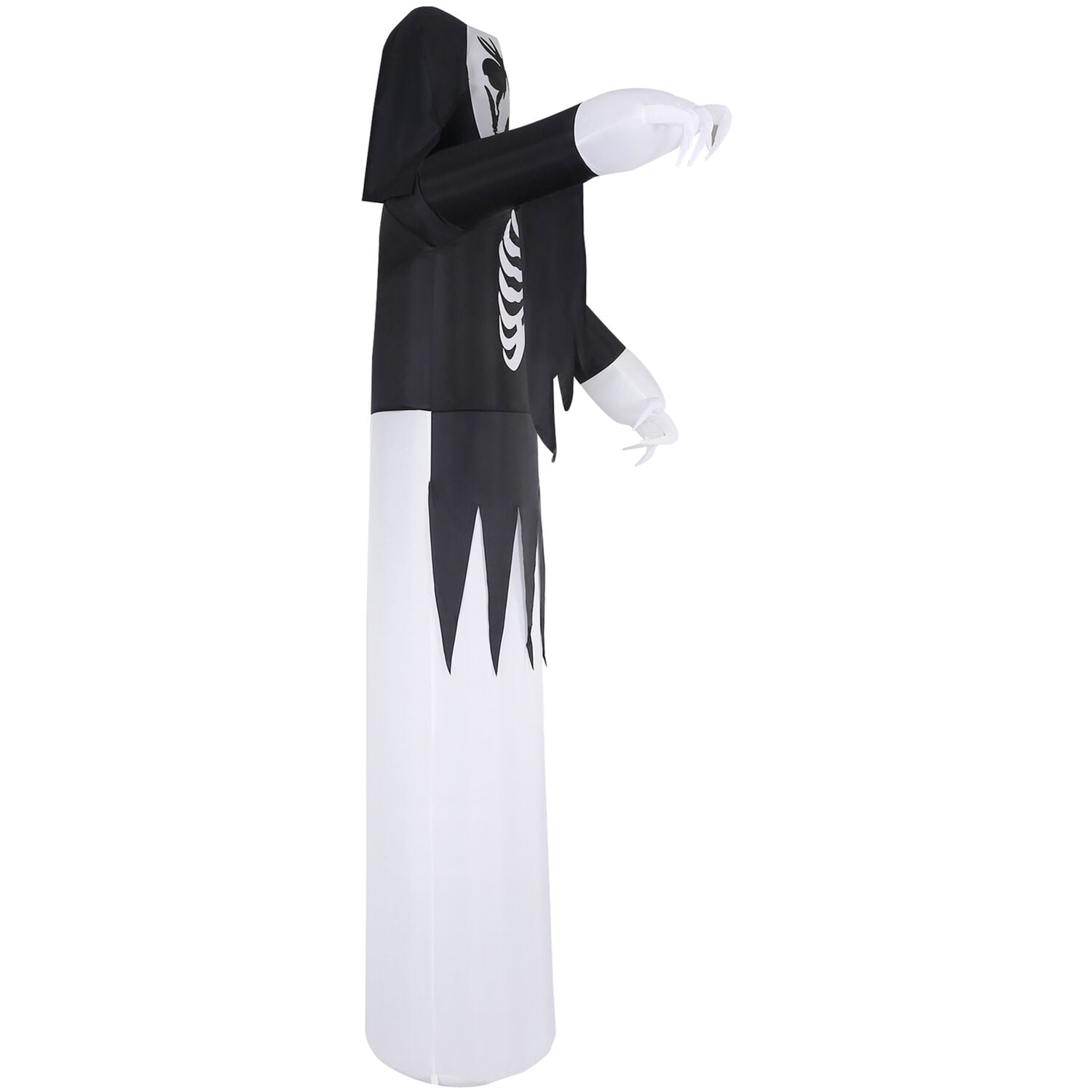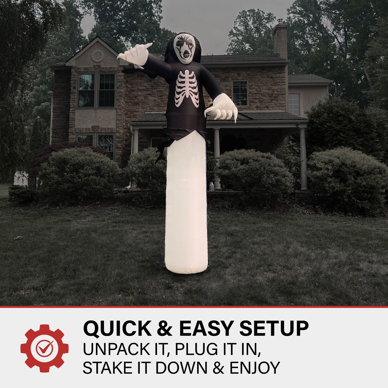 12 feet tall: This huge inflatable is sure to look menacing outside your house to spook visitors and trick-or-treaters. Pre-lit: The grim reaper casts an eerie glow when illuminated with the inflatable’s internal light, so it will be seen on even the darkest of Halloween nights. Easy to assemble: Setup is a breeze with the included ropes and spikes. Simply place the inflatable where desired in your yard, inflate, and secure with stakes. Plug-in operated: Your Halloween blow up will be inflated 90 seconds after being plugged into a standard electrical outlet. Storage bag included: Pack up and store the inflatable at the end of the season with the included storage bag that will keep it clean and safe until it’s time to be set up again. 12-ft. tall pre-lit inflatable grim reaper by Haunted Hill Farm Inflatable includes internal light, internal fan, three 10-ft. ropes, and 5 stakes
