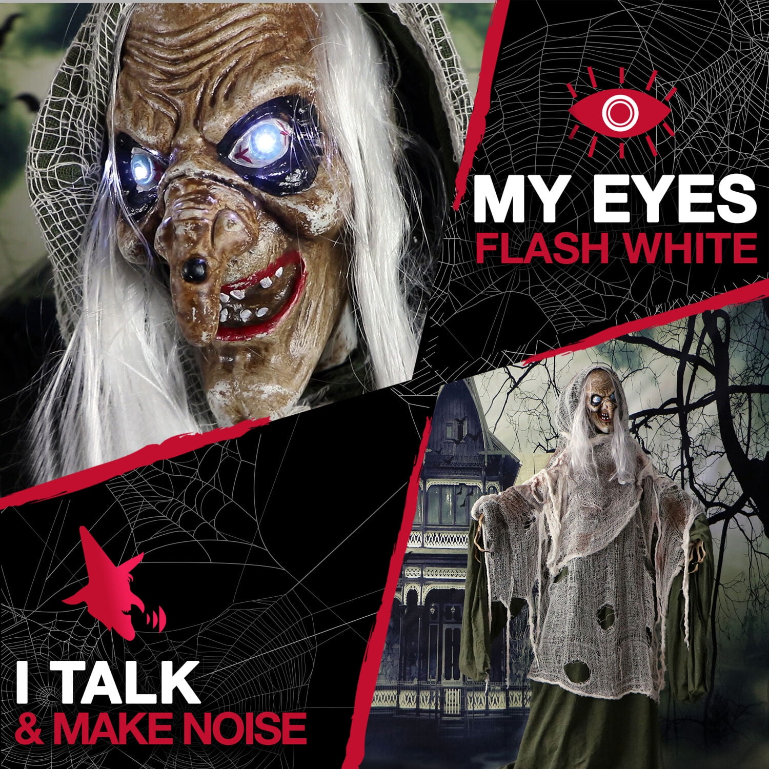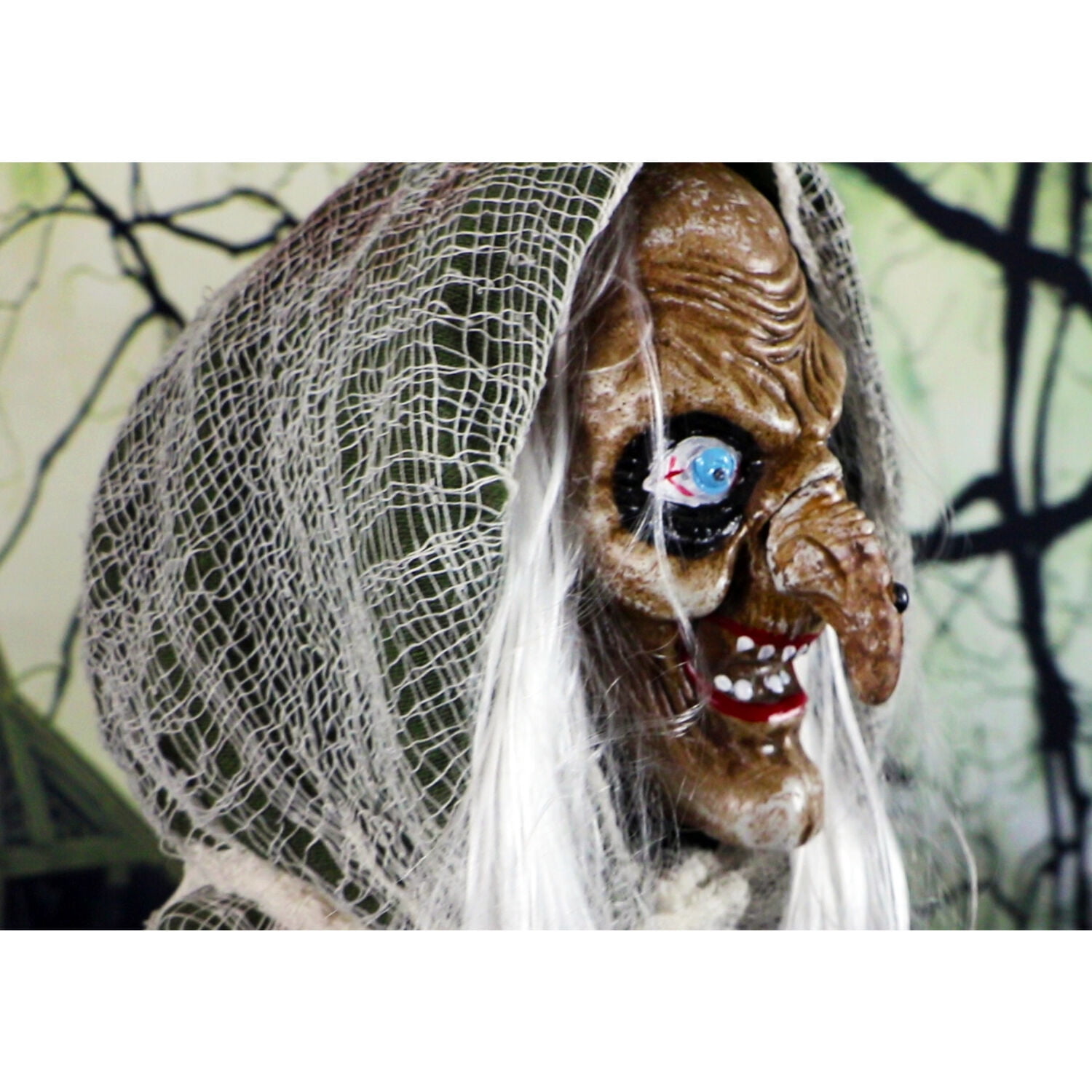 Animated 5-ft. talking evil witch halloween animatronic for a multitude of indoor and outdoor display ideas Touch activated – I talk, my head rotates, and my eyes flash white! Cackling witchy voice greets visitors with three spooky phrases Phrase 1: “Eeeheheehe, beware!” Phrase 2: “You’re not really scared, are you?” Phrase 3: “I would go back if I were you!” Green gauze hooded cloak with white cobweb shroud Realistic facial expressions are designed to look monstrous and eerily lifelike Bendable arms with bony clawed hands allow you to position the witch in many scary (or funny) poses Life-size Halloween figure includes a sturdy stand with a broad base for standing display Optionally, can hang from trees, porch, overhang, etc. (mounting accessories not included) Battery-operated for convenient placement (3 AA batteries not included) Battery case and on/off switch is located in upper back Quick and easy stand assembly – Character is fully assembled 1 year limited warranty