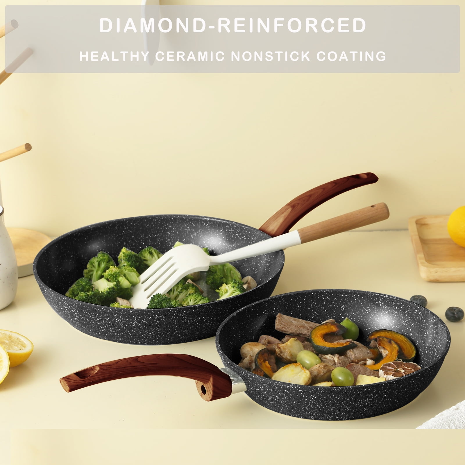Complete Combo Set: 8-piece kitchen set for you daily use: 9.5-inch and 11-inch frying pans, 4.6QT Saute pan with lid, 1.5QT sauce pan with lid, 5QT stock pot with lid Eco-friendly Ceramic Non-Stick Coating—SGS, TUV certified products, our cookware ensures your daily cooking being always safer and healthier. Rivetless interior to prevent snags and food buildup. Just using a soft sponge or dishcloth, you can clear oil stain easily. Please do not use sharp or pointy brush, which would do harm to the non-stick layer. Most stoves avaiable: High magnetic conductive base allows our non stick granite kitchen cookware to work on all cooktops, like Electric, Halogen, Ceramic, Gas, Induction etc.. The Extended and Thicken Bottom Design also makes the cookware durable and heats up quickly and evenly.