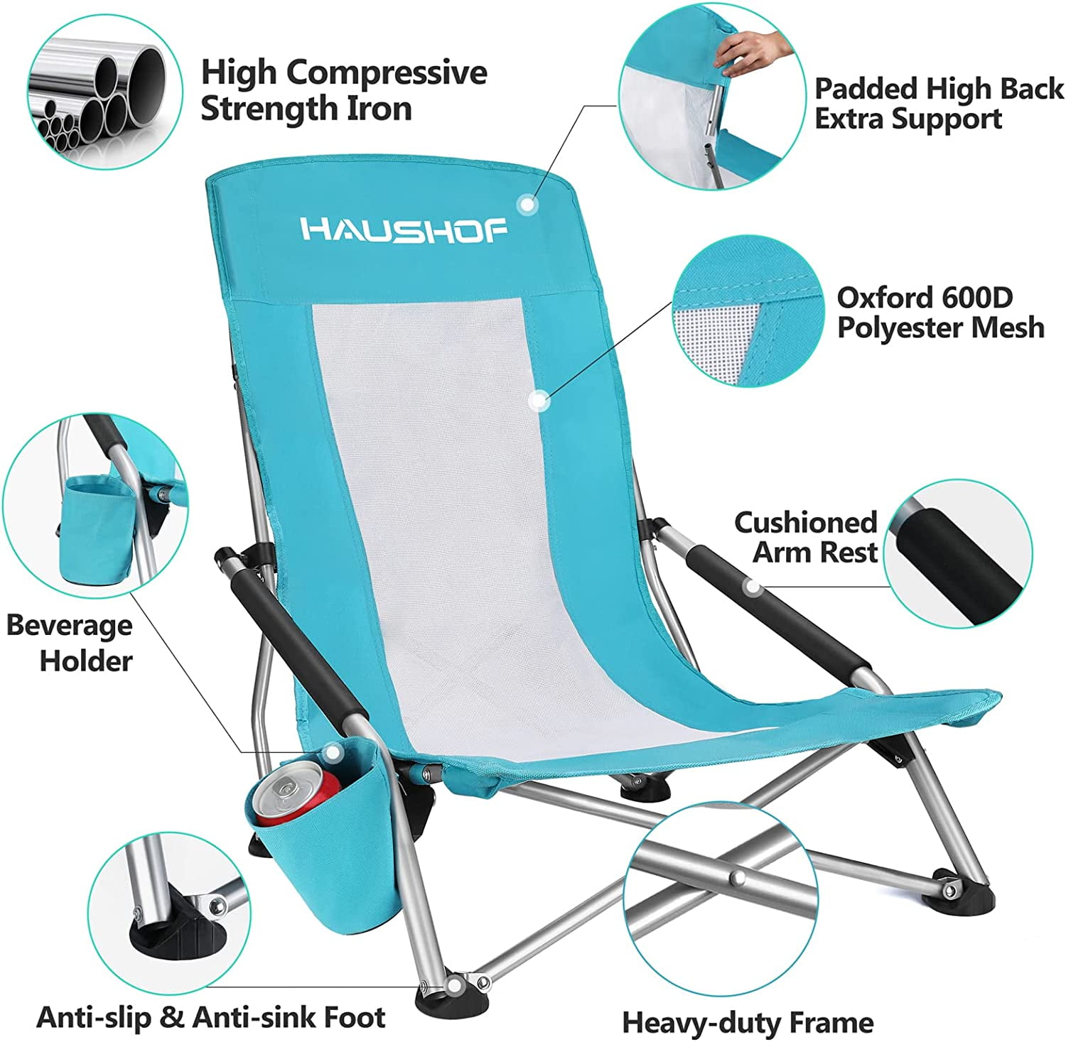 HAUSHOF High Back Beach Chair, Mesh Back Folding Chair, Lightweight Low Seat Camping Chairs with Cup Holder, Carry Bag, Padded Armrest for Outdoor Beach Lawn Camping Picnic Festival, Blue
