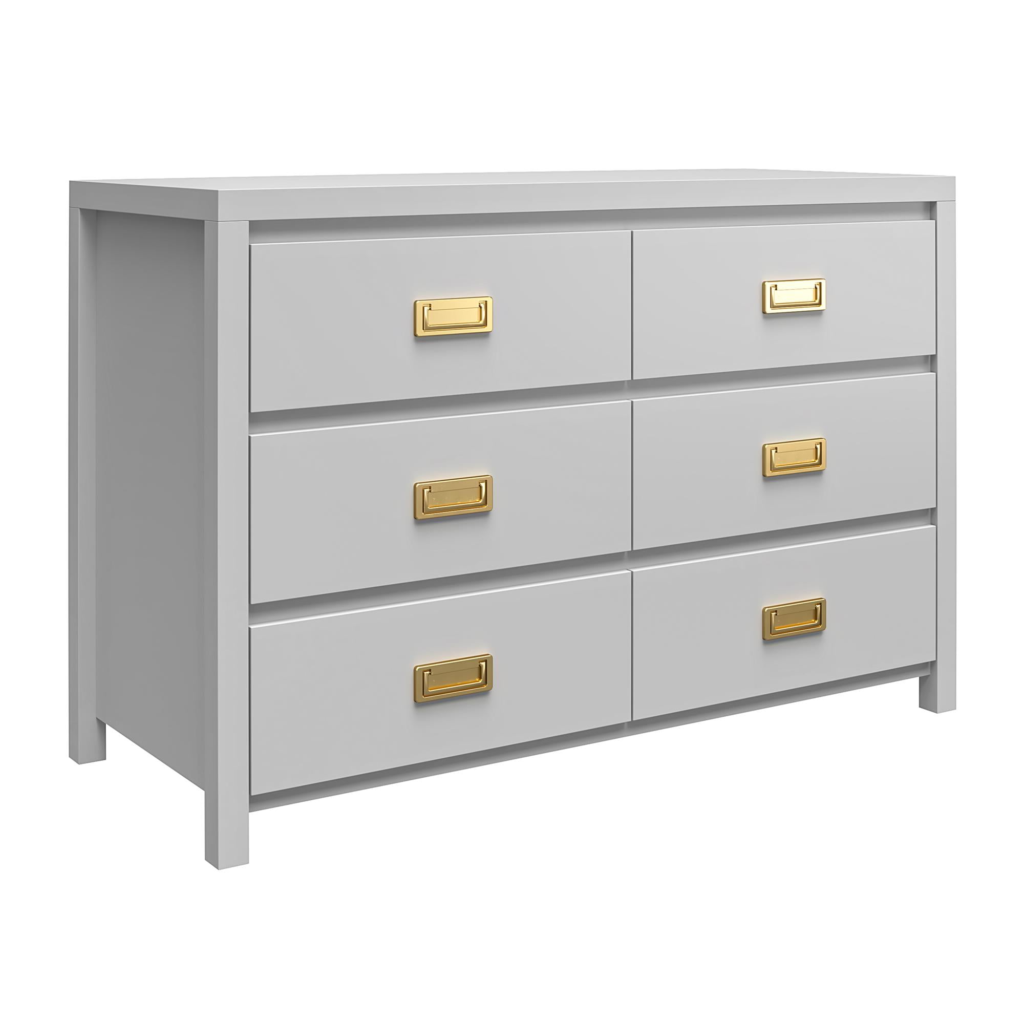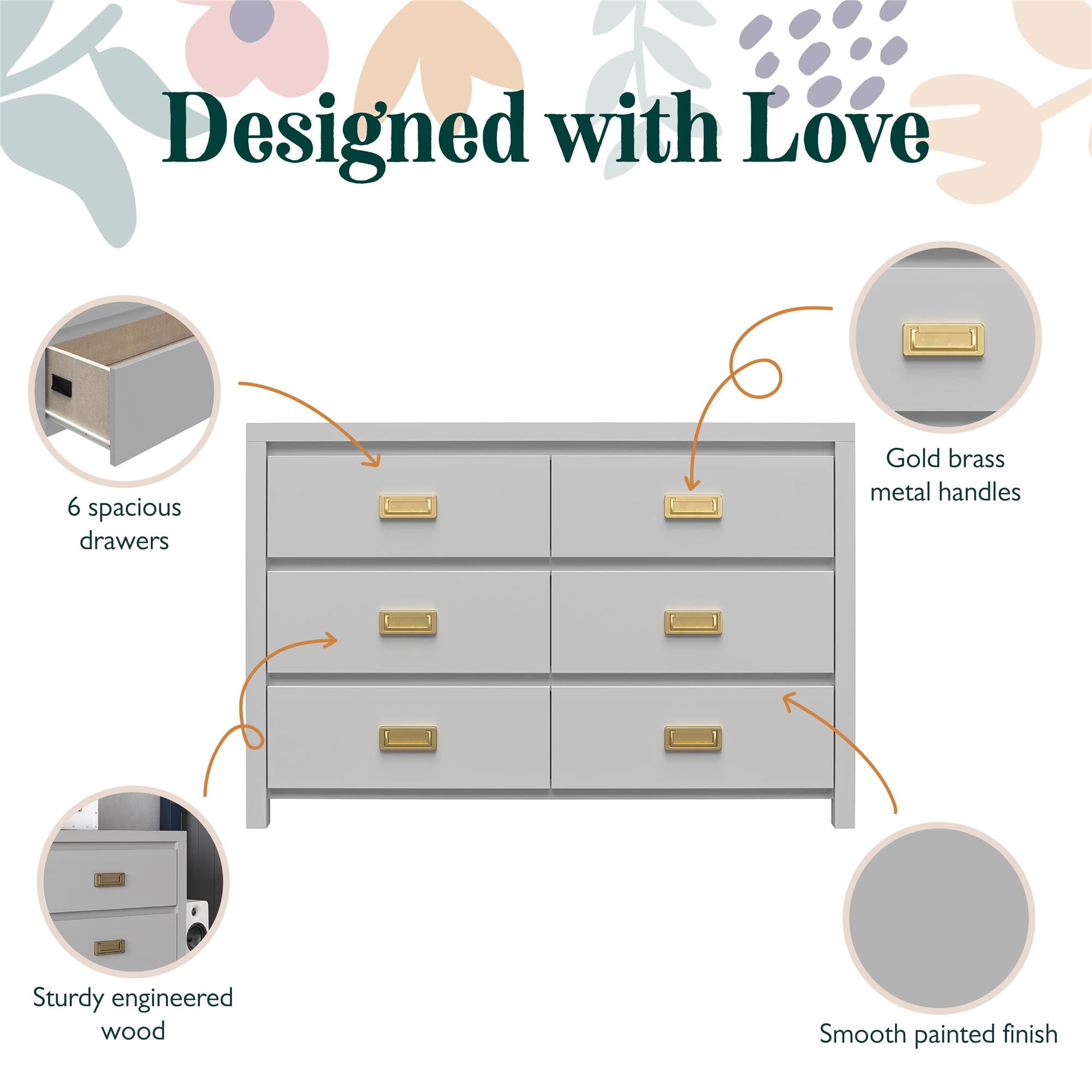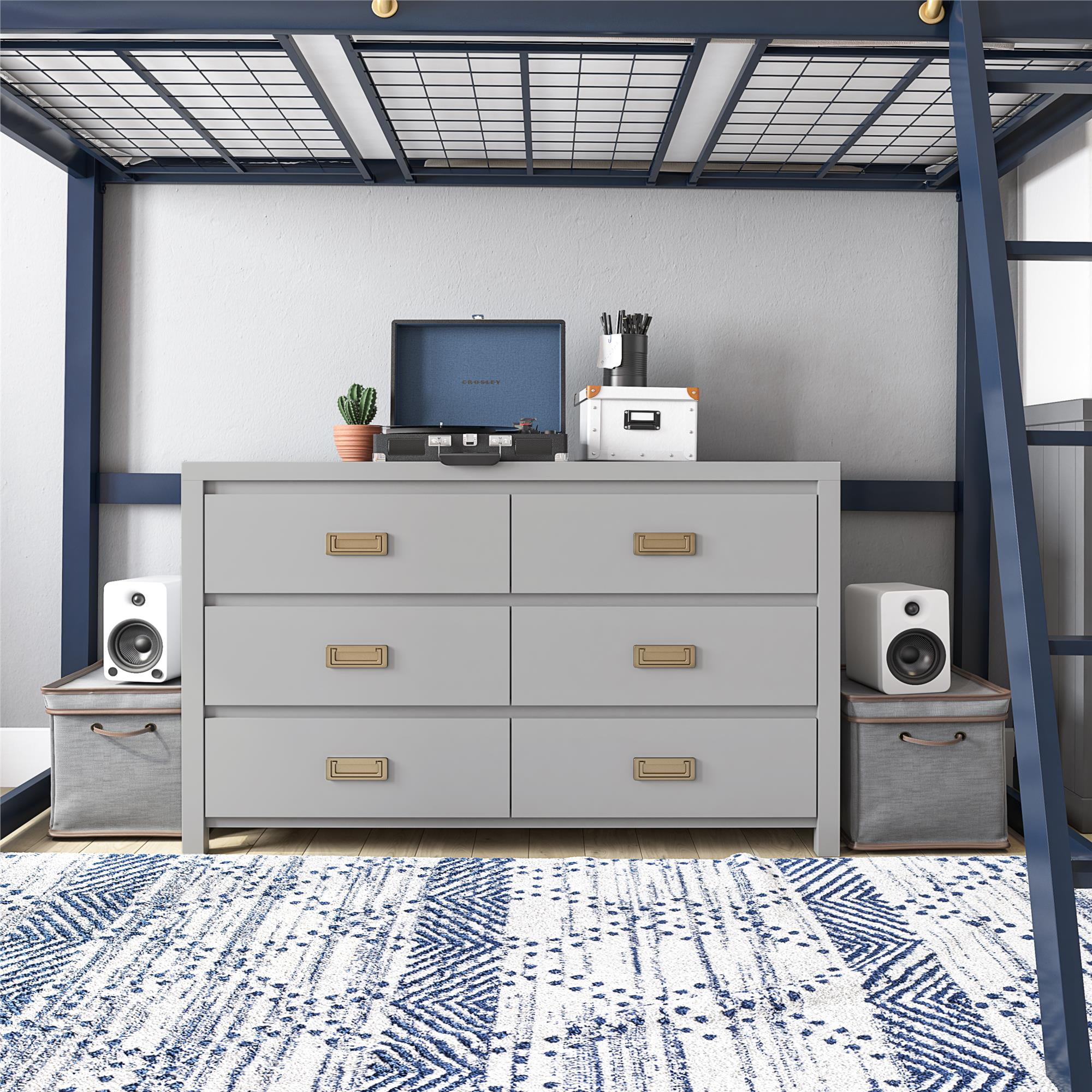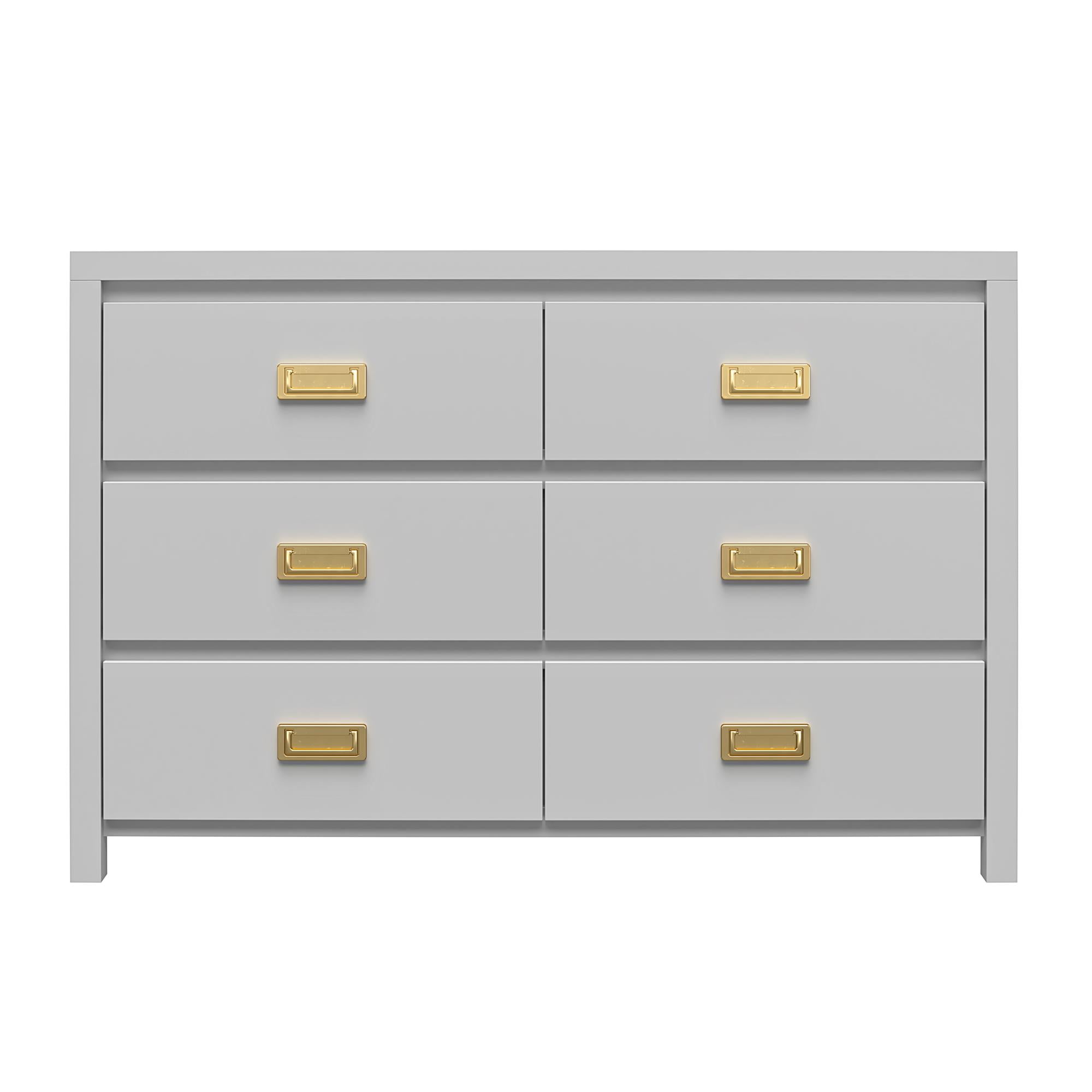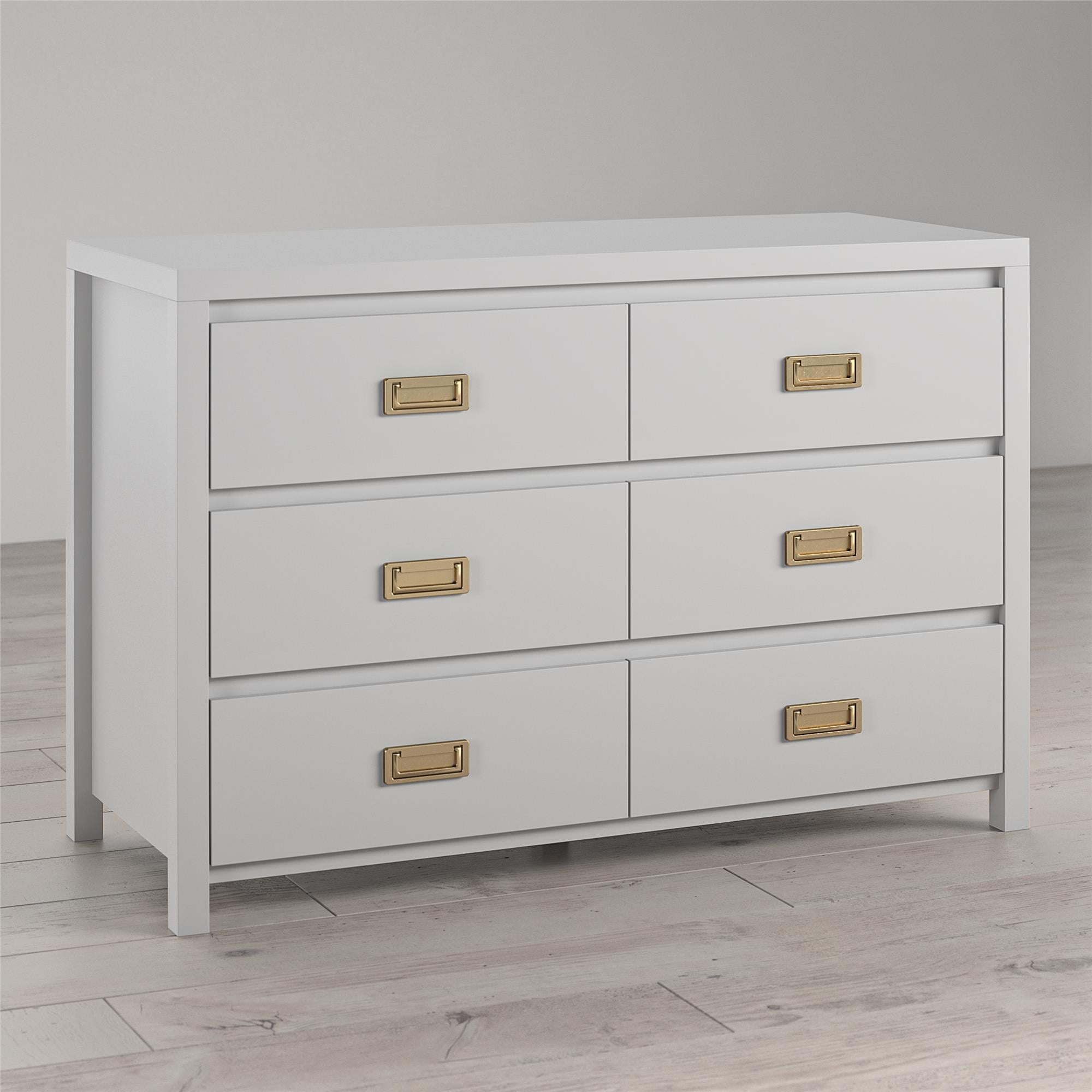 KIDS’ STORAGE DRESSER CONSTRUCTION AND MATERIALS: Constructed from painted Medium Density Fiberboard (MDF) with gold campaign-style handles, this dresser offers a visually appealing aesthetic VISUAL APPEAL AND DURABILITY: This 6-drawer dresser combines sturdy durability with an attractive campaign-style design, making it a perfect addition to any child’s room WEIGHT CAPACITY AND STORAGE: The top surface can hold up to 75 lbs., ideal for decorative items or small appliances; Each drawer supports up to 35 lbs., providing sturdy storage for clothing and accessories while ensuring durability ENHANCED SAFETY: This unit is Sturdy Compliant and offers a range of safety features, including anti-tip mechanisms, counterweights, interlock systems, and drawer stoppers to prevent tipping injuries