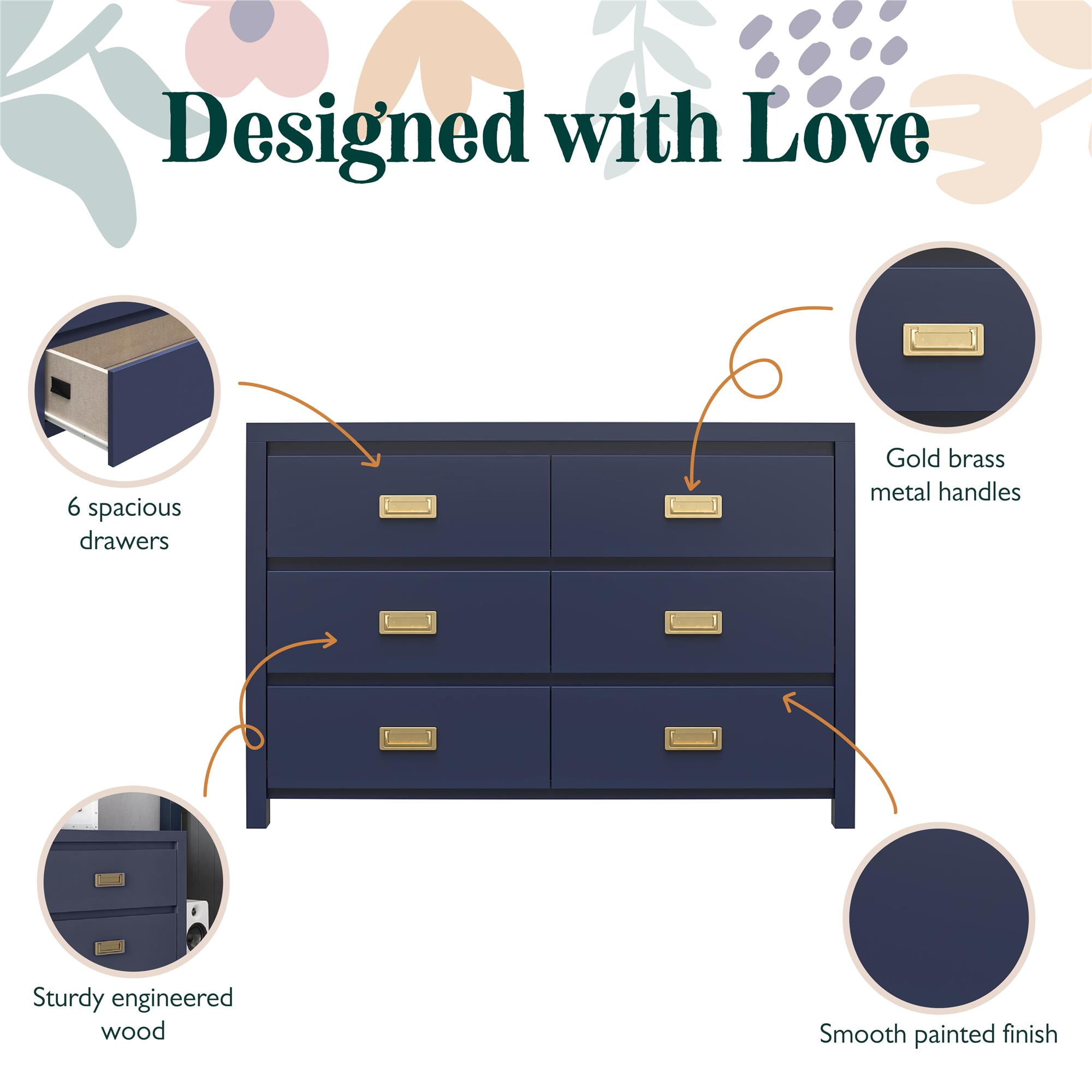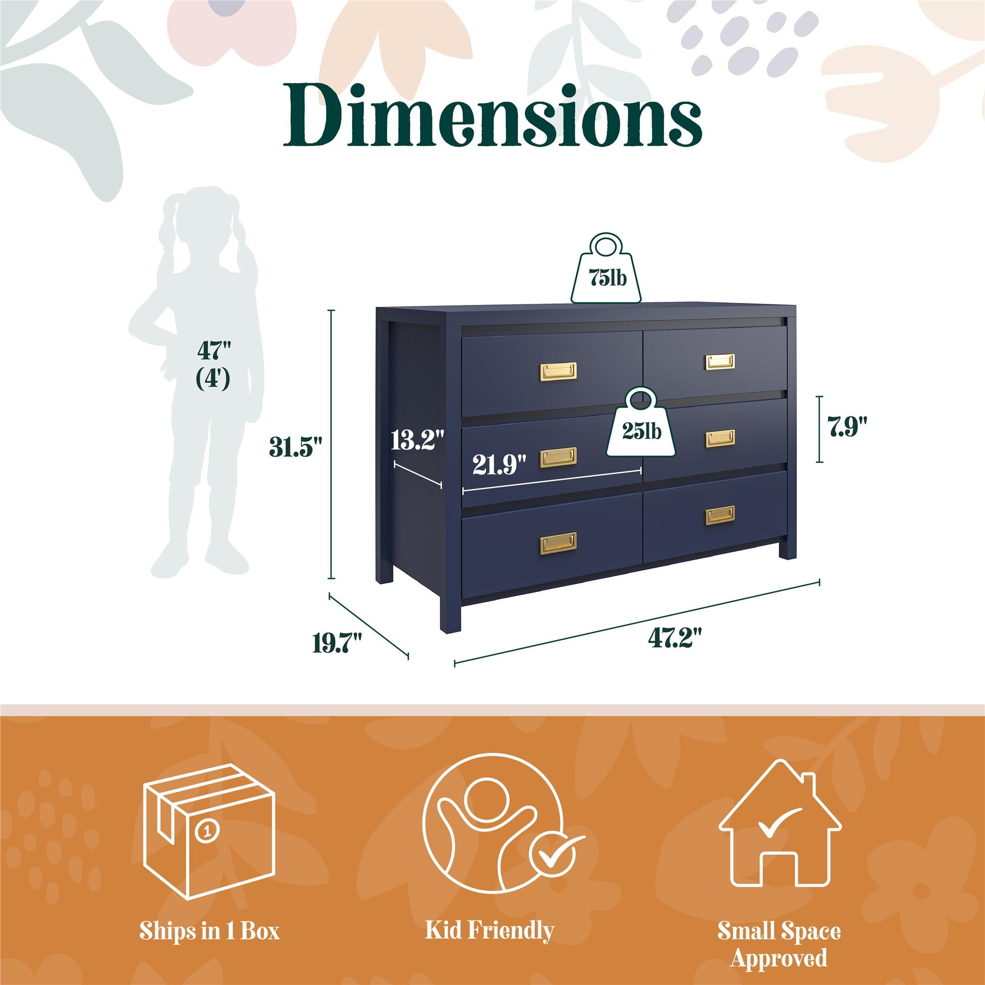 KIDS’ STORAGE DRESSER CONSTRUCTION AND MATERIALS: Constructed from painted Medium Density Fiberboard (MDF) with gold campaign-style handles, this dresser offers a visually appealing aesthetic VISUAL APPEAL AND DURABILITY: This 6-drawer dresser combines sturdy durability with an attractive campaign-style design, making it a perfect addition to any child’s room WEIGHT CAPACITY AND STORAGE: The top surface can hold up to 75 lbs., ideal for decorative items or small appliances; Each drawer supports up to 35 lbs., providing sturdy storage for clothing and accessories while ensuring durability ENHANCED SAFETY: This unit is Sturdy Compliant and offers a range of safety features, including anti-tip mechanisms, counterweights, interlock systems, and drawer stoppers to prevent tipping injuries