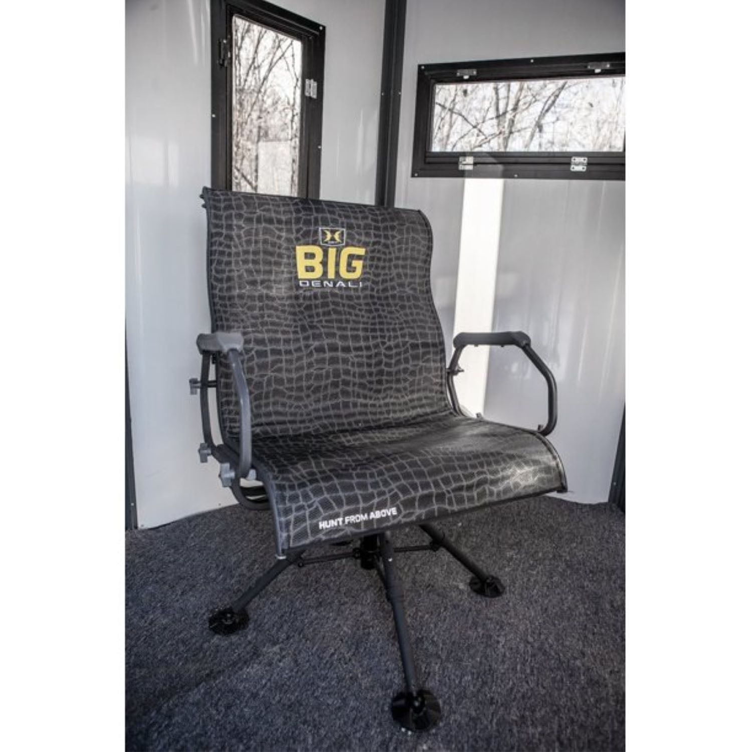 Big Denali Luxury Blind Chair is comfortable and contoured for a superior seating option Rotate effortlessly into position with zero-noise performance 360-spin Features 4 oversized pivoting feet for all-terrain stability Portable legs easily remove and fold compact for convenient transportation Great to use for camping, hunting, and fishing, backpacking, and more Material: Mesh Color: Black Dimensions: (L x W x H) 42 x 22.5 x 27.5 inches Weight: 24.5 pounds