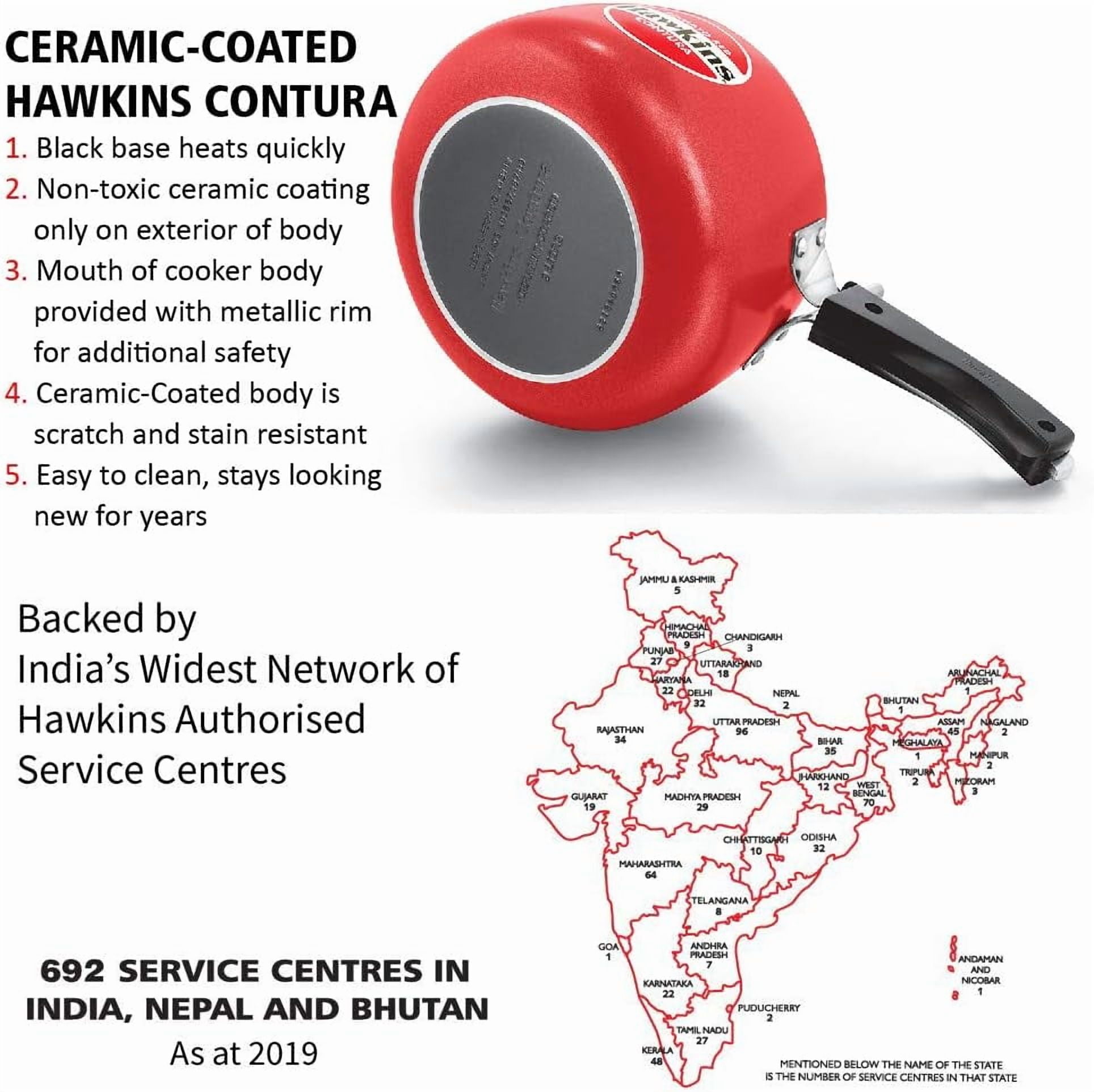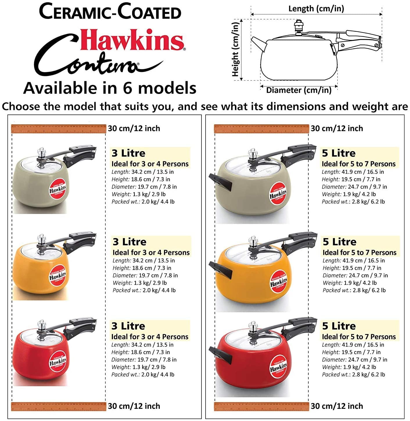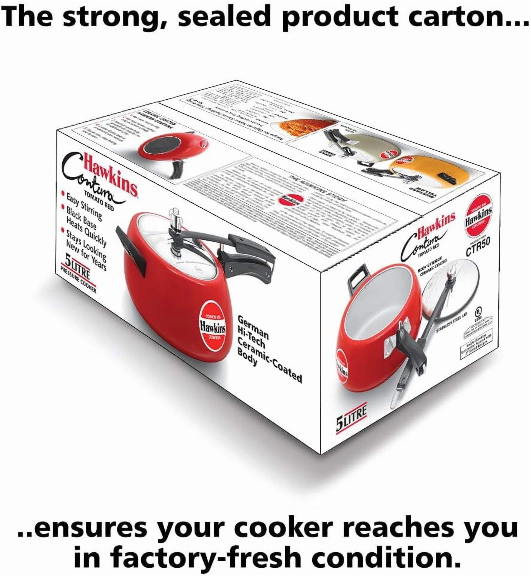 Hawkins 5 L Ceramic Stovetop Contura Pressure Cooker 5liter capacity, perfect for cooking meals for families or gatherings Features a German, high-quality, non-toxic ceramic coating on the exterior and base for enhanced durability Scratch and stainresistant ceramic coating ensures easy cleaning and maintains a new appearance for years Equipped with a stainless steel lid for added strength and longevity The black base heats quickly and retains heat effectively, optimizing cooking efficiency Unique rounded body design allows for easier stirring, better visibility, and simple food removal Stay-cool handles provide safety and comfort during use Recommended for use on gas stoves, making it versatile for various cooking needs Available in three vibrant colors: Tomato Red, Mustard Yellow, and Apple Green