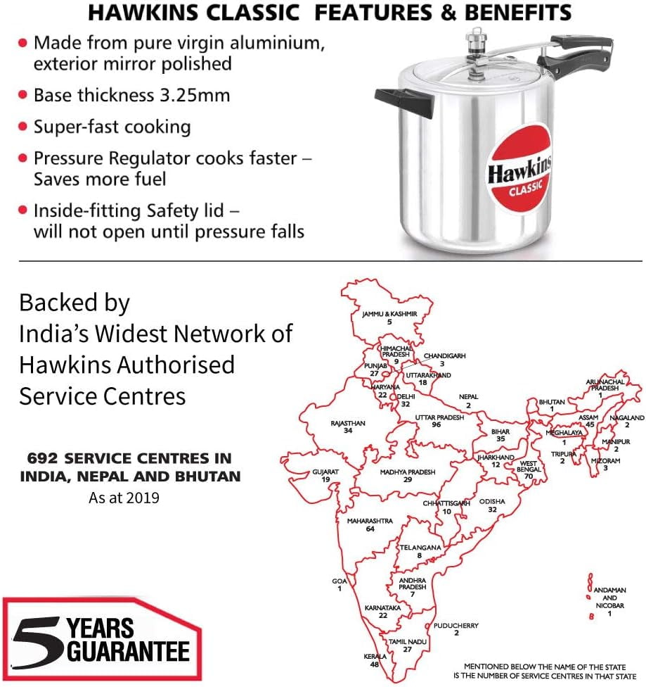 8 Liter wide body Pressure Cooker with Easy quarter turn Open & Close Lid Made from commercially pure, virgin aluminum; Mirror polished; interior and base matt finish Features a ‘goof-proof’ lid that seals from the inside like a jetliner door, ensuring greater safety Inside fitting lid opens only when pressure falls; Stay cool handles Pressure is regulated automatically to optimum levels for speed cooking; Shielded Safety valve, Long lasting gasket