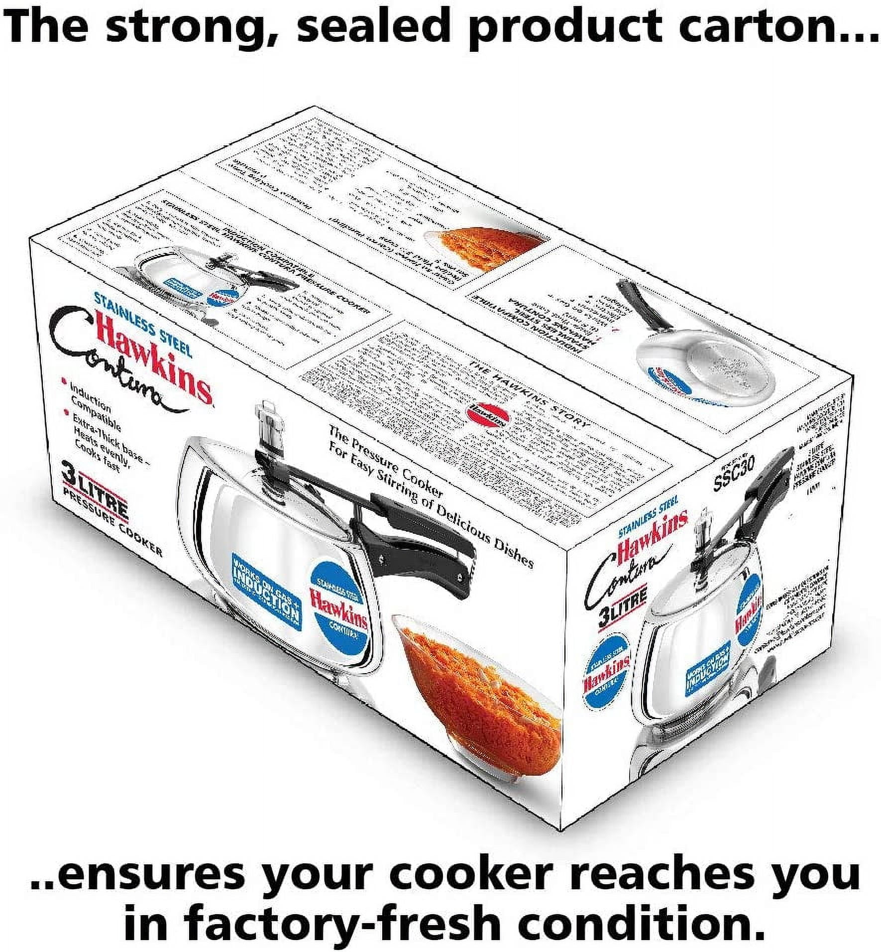 Hawkins Contura 3 L Stainless Steel Stovetop Induction Compatible Pressure Cooker Unique body design with rounded sides for easier stirring and better visibility Made from superior grade AISI 304 nonmagnetic stainless steel for durability Induction compatible with an external base of AISI 430 grade magnetic stainless steel 6.6 mm thick sandwich bottom ensures uniform heating and prevents hotspots Base remains flat and does not bulge over time Suitable for use on all domestic gas, electric, halogen, ceramic, and induction cooktops Included components: pressure cooker, lid, whistle, gasket