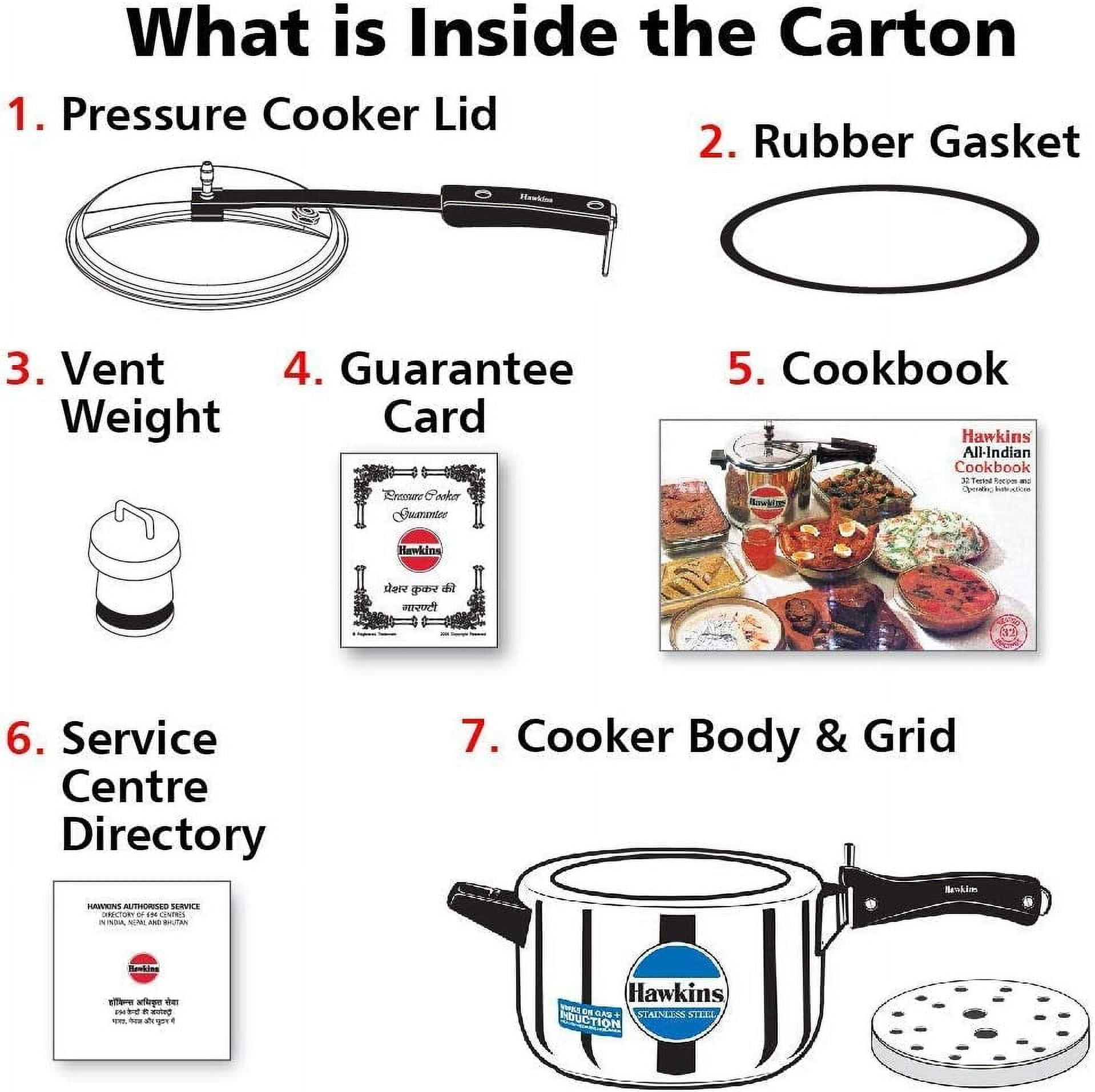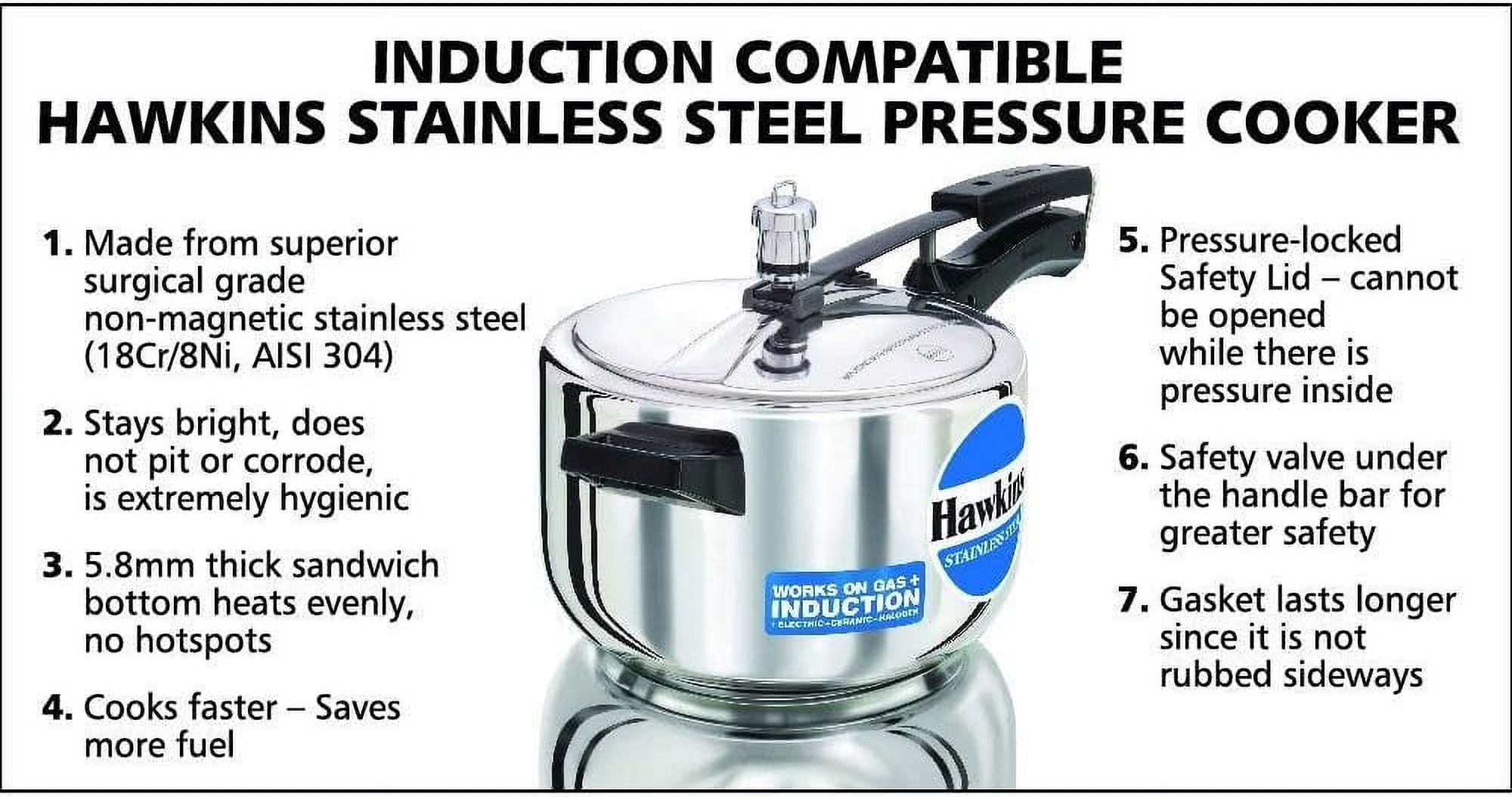 This Hawkins pressure cooker has a 100% stainless steel body and lid which stay bright, does not pit or corrode, is easy to clean, and is extremely hygienic. It is Suitable for gas, electric, ceramic, halogen, and induction cooktops. This pressure cooker is also equipped with a stay-cool handle. To ensure uniform heating, the bottom has a core of 5.81 mm thick base sheets of stainless steel. It is a great little Pressure cooker that can be used safely for light and deep frying and pressure cooking. Inside-fitting lid is pressure locked while in operation, patented pressure regulator prevents clogging of the steam vent, direction, controlled fingertip steam release, shielded safety valve.