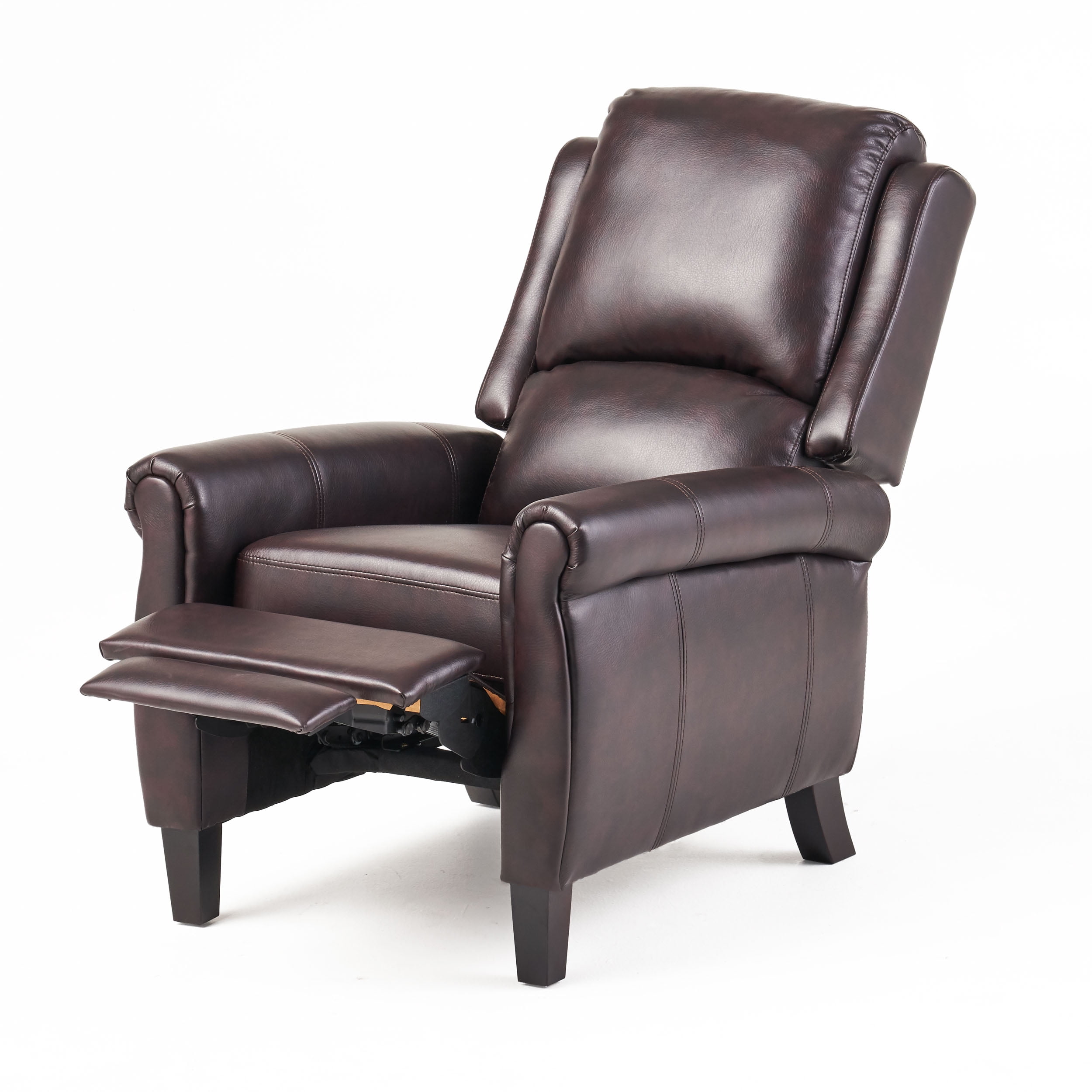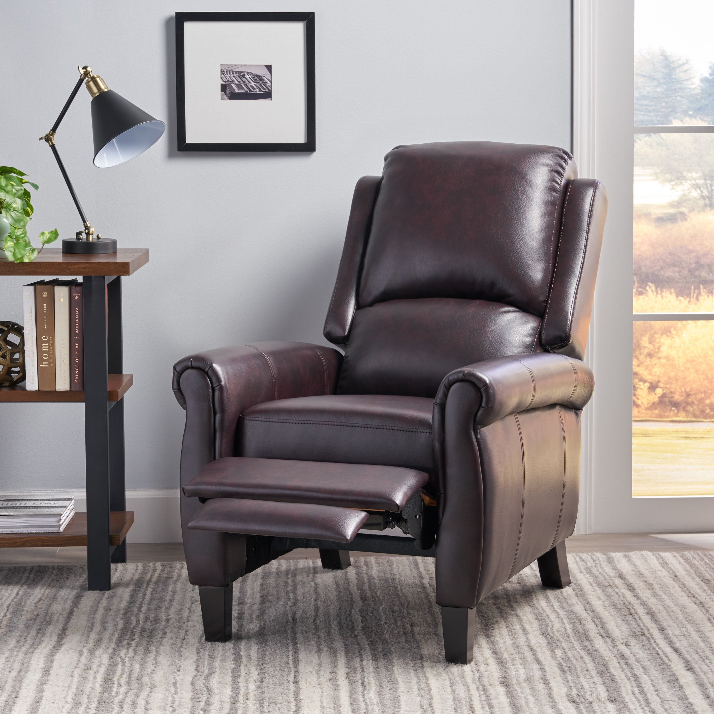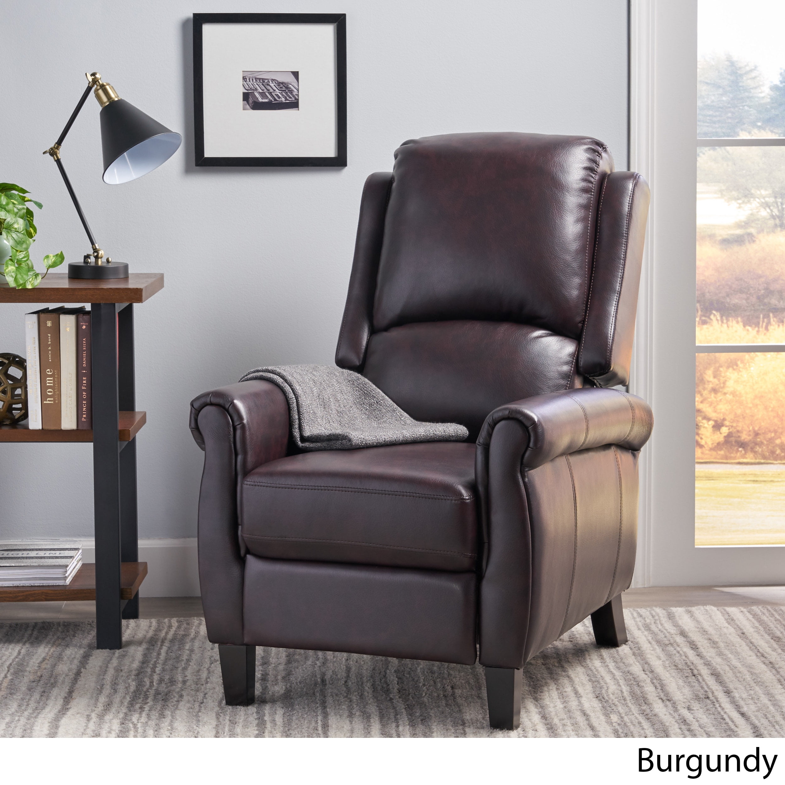 Sit back and relax with the Noble House Haddan recliner club chair. The smooth feel of the PU leather and versatile finish will be the perfect addition to any room. With an easy reline and footrest, this chair is a must have. Details: PU leather Wooden frame Burgundy or black Espresso finish legs Assembly required Weighs 63-pounds 43 inches high x 37 inches wide x 37.50 inches deep Reclines
