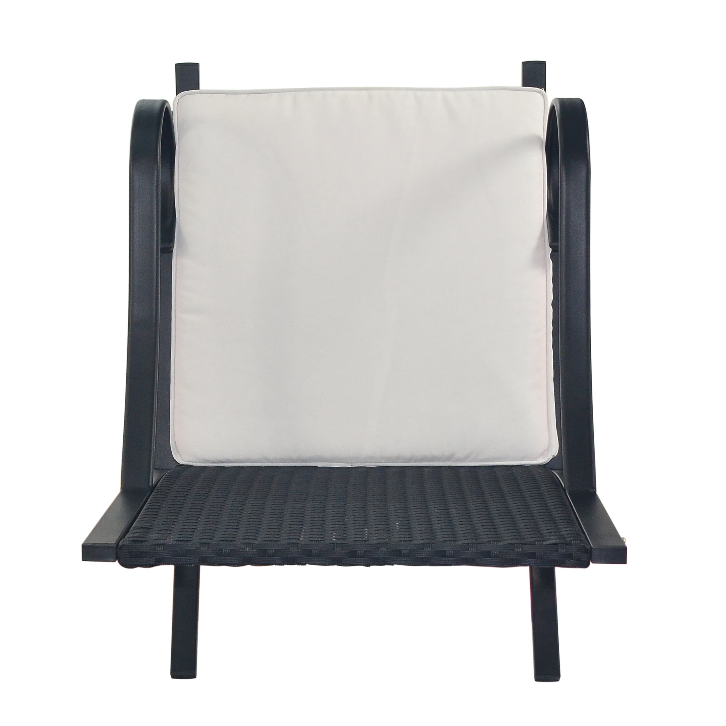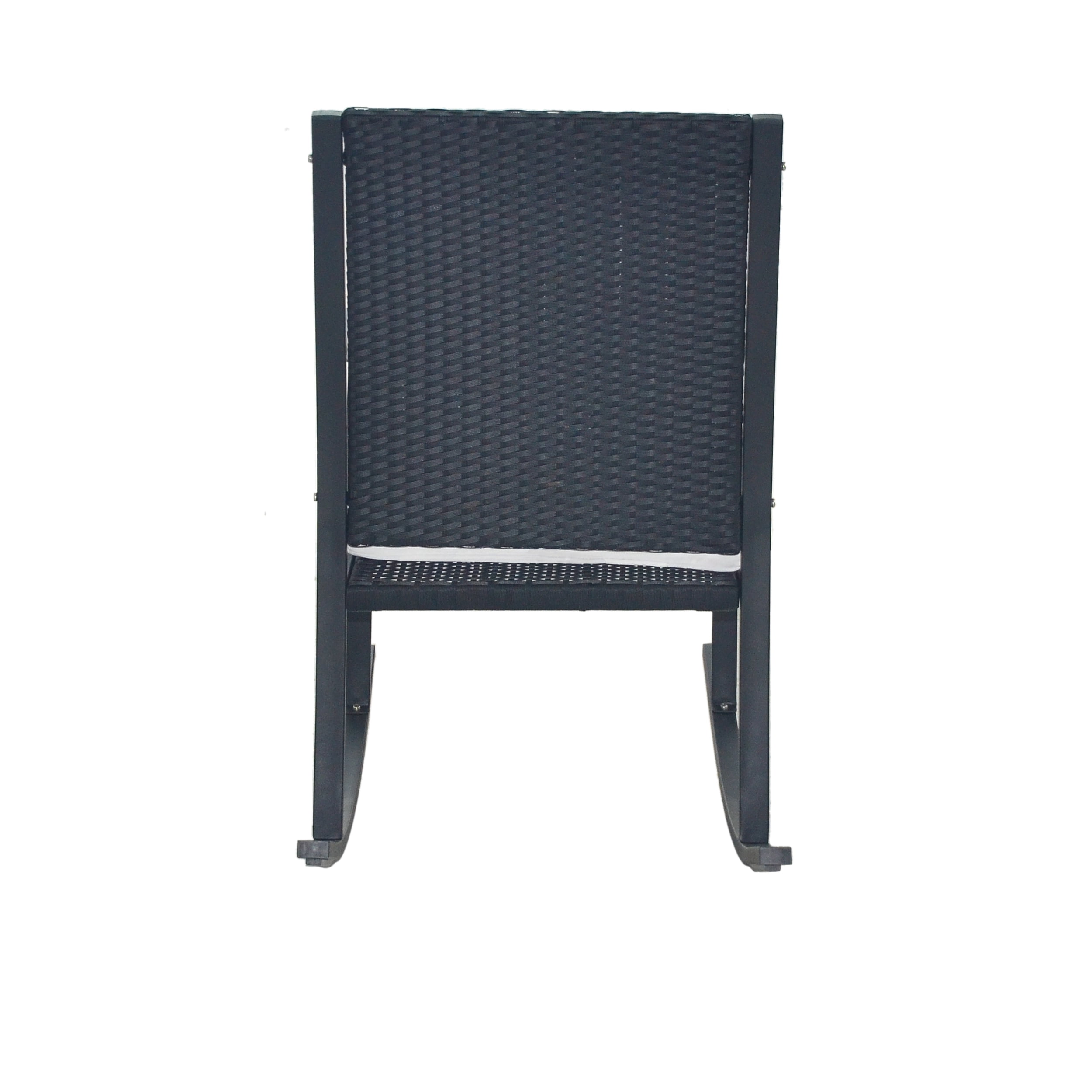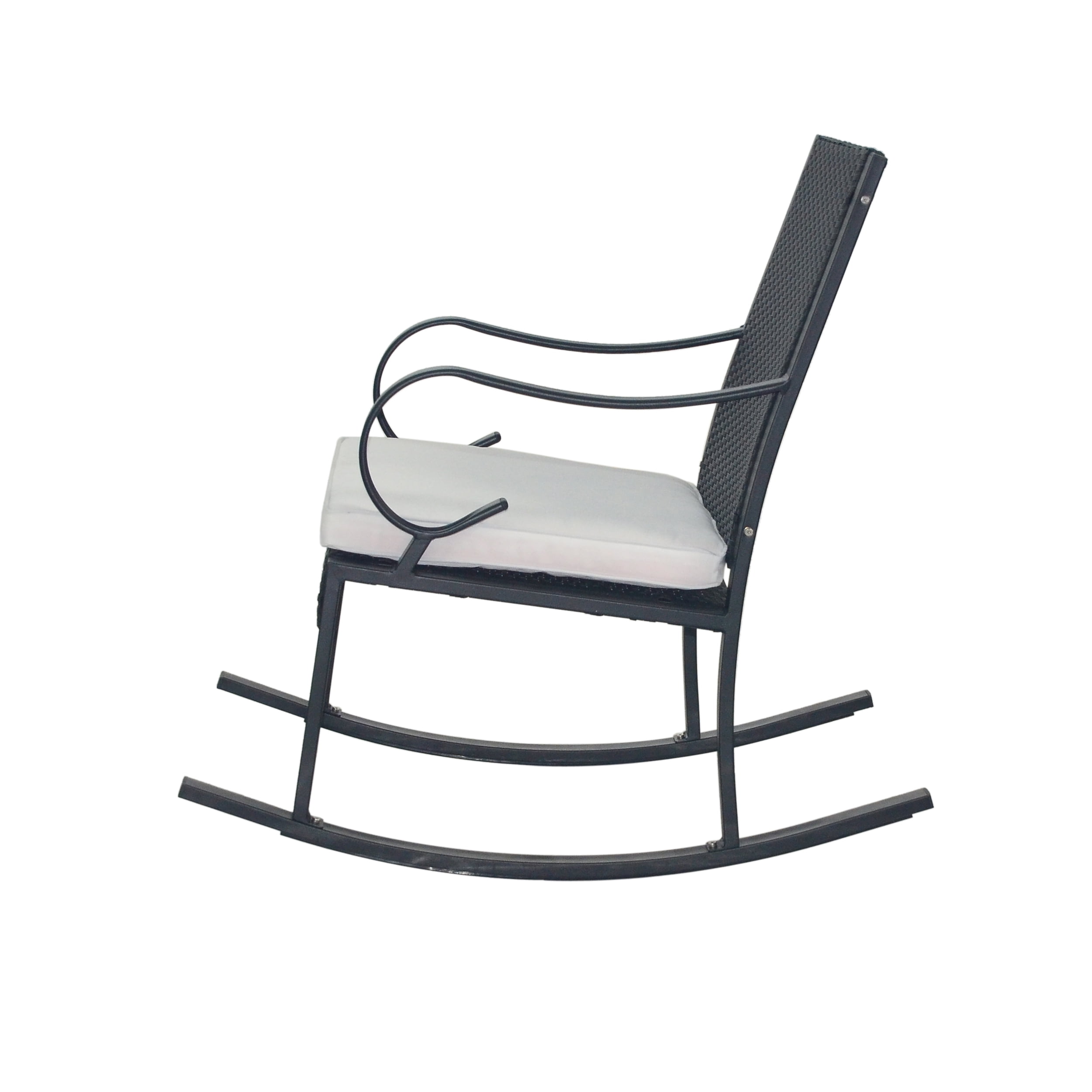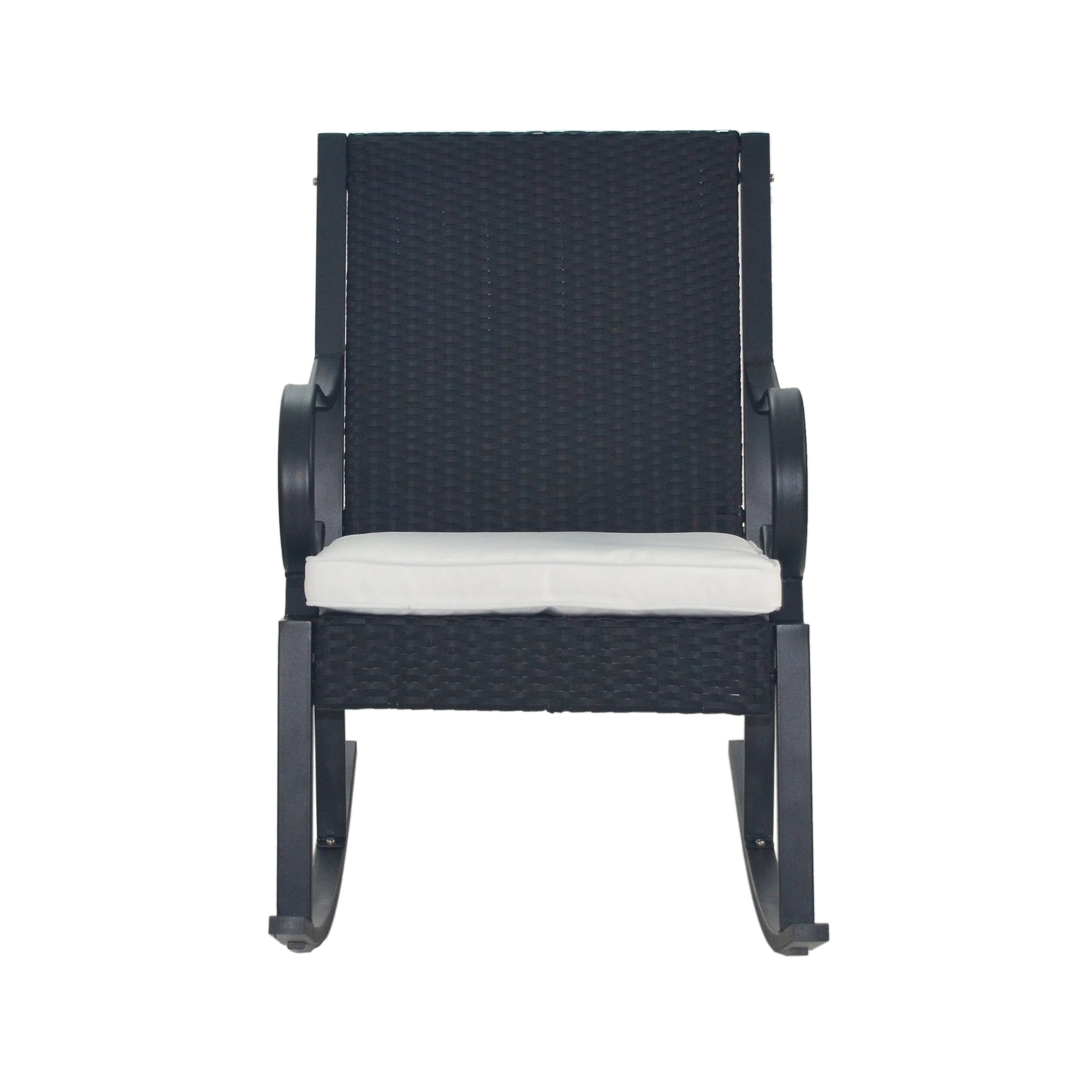 Includes: One (1) Rocking Chair Material: Faux Rattan Frame Material: Iron Cushion Material: Water-Resistant Fabric Multiple Color Options Assembly Required All Dimensions Exclude Cushion Measurements Dimensions: 40.25 inches deep x 24.75 inches wide x 41.00 inches high Seat Dimensions: 22.25 inches deep x 21.00 inches wide x 18.00 inches high Seat Cushion Thickness: 2.25 inches Arm Height: 29.00 inches Weight Capacity: 400 lbs