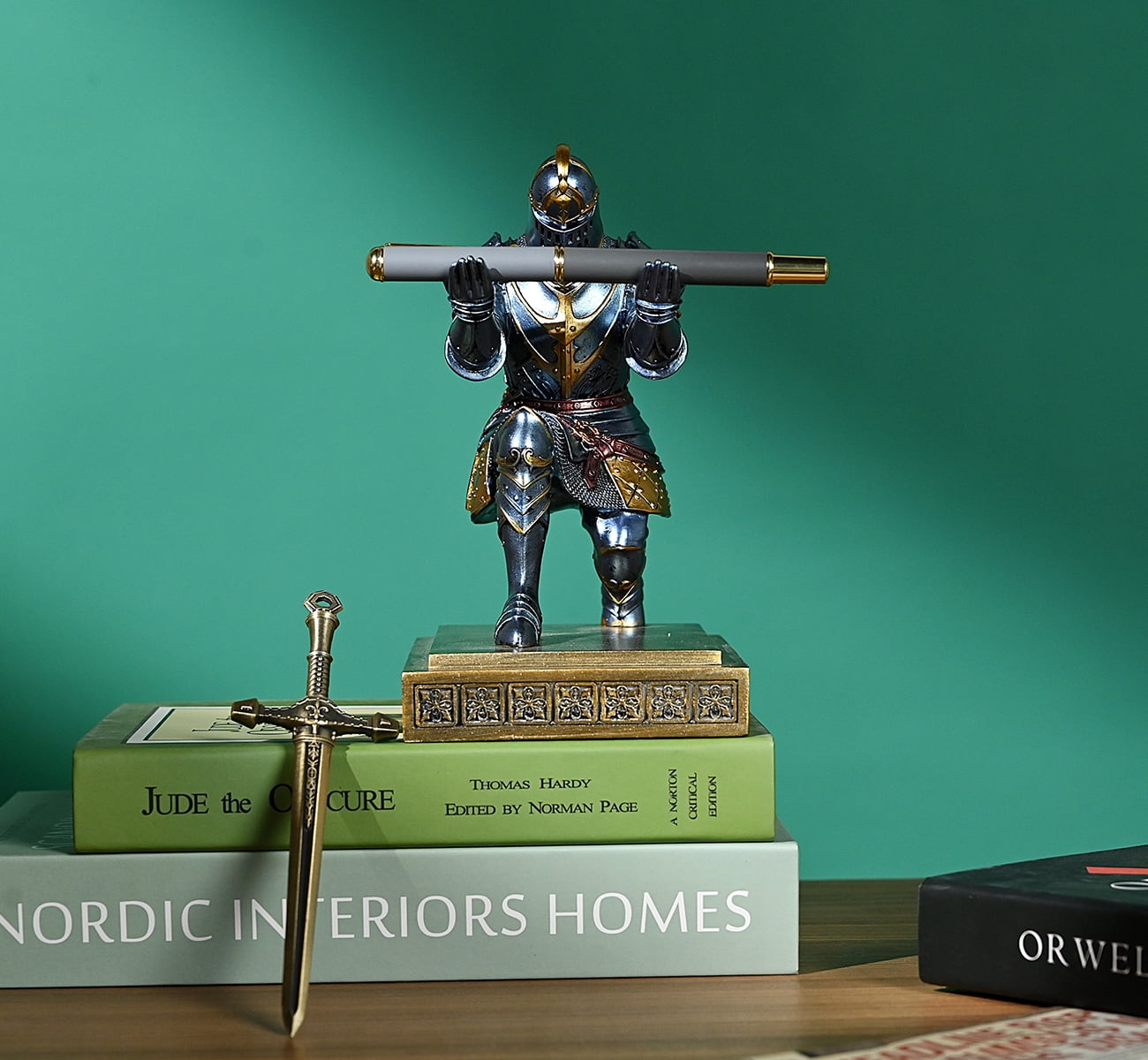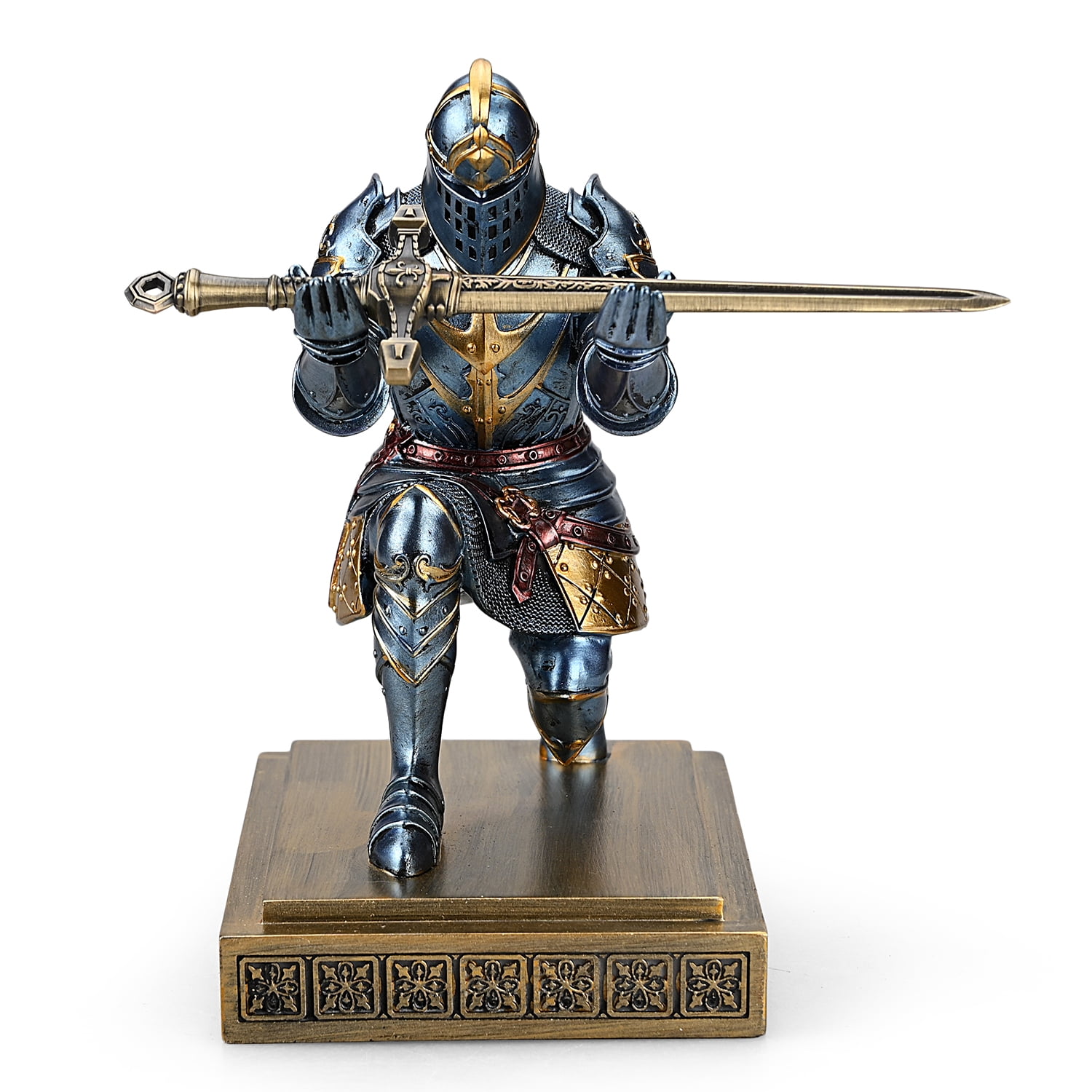 HDMbigmi King’s Guard Knight Pen and Pencil Holder with Fancy Sword, Blue Personalized pen stand designed to hold your pen or other small items Features a knight design that adds a unique touch to your desk Conveniently keeps your pen accessible for quick use Great as a decorative piece for your office, study, or living room Perfect gift for birthdays, Christmas, New Year’s Day, or as a company prize Made from durable polyresin for long-lasting use Dimensions: approximately 6.06 x 4.33 x 7.48 inches Weight: about 2.40 lbs Includes a fancy sword accessory for added flair