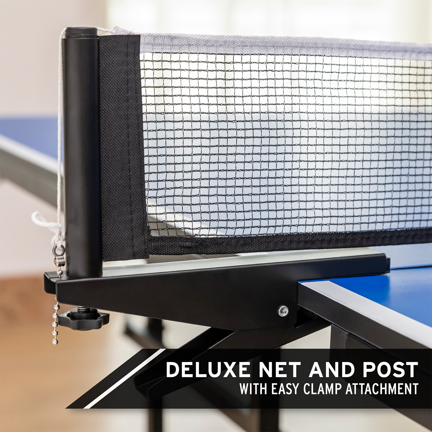 HEAD Collapsable Ping Pong Table with Net, 108 x 60 x 30 inches, Blue Enjoy endless competition and fun with the Match Point ping pong table Two-piece seamless 12-millimeter surface folds in half for easy storage Rust-resistant powder-coated steel frame ensures durability and long-lasting use Equipped with caster wheels for easy mobility and secure lockdown when stationary Clamp-on table tennis net is simple to set up for immediate gameplay
