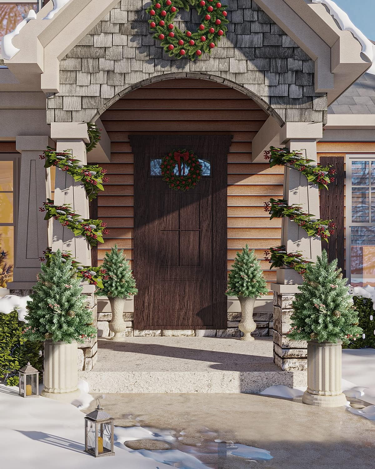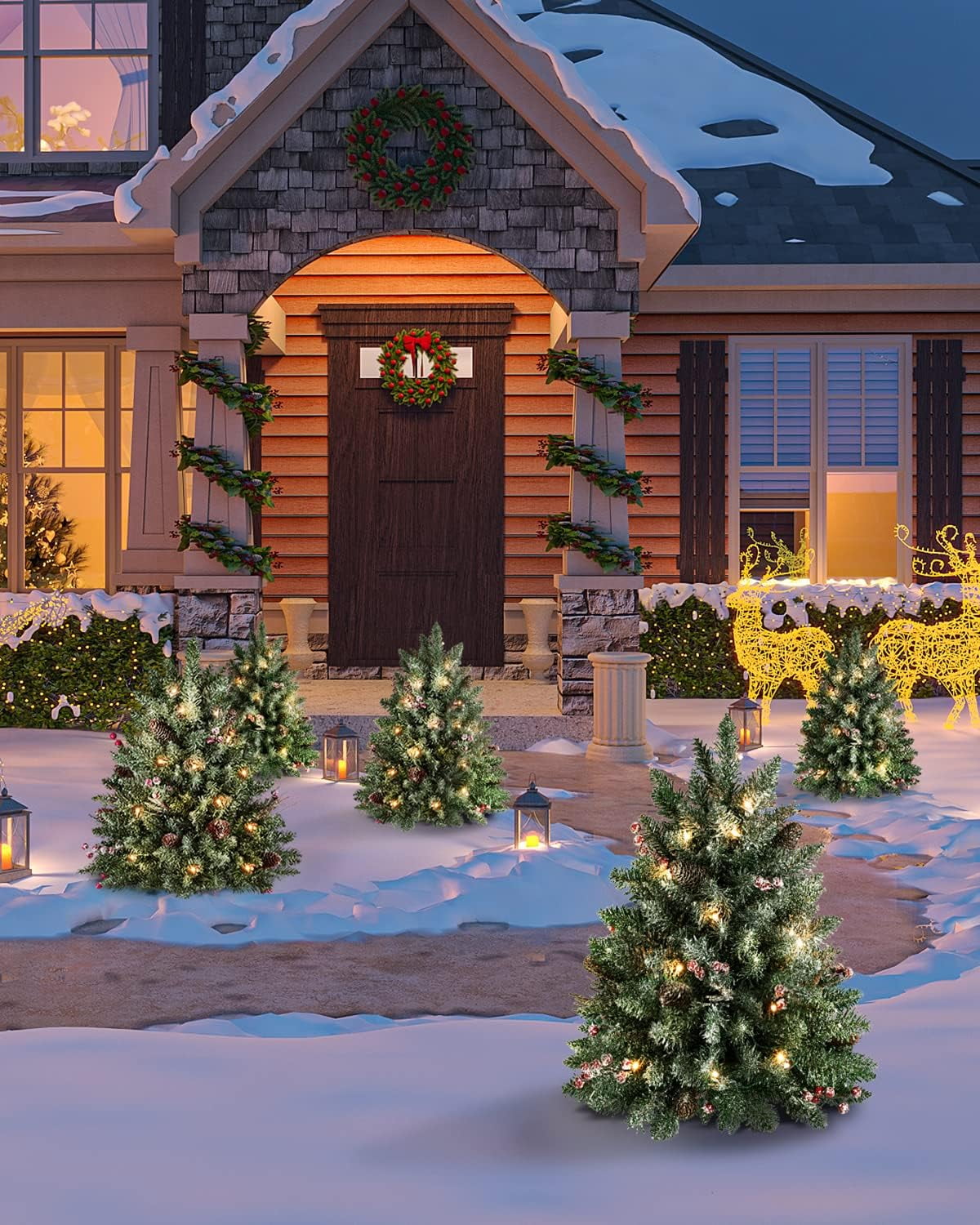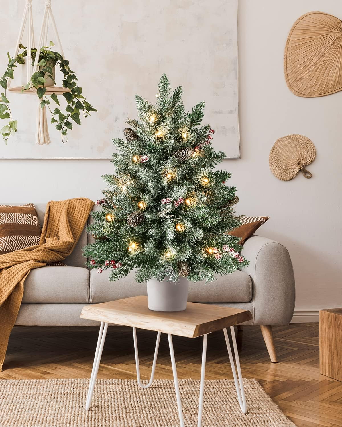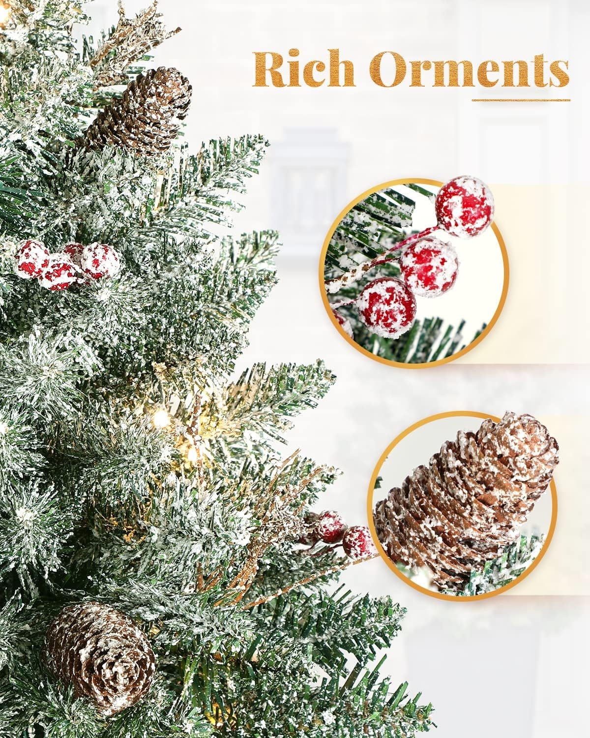 ????2FT Lifelike Entrance Christmas Tree: ????White Snow firmly covered in the surface of flocked mini christmas tree with 90 tips life-like branches, which make it not only looks more real and lush but also adds charming character. Perfect for you create your own winter wonderland. ????6 Hour Timer & Battery Box: ????You can set the tree’s timer for 6 hours, the lights will turn themselves off for your convenience! 3AA battery operated ( battery not included). Using this tree is simplified with battery box that eliminate the need for plug-in outlets, so you can stake them anywhere. ????Ideal Sizing for Indoor Outdoor: ????Tree is 2 ft tall, 18 in diameter at the base and cone is 7 in long. It’s perfect size to set in a gold urn base for indoor use or stuck in the dirt for outdoor use. How enjoyable you use this attractive tree to decorate your home or garden. ????Rich Ornaments & Durable Quality: ????The christmas tree neatly trimmed with 50 warm white LED lights, 6 pine cones, 6 groups of red berries will create a beautiful luxurious look. It will last many holidays with water-resistant materials, non-allergenic PVC needles, and a durable cone. ????Buy with Confidence: ????Our christmas tree is built to last and is extremely easy to pack away and store during the off-season. In order to satisfy our customer, we’ll support you in 24 hours with any questions. . .